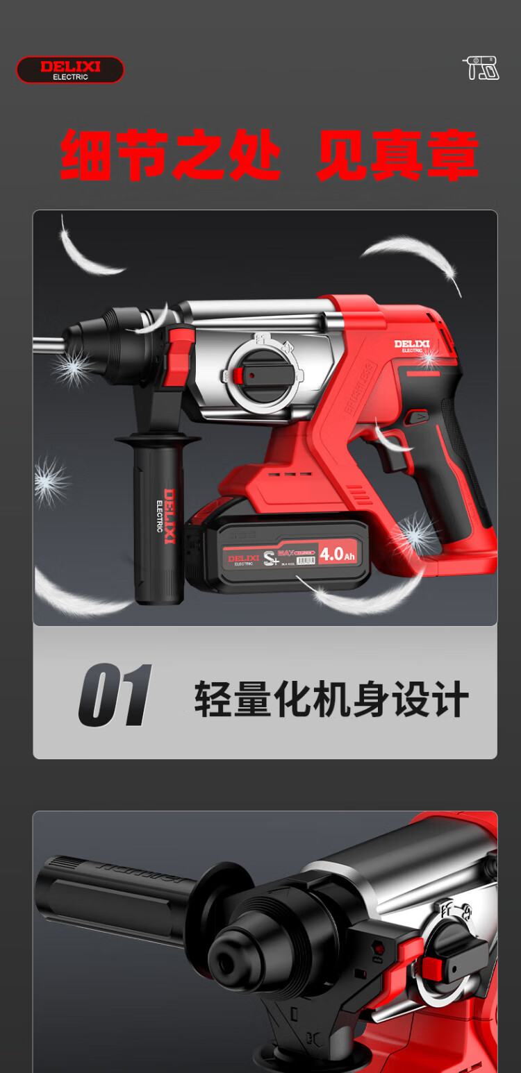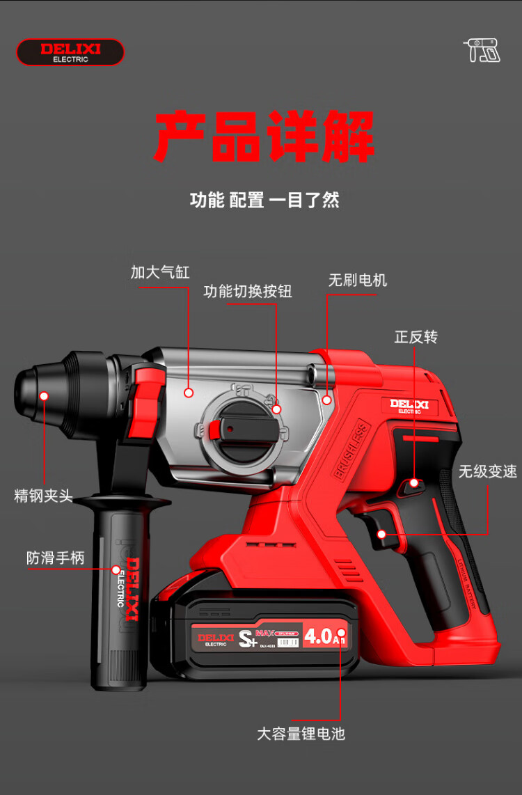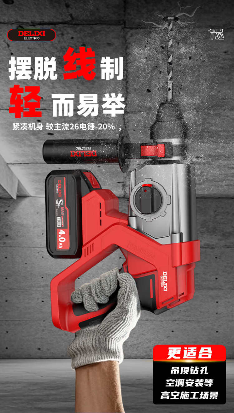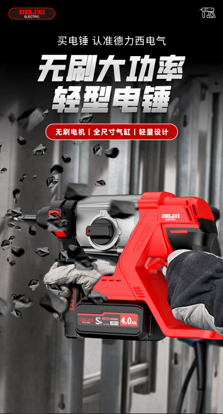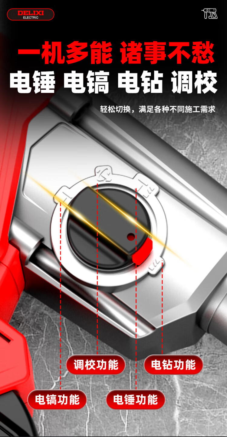 Delixi Electric 21V brushless lithium battery rechargeable electric hammer electric pick impact drill household multi-functional three-use high-power power tool