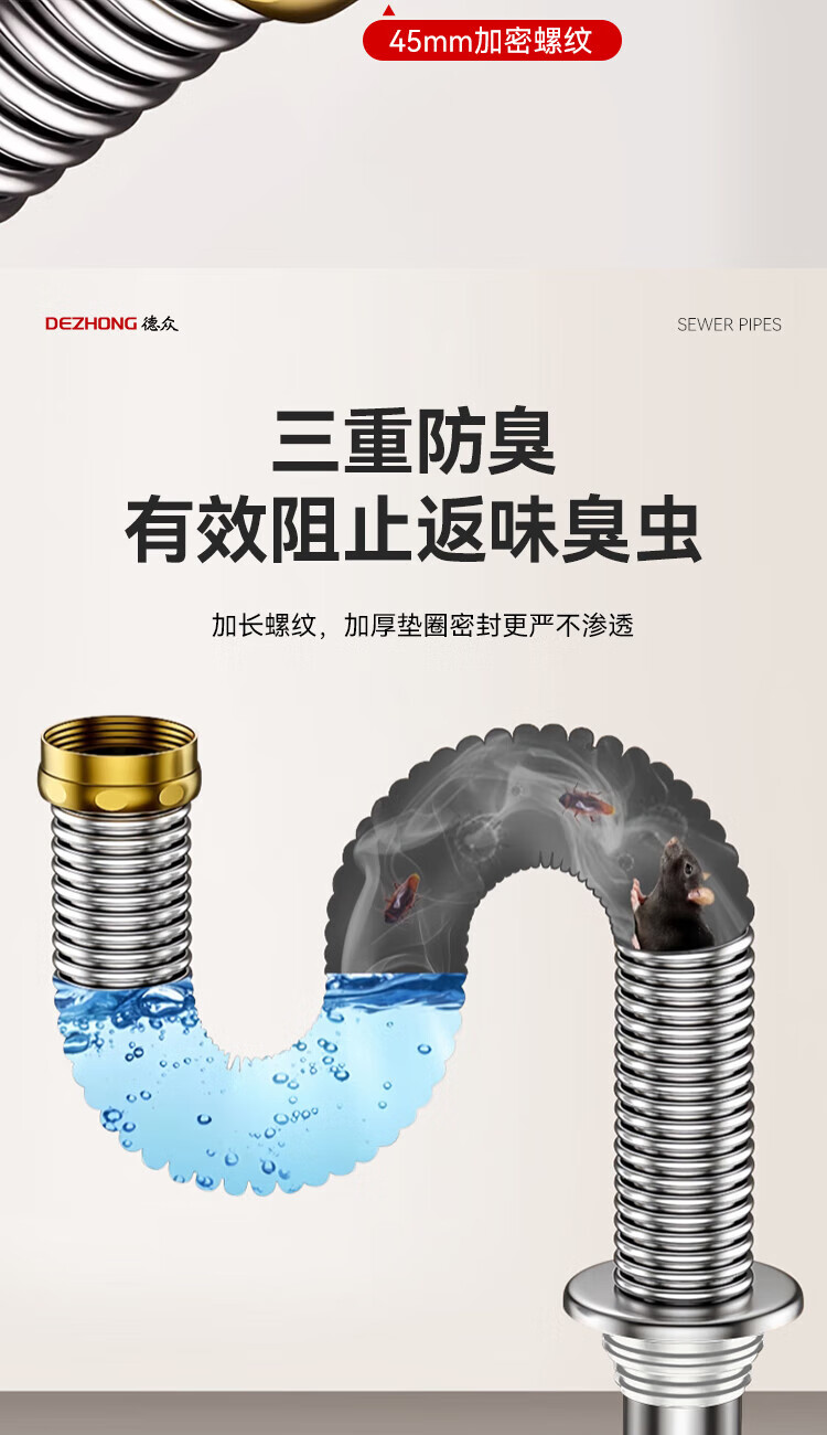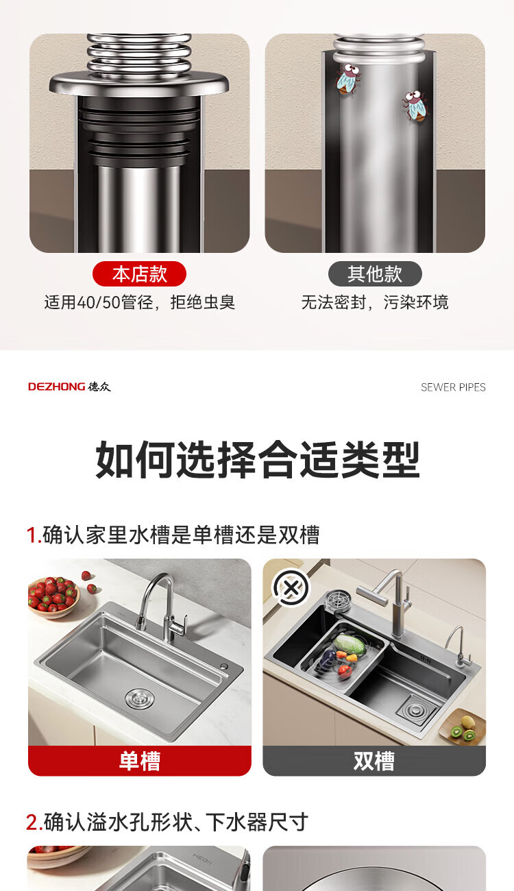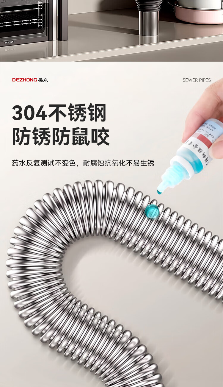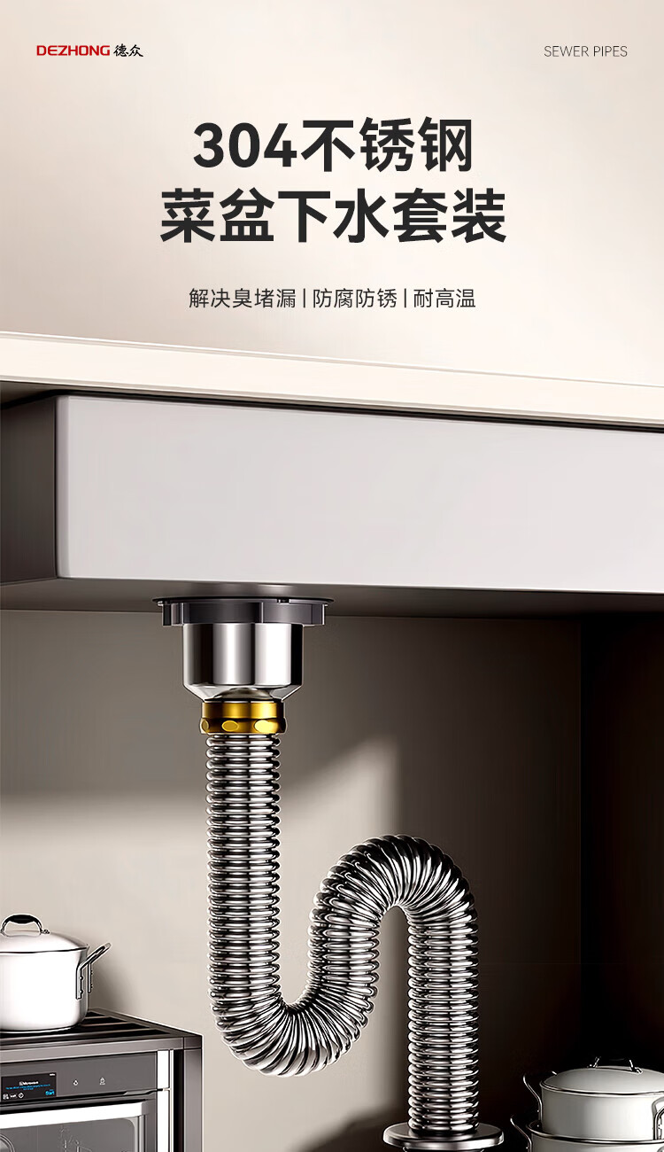 Dezhong kitchen sink drain pipe complete set, anti-odor and hot-resistant kitchen drain pipe, single sink dishwashing pool 304 stainless steel drain pipe accessories P9