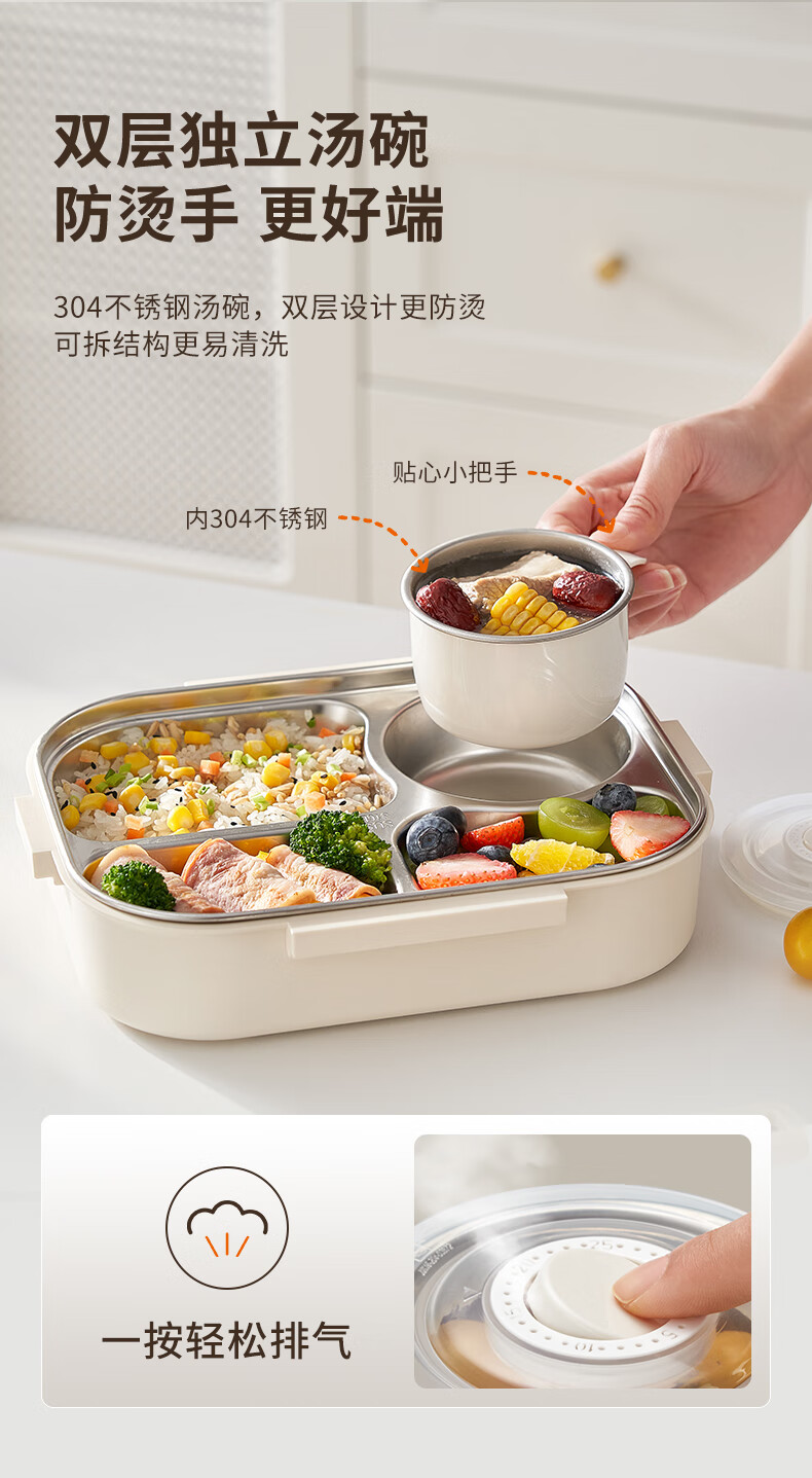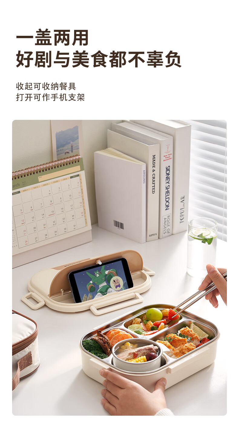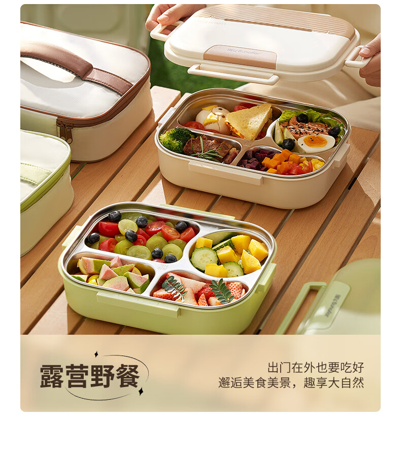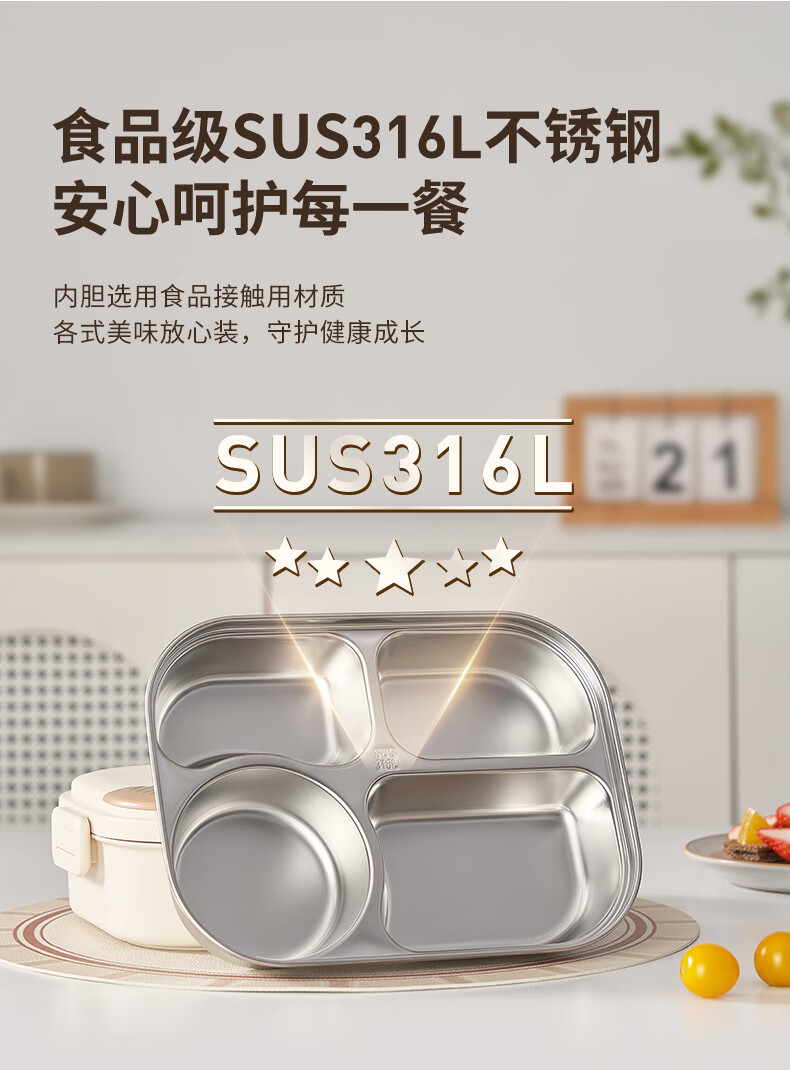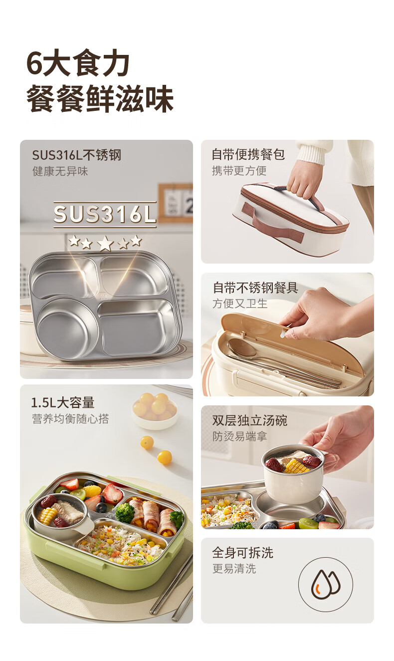 Joyoung 316L lunch box for students and office workers with chopsticks and spoons large capacity four-compartment lunch box 1500ML white
