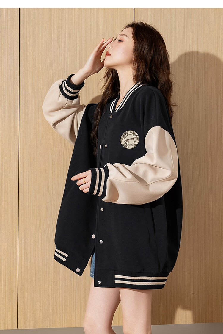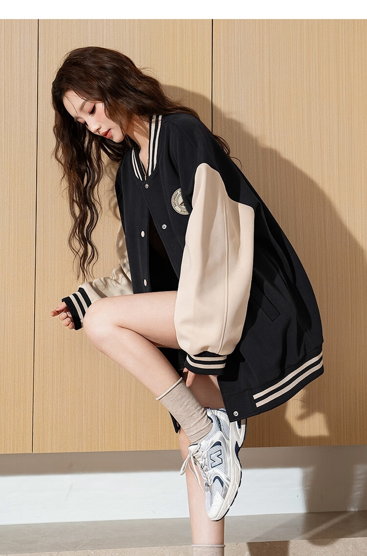 TonLion 2024 Women's Left Chest Woven Label Sleeve Color Block Baseball Jacket Black L