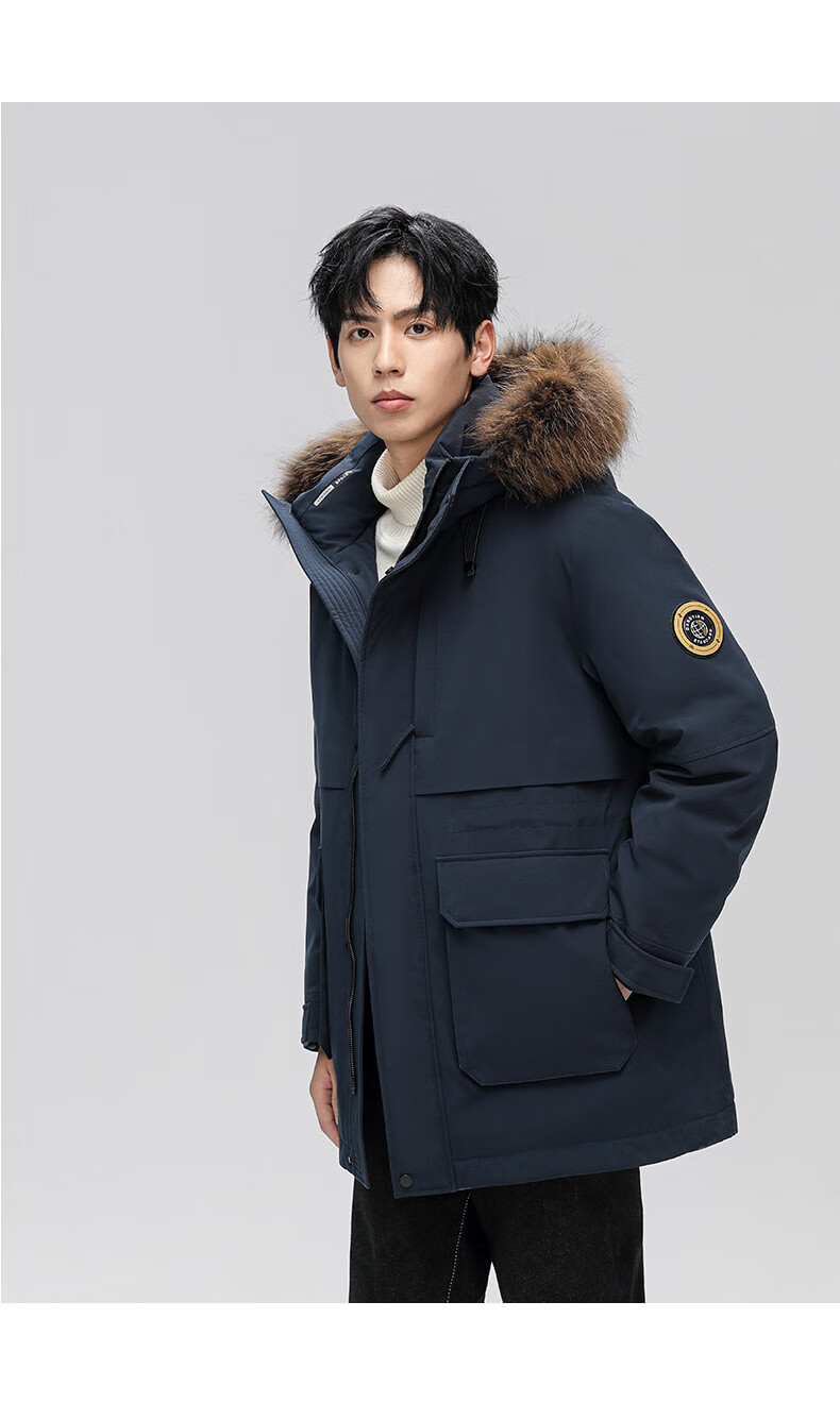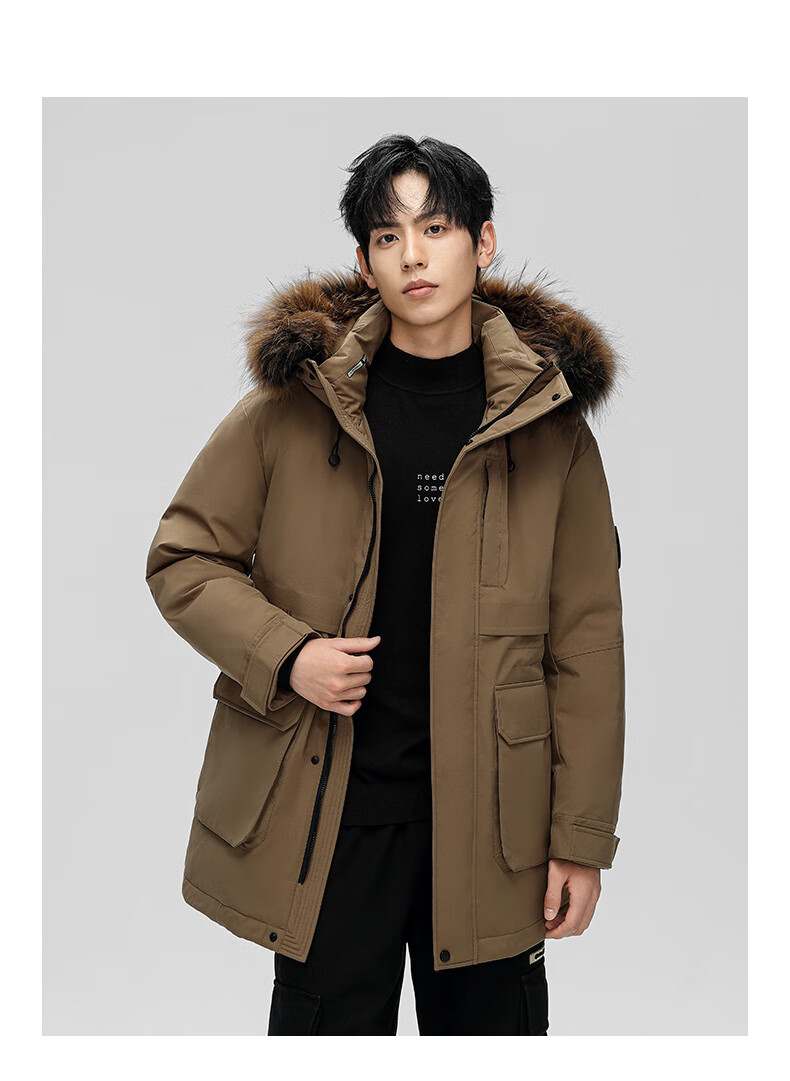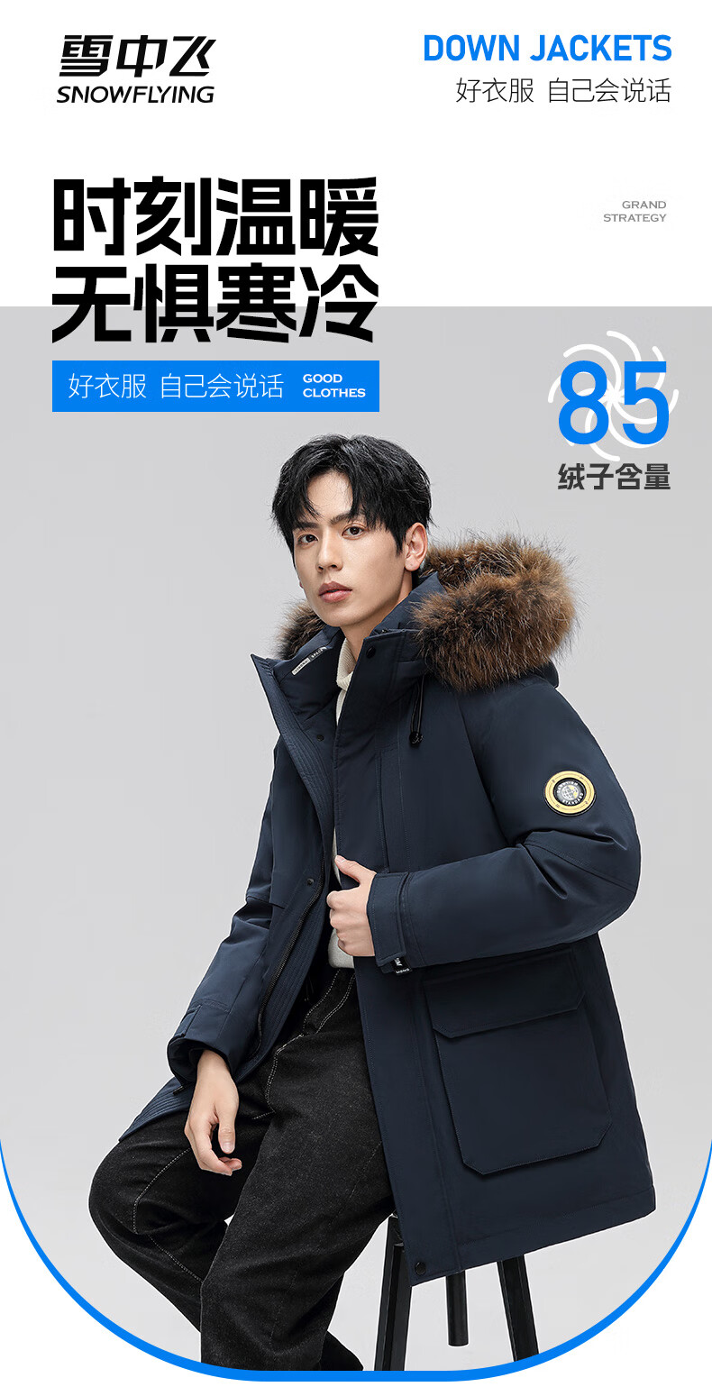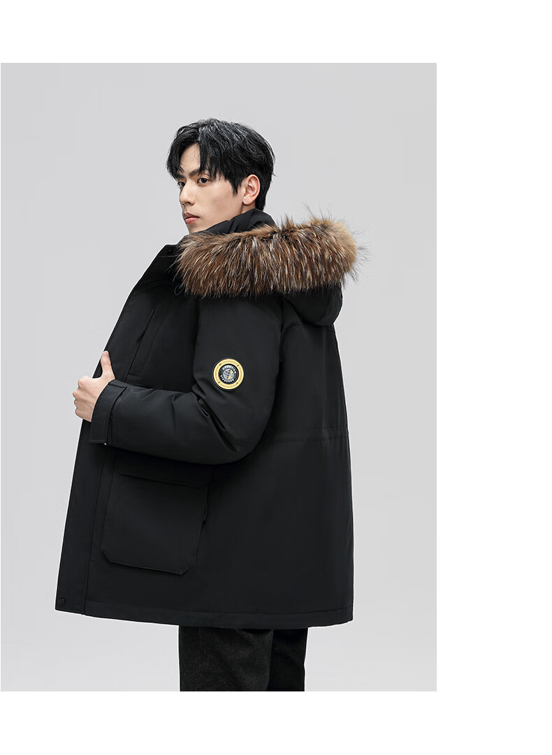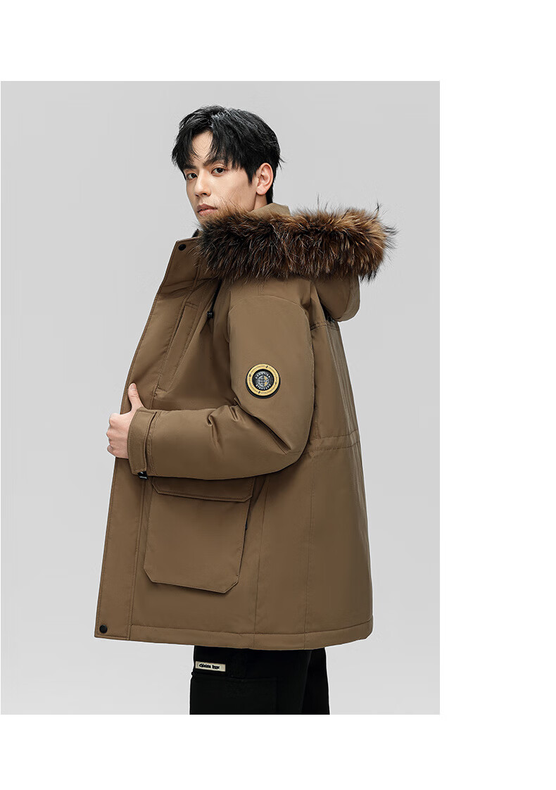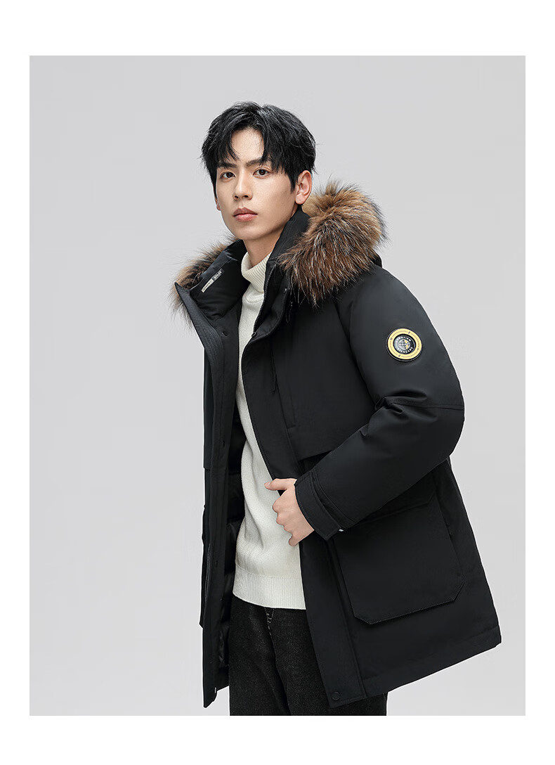 Flying in the Snow Goose Down Jacket Men's Medium Long Hooded Large Fur Collar Thickened Workwear Fashion Casual Business Winter Jacket 185