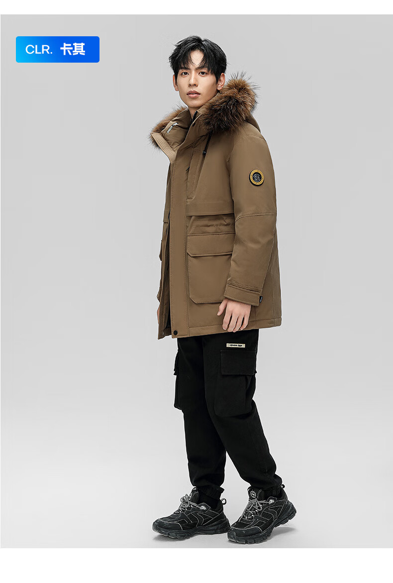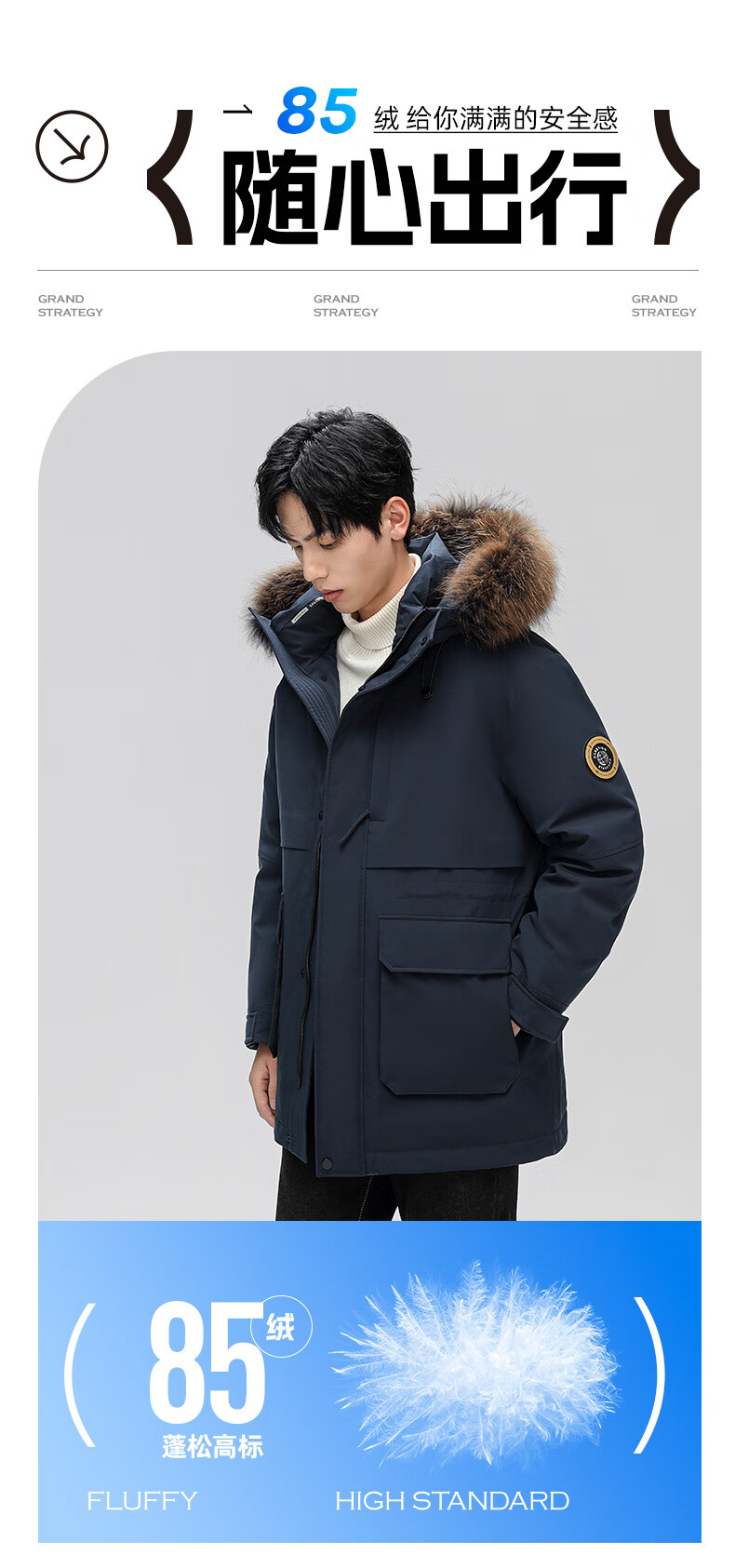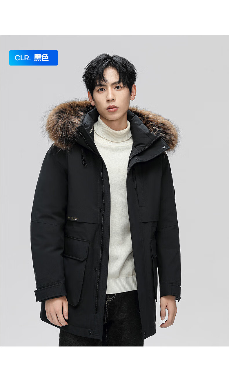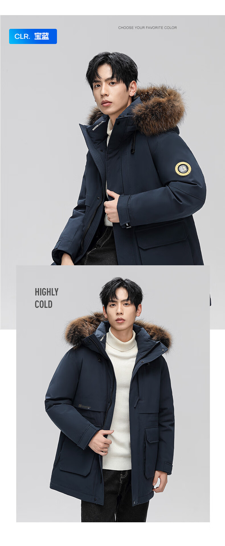 Flying in the Snow Goose Down Jacket Men's Medium Long Hooded Large Fur Collar Thickened Workwear Fashion Casual Business Winter Jacket 185
