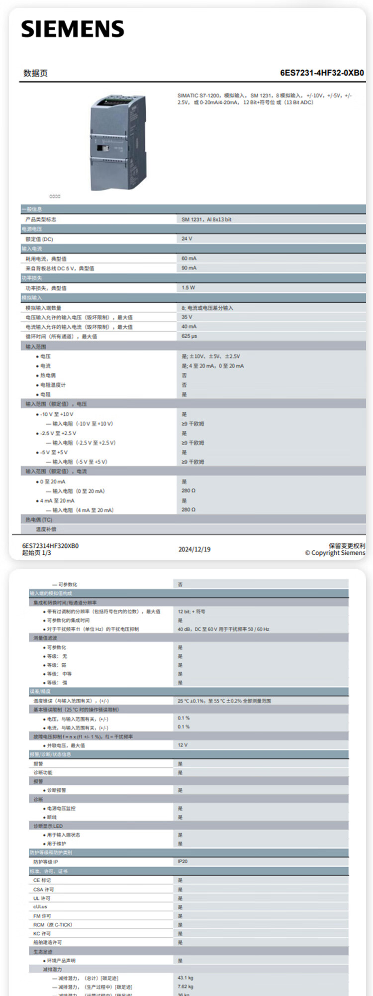 Siemens 6ES7231-4HF32-0XB0 PLC module controller SIMATIC S7-1200, analog input, SM 1231