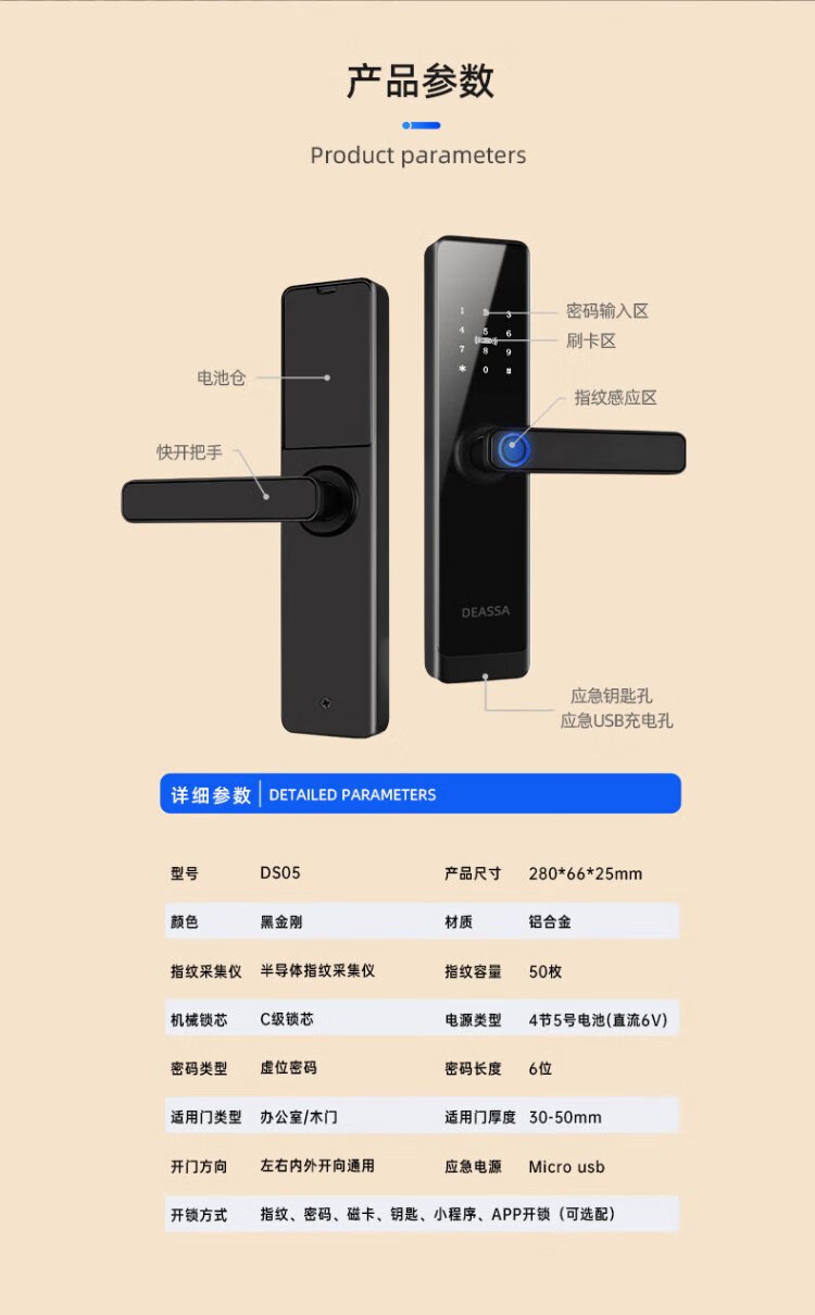DEASSA Fingerprint Lock Special Smart Lock for Wooden Doors Indoor Door Lock Hotel Password Lock Mini Program Unlocking DS05TT