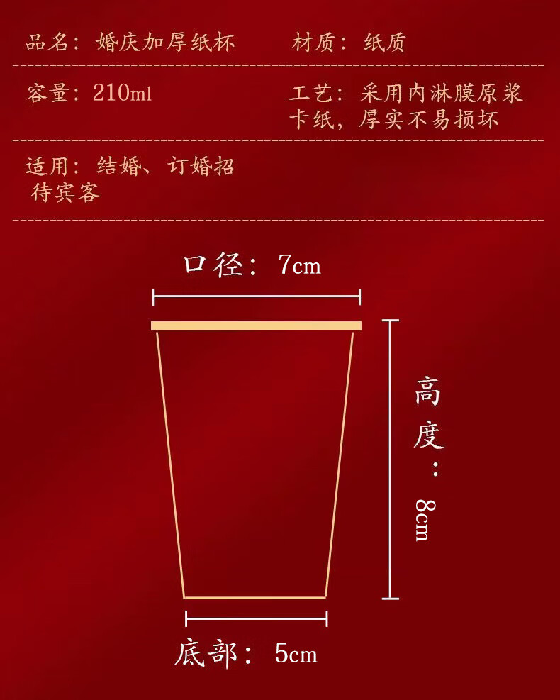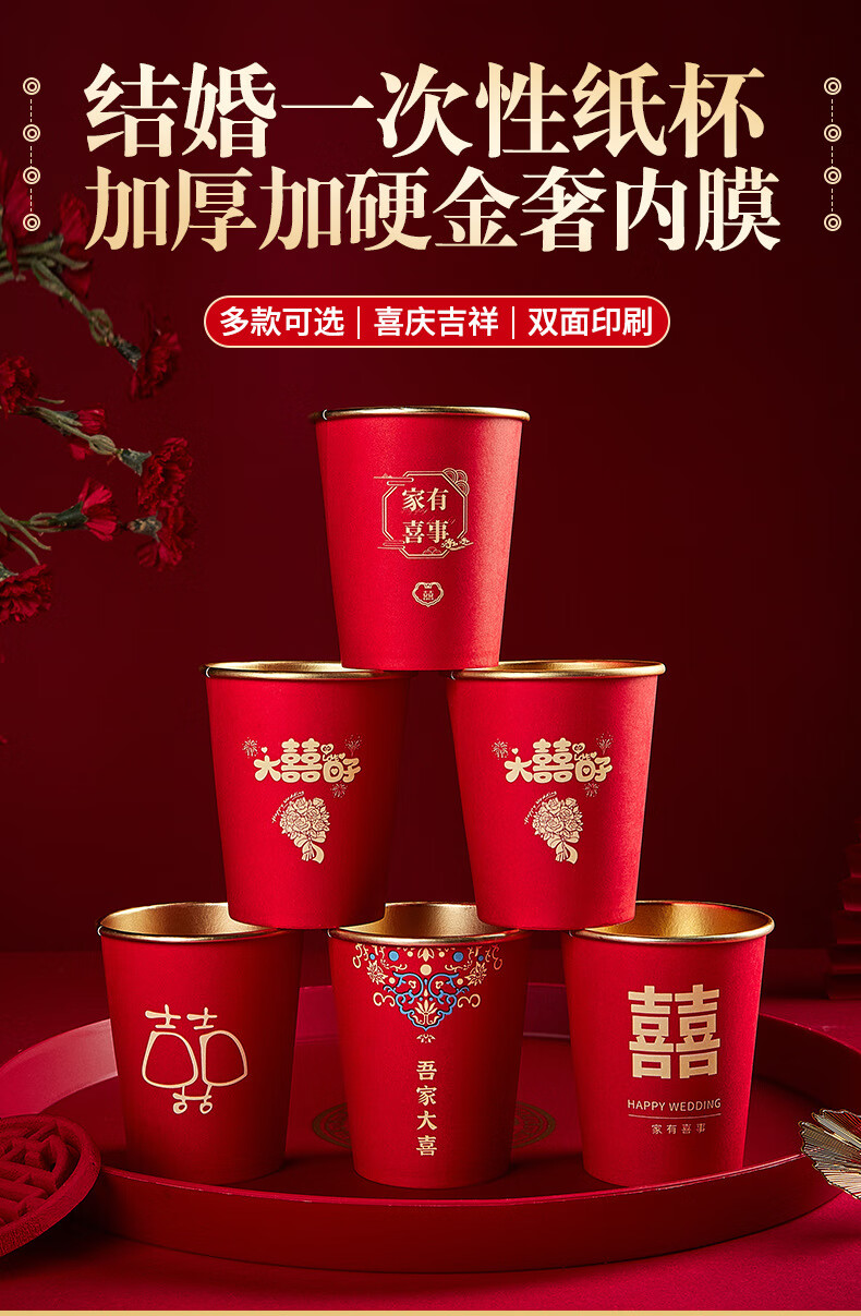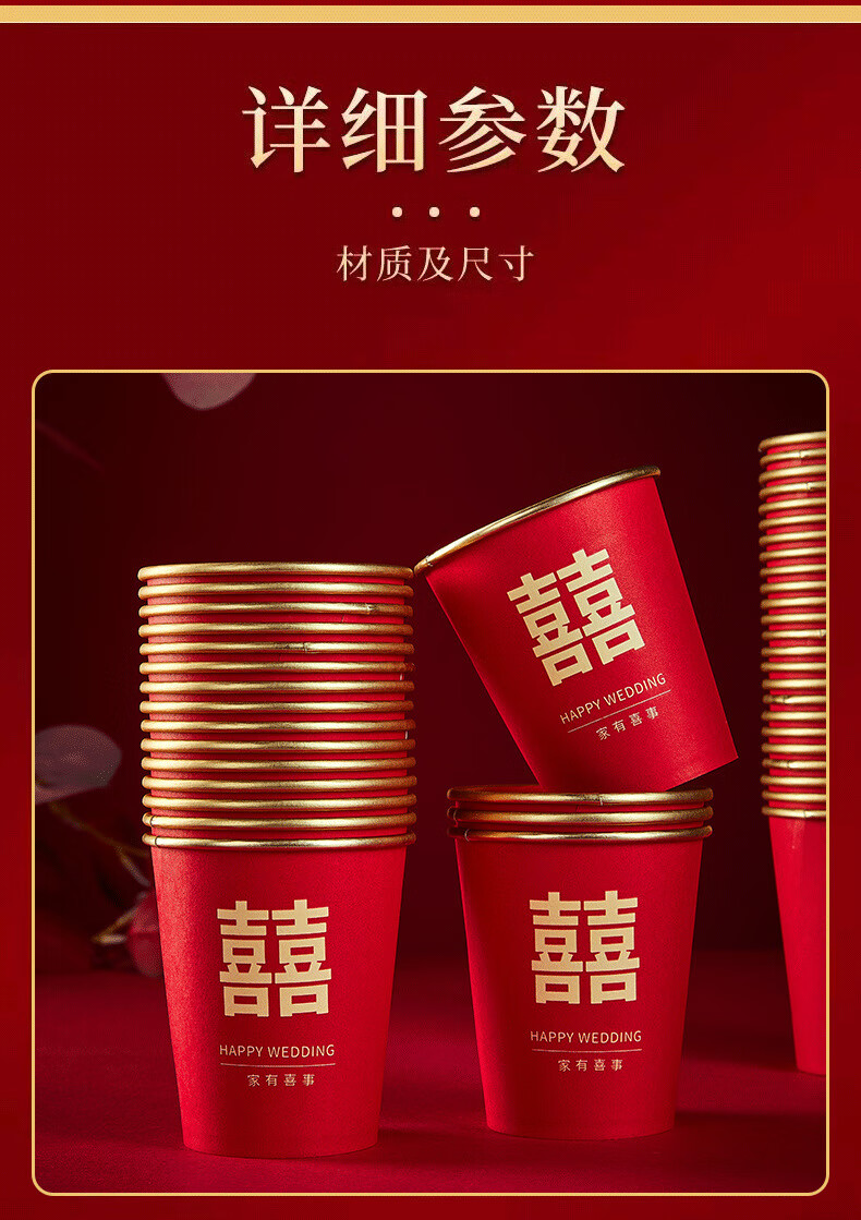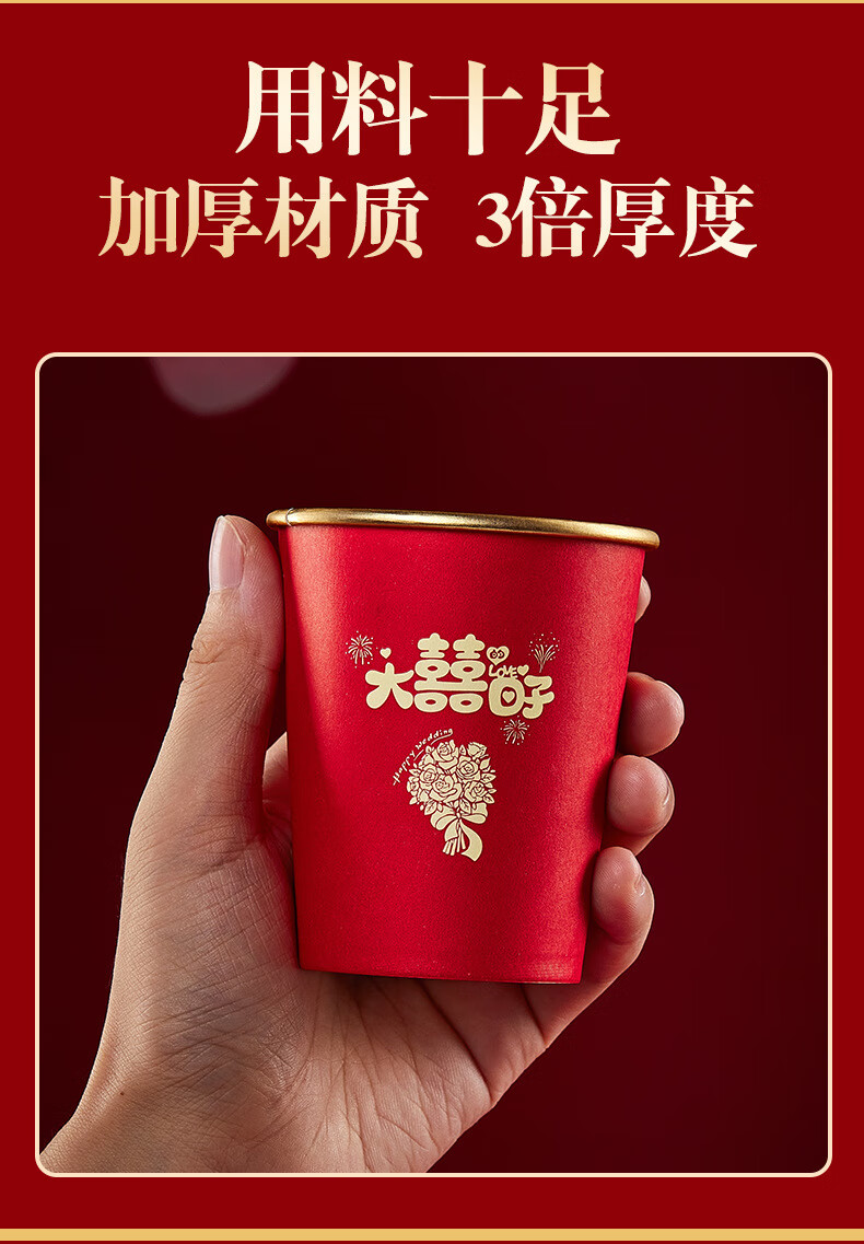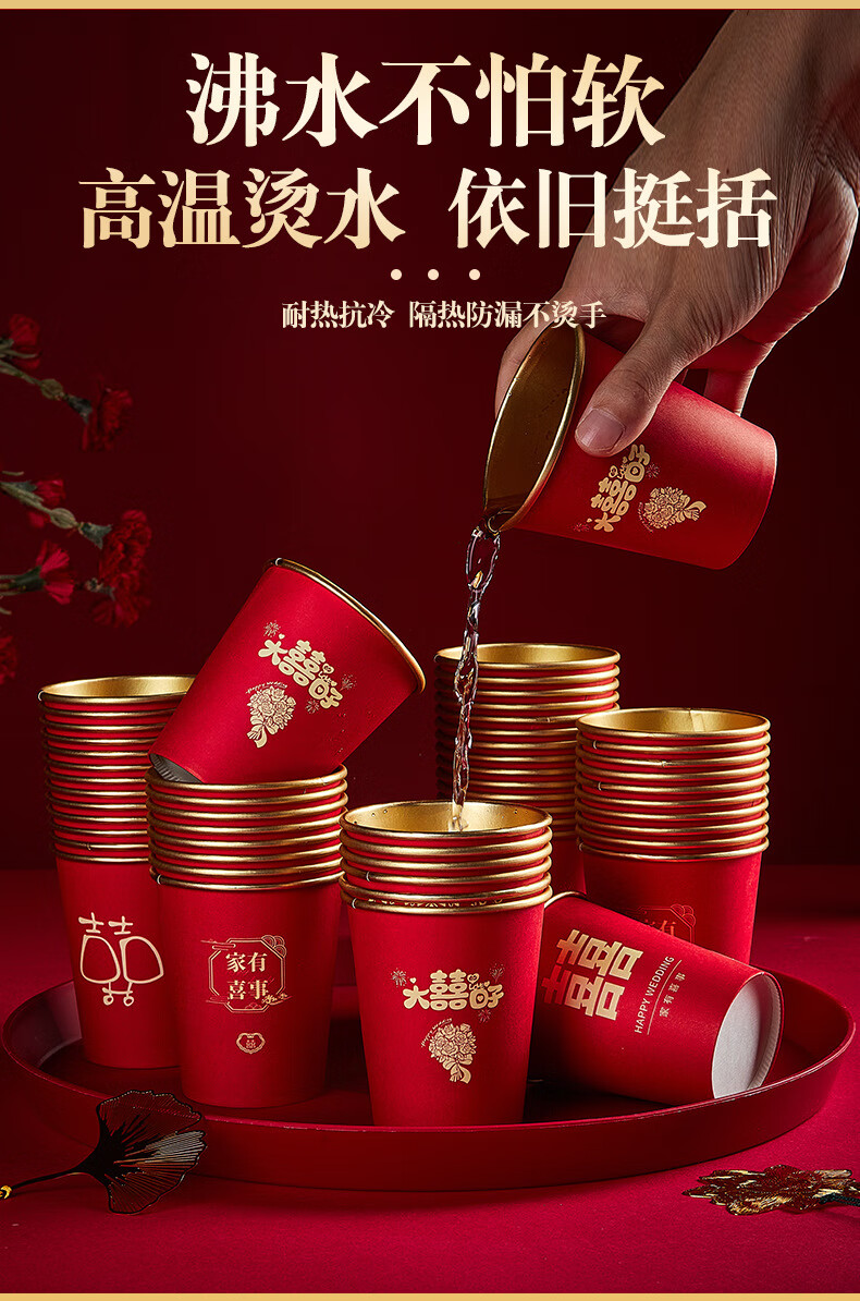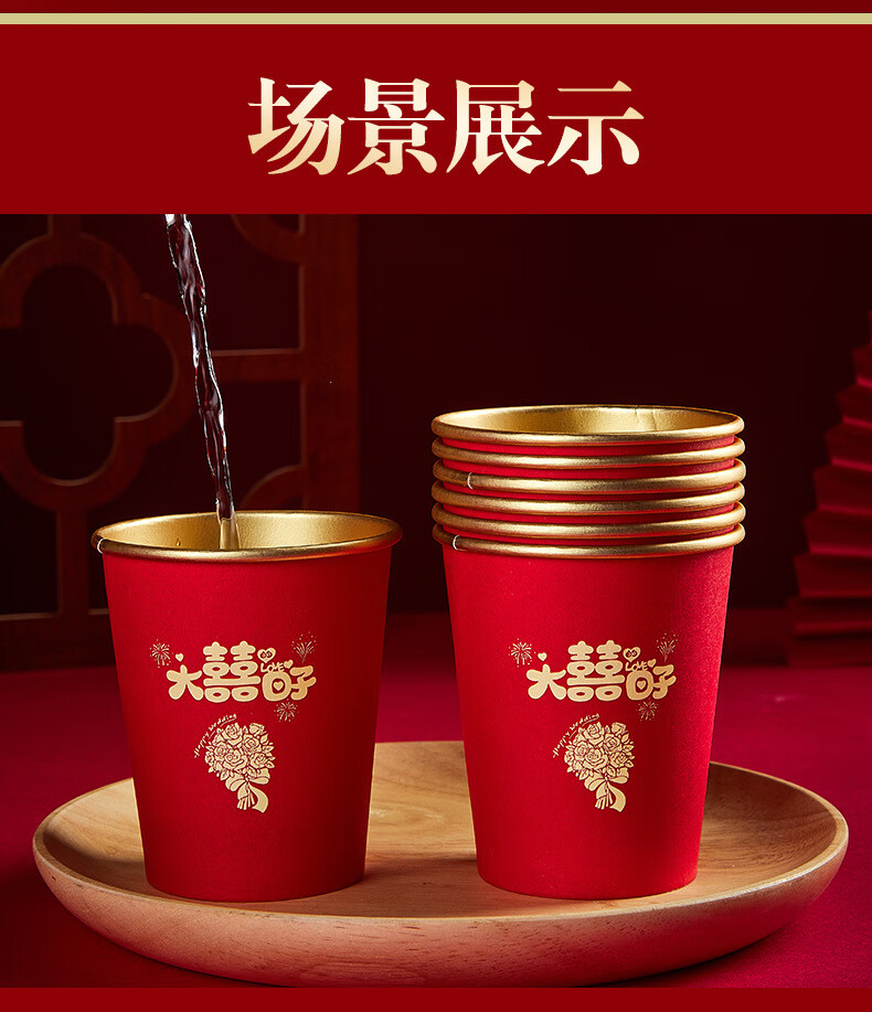 PINYU disposable cup wedding paper cup gold foil thickened anti-scalding red wedding cup decoration medium size 200ml 50 pieces