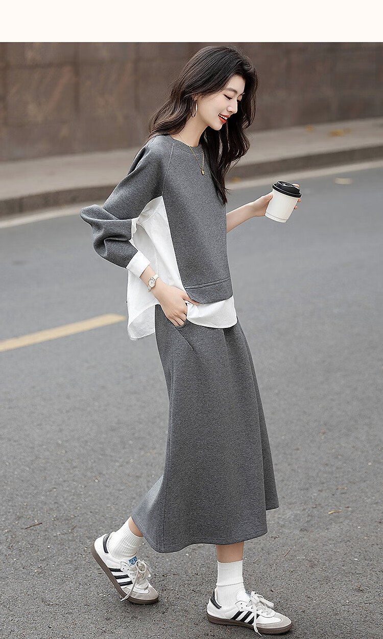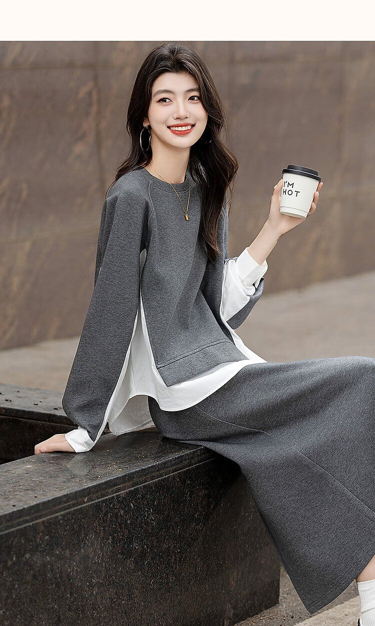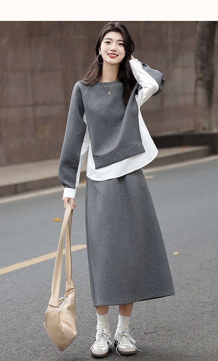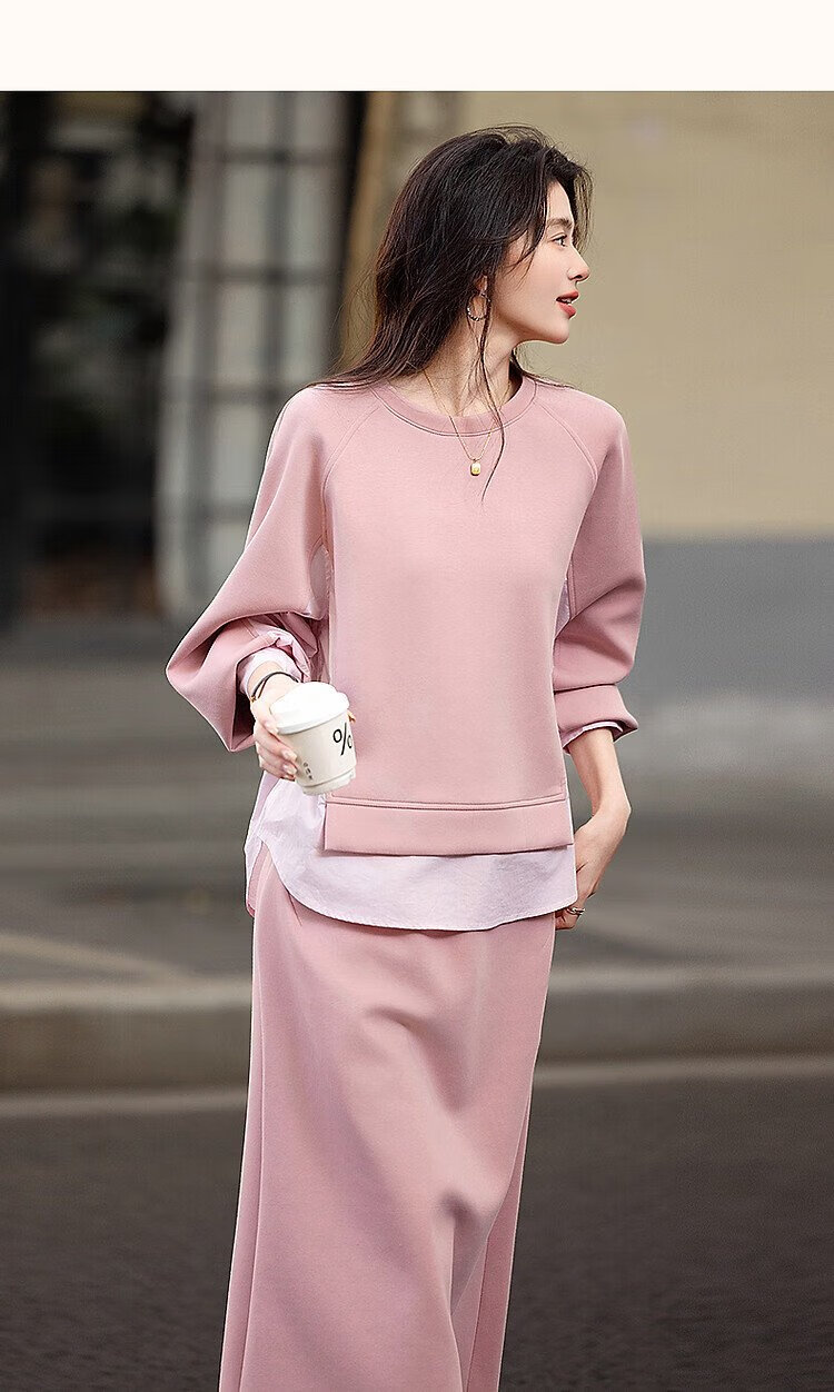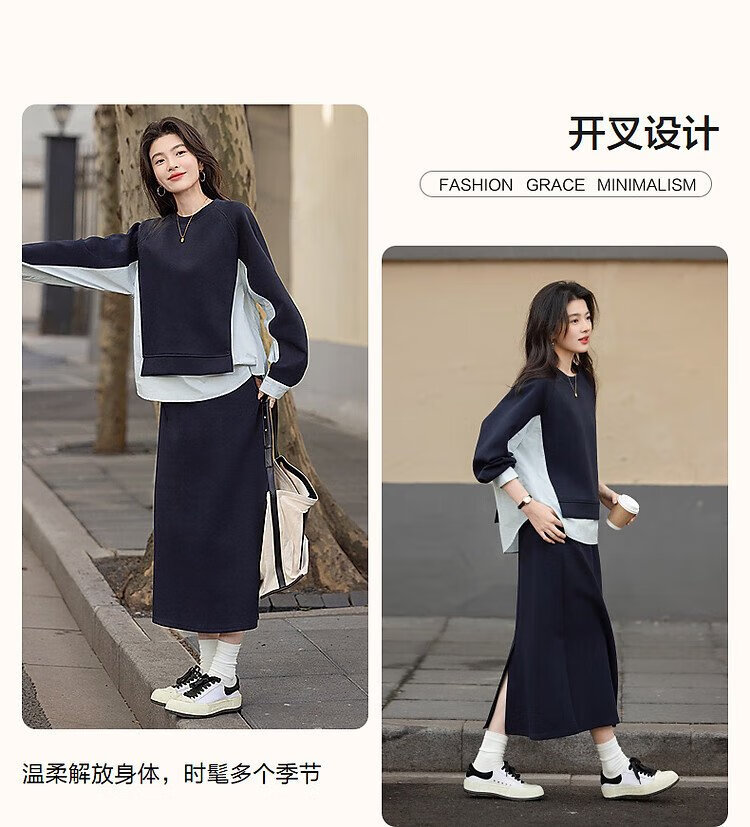 Demana 350G air layer suit spring and autumn fashionable color matching sweatshirt elastic waist slit skirt women's two-piece set