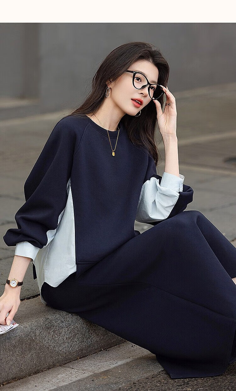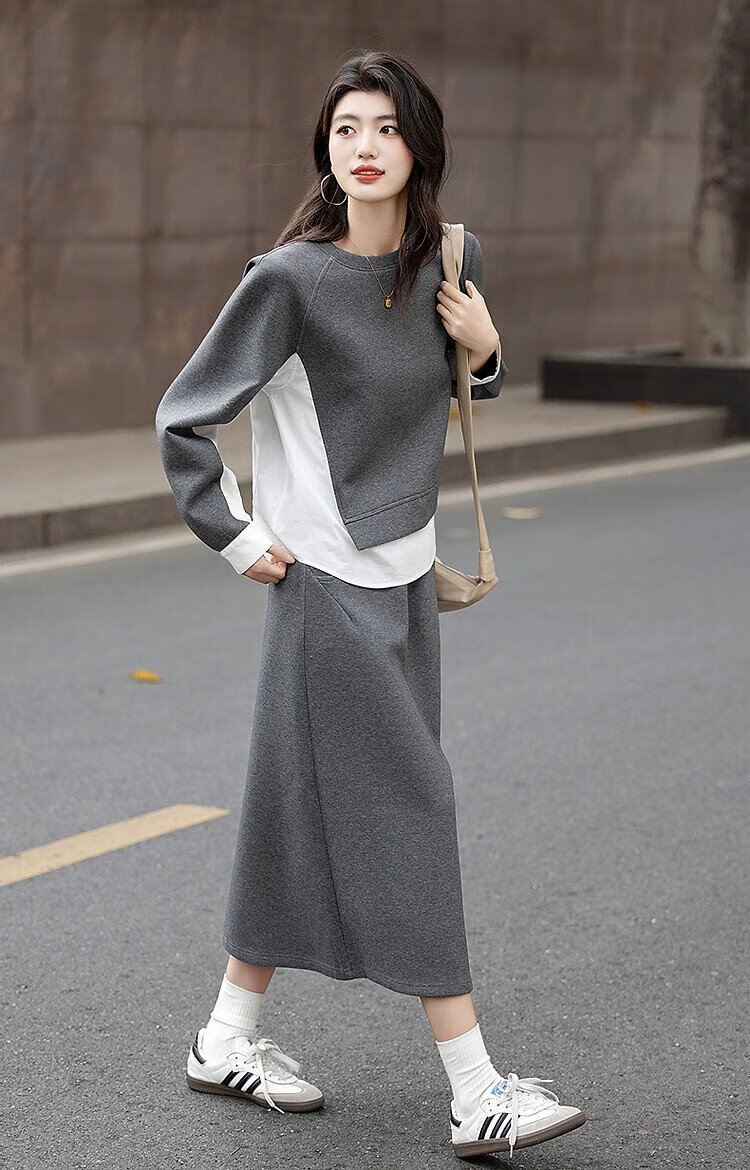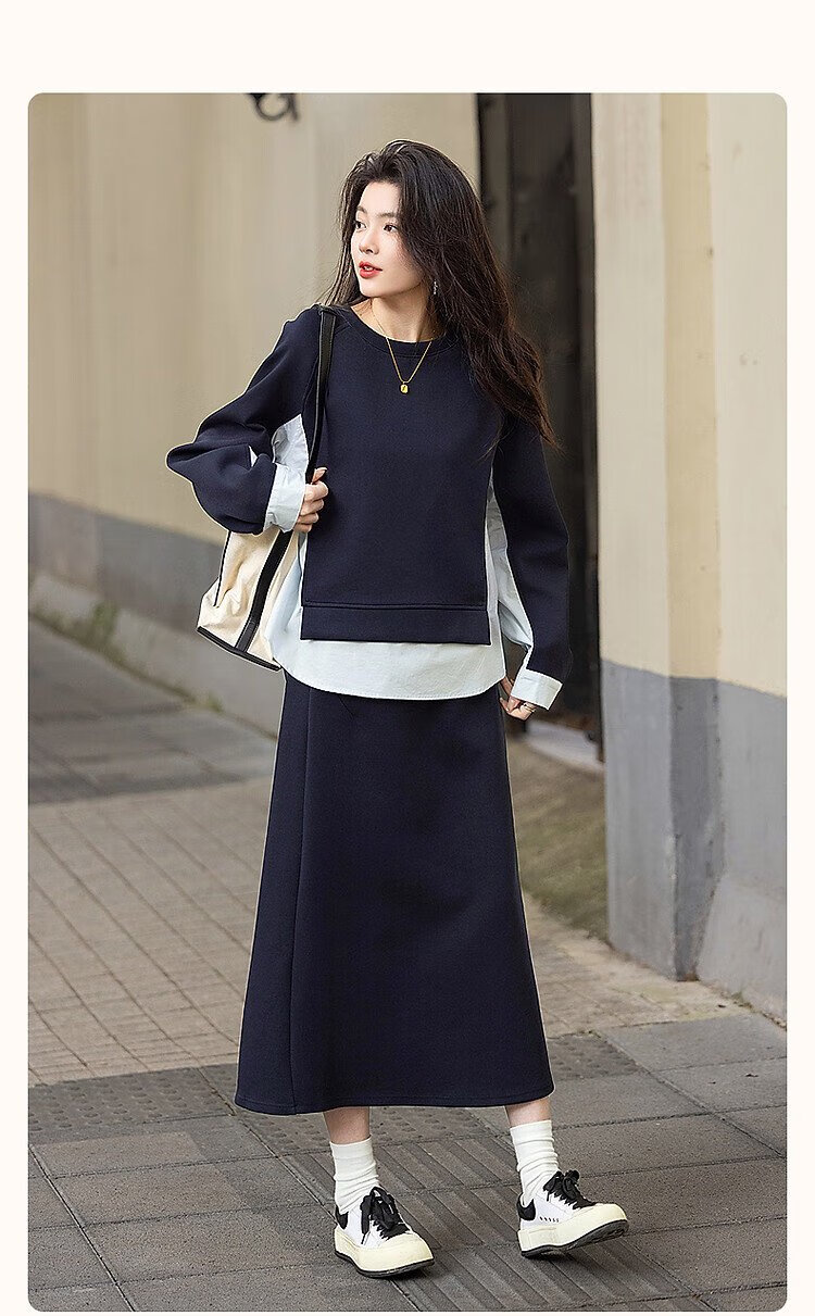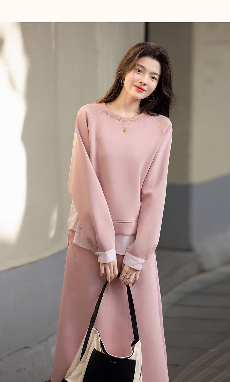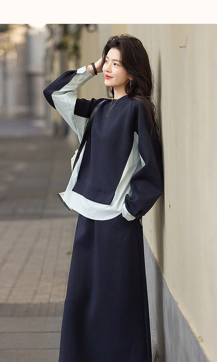 Demana 350G air layer suit spring and autumn fashionable color matching sweatshirt elastic waist slit skirt women's two-piece set