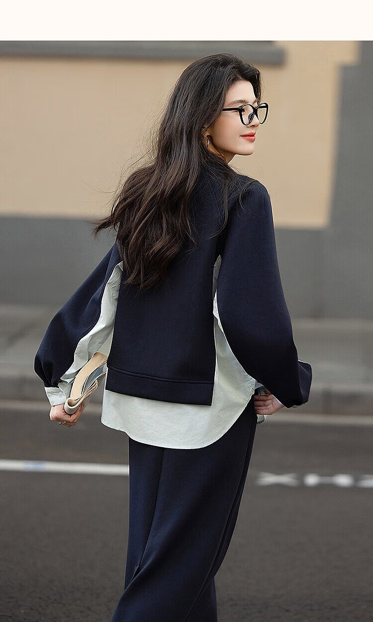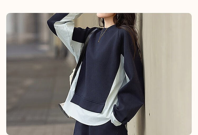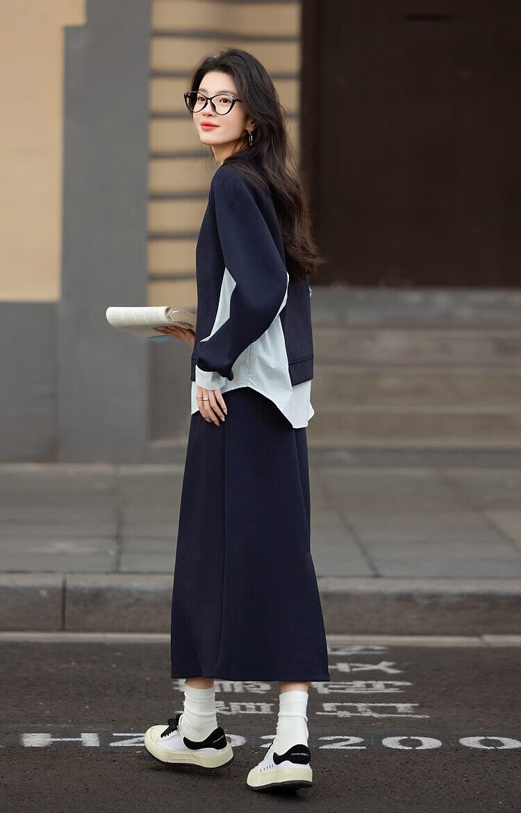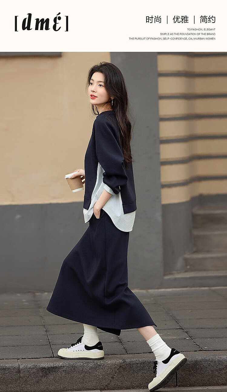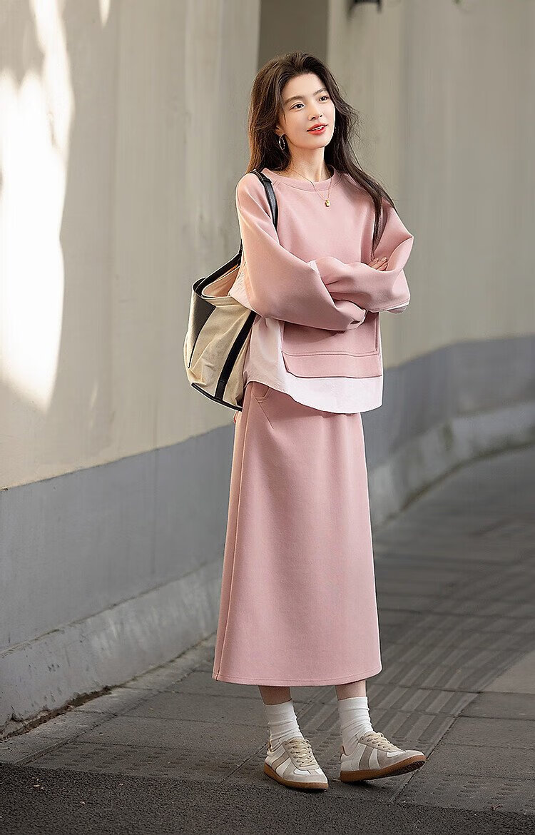 Demana 350G air layer suit spring and autumn fashionable color matching sweatshirt elastic waist slit skirt women's two-piece set