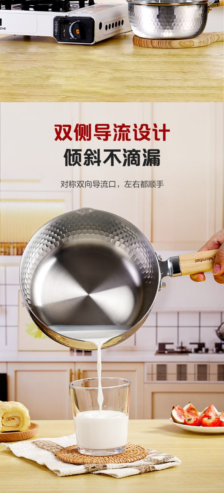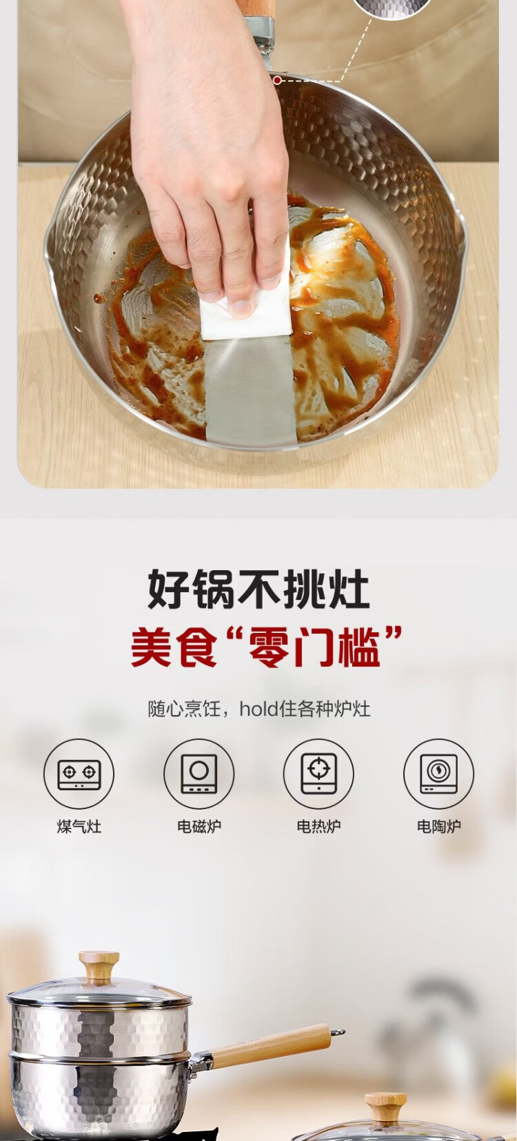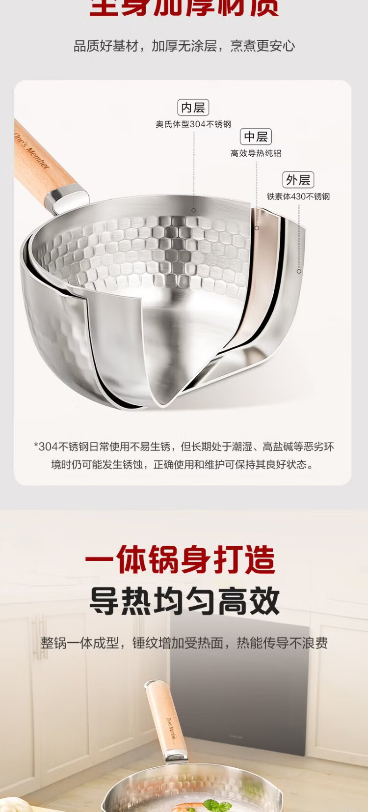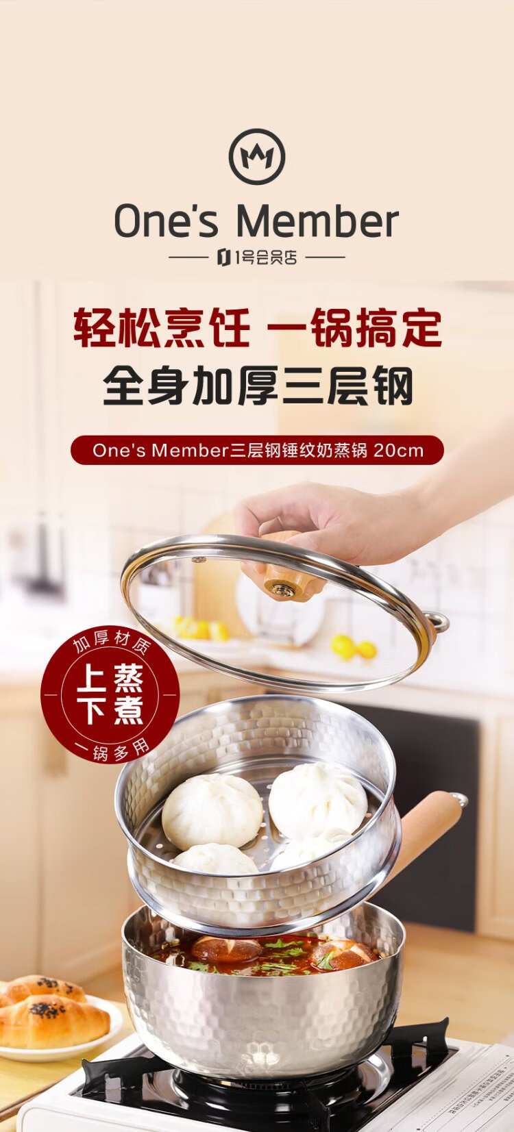 Member Store No. 1 20cm uncoated 3-layer steel thickened 304 stainless steel Japanese-style snow flat milk steamer baby food supplement soup pot instant noodle pot