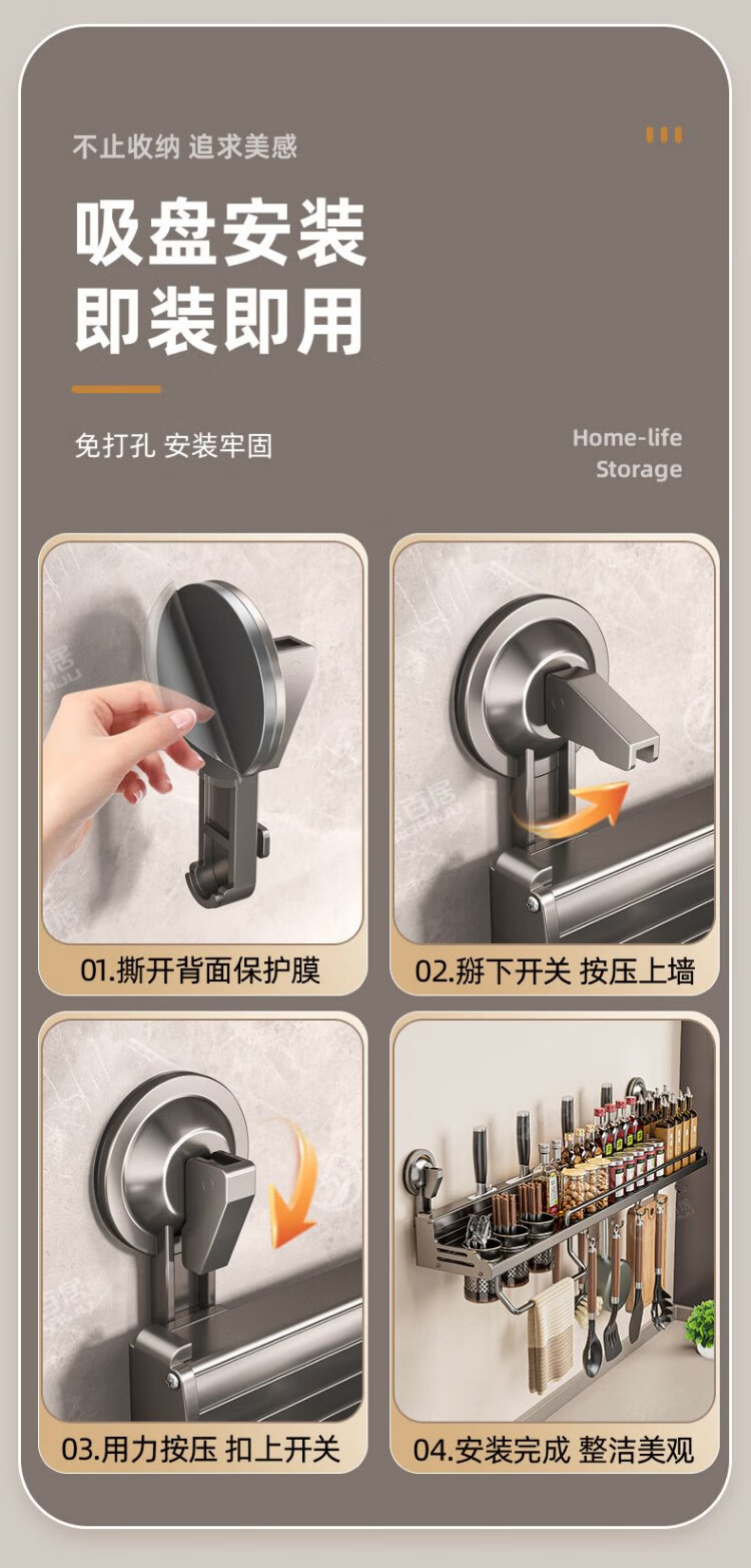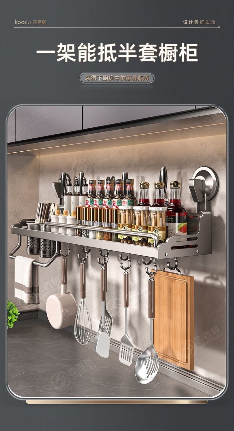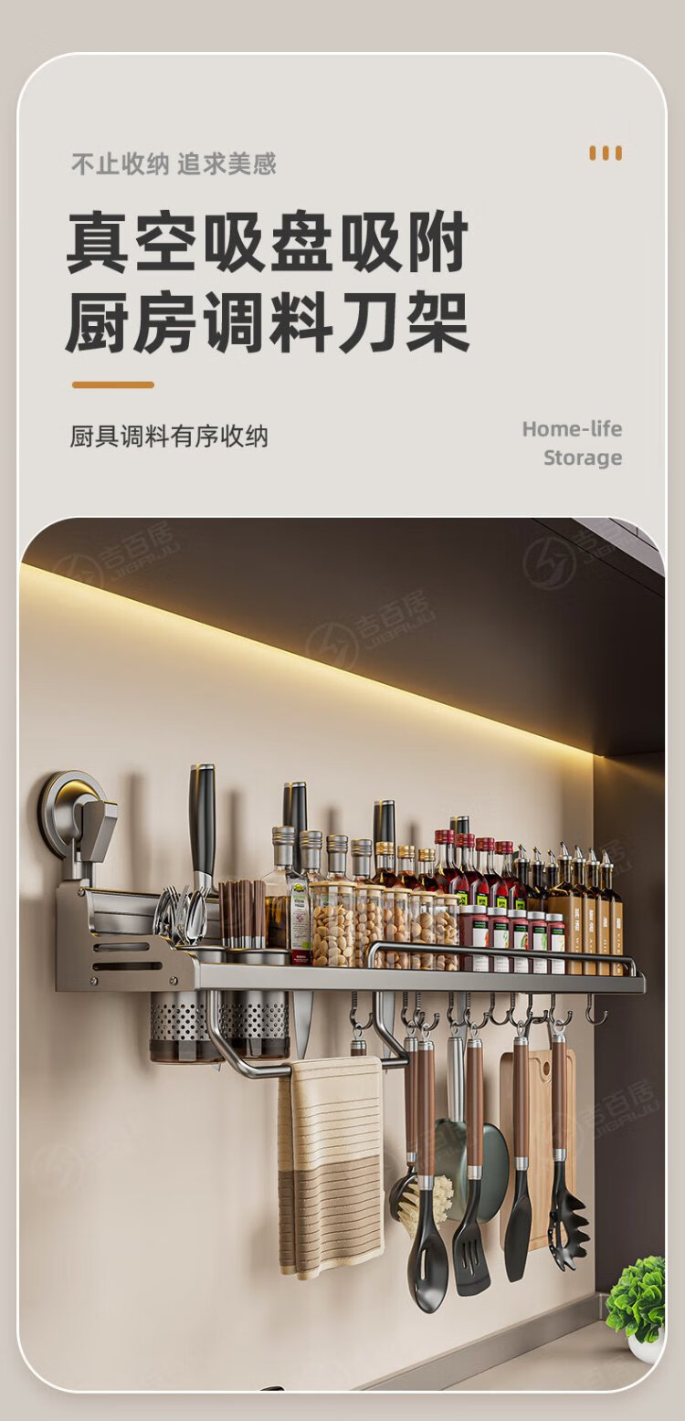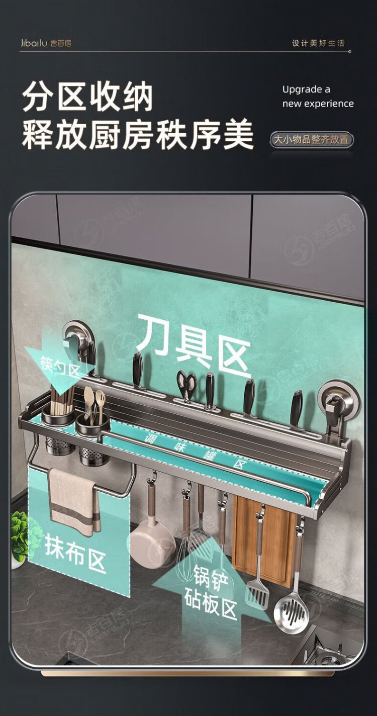 Jibaiju kitchen suction cup storage rack without punching seasoning spoon knife holder integrated wall-mounted household multi-functional storage rack