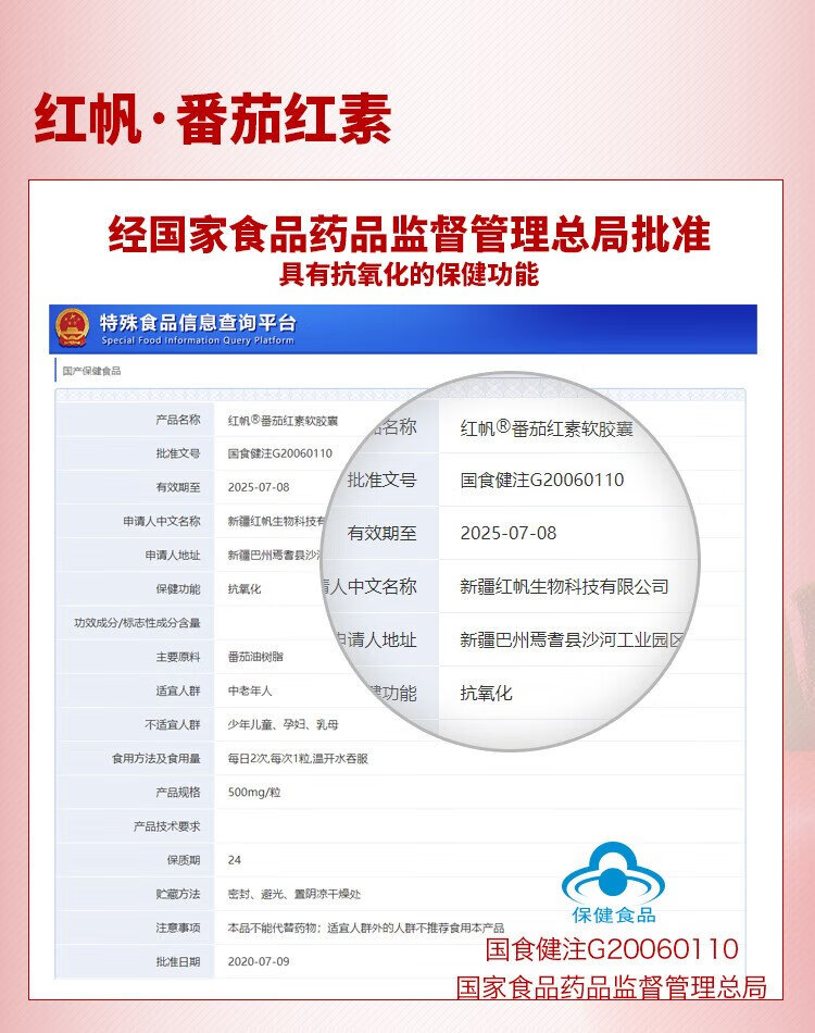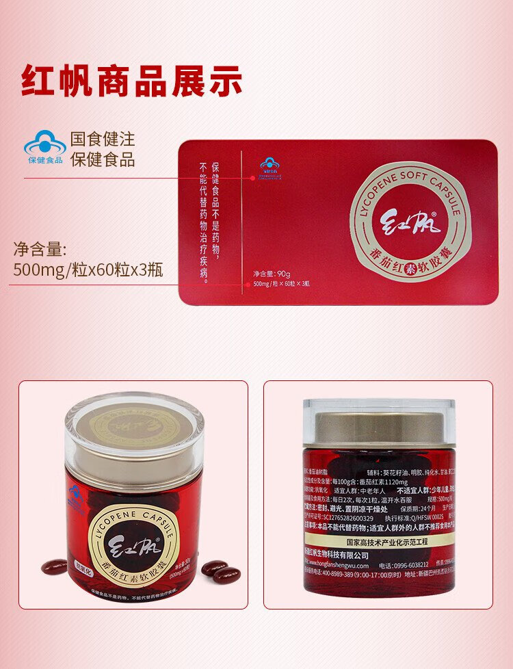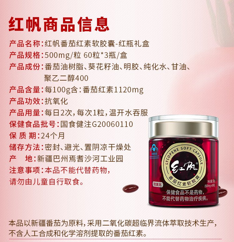 Hongfan R lycopene soft capsule middle-aged and elderly pure physical antioxidant Xinjiang gift box 500mg/capsule*60 capsules*3 bottles