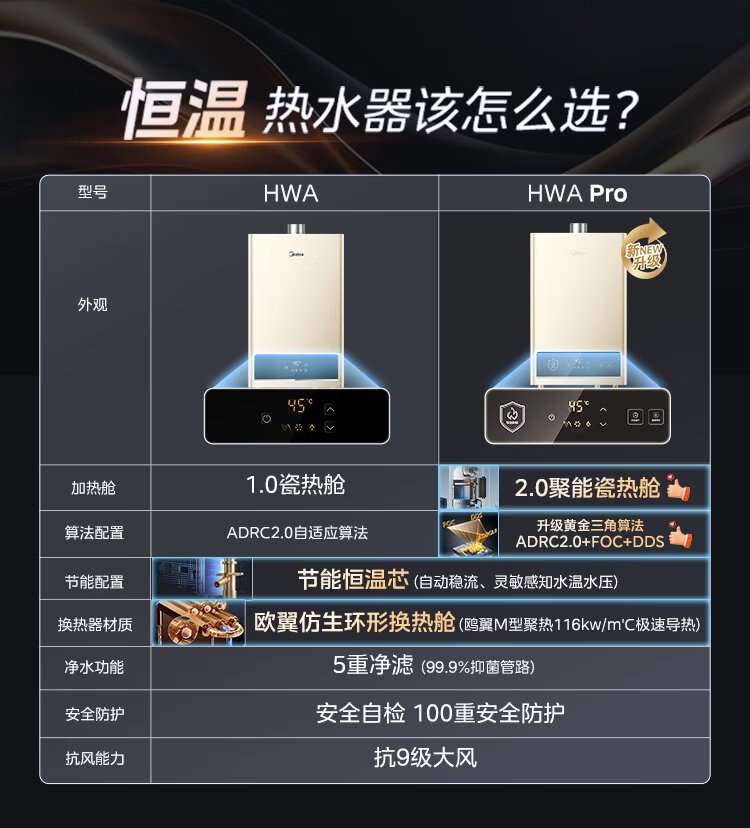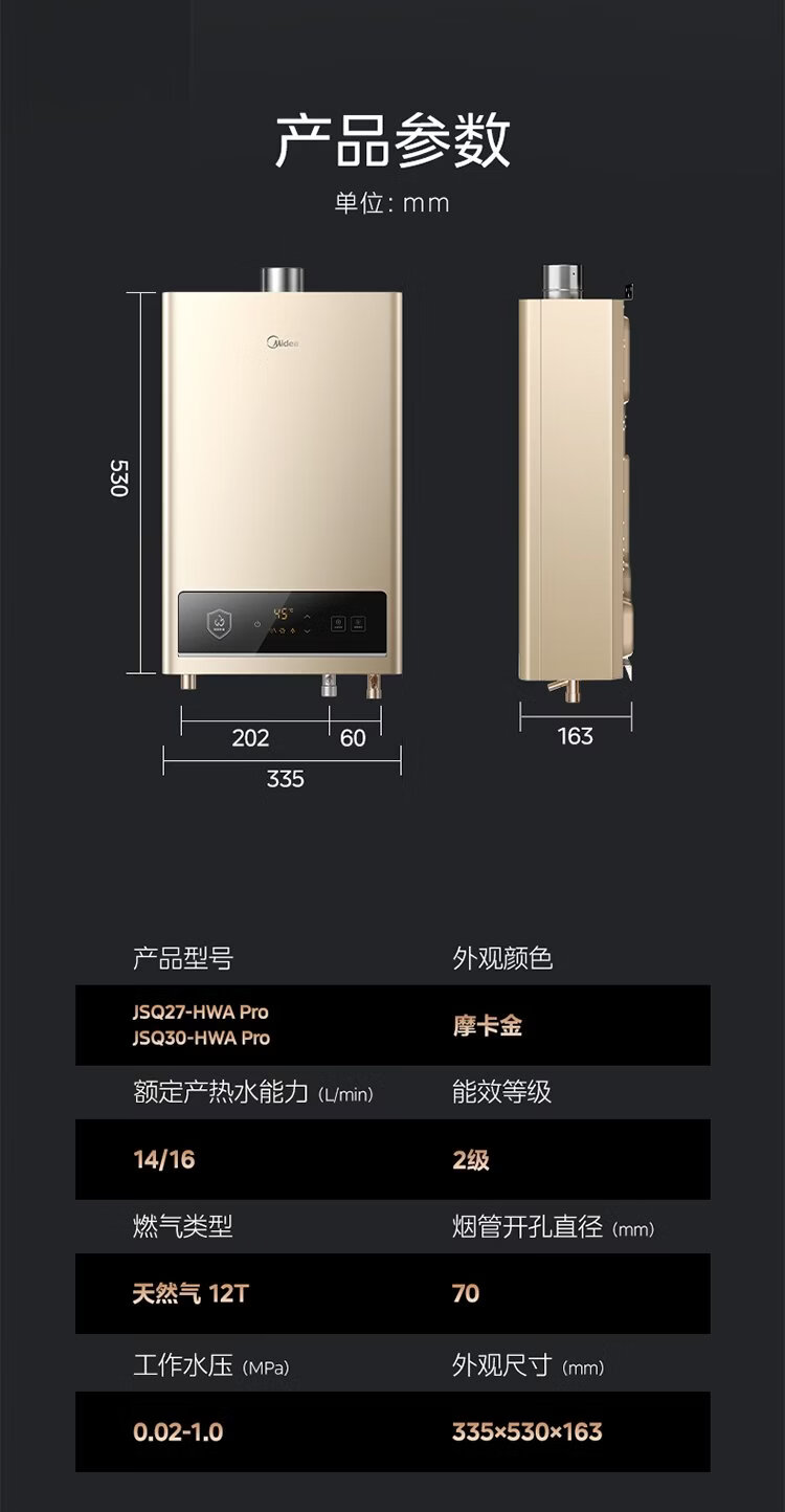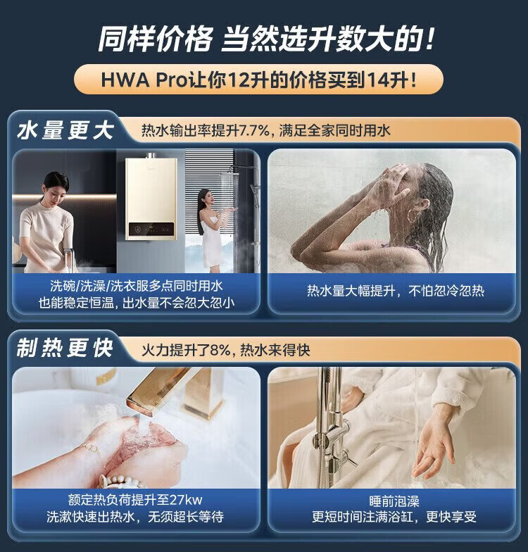 Midea gas water heater HWA Pro 14L is better than 13L. Smart inverter for home use. Constant temperature and energy saving. Low water pressure start. Door-to-door installation. HWA Pro 14L.