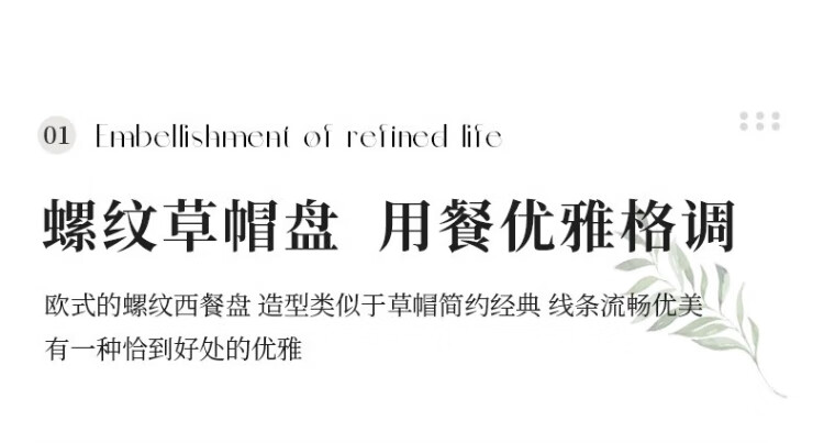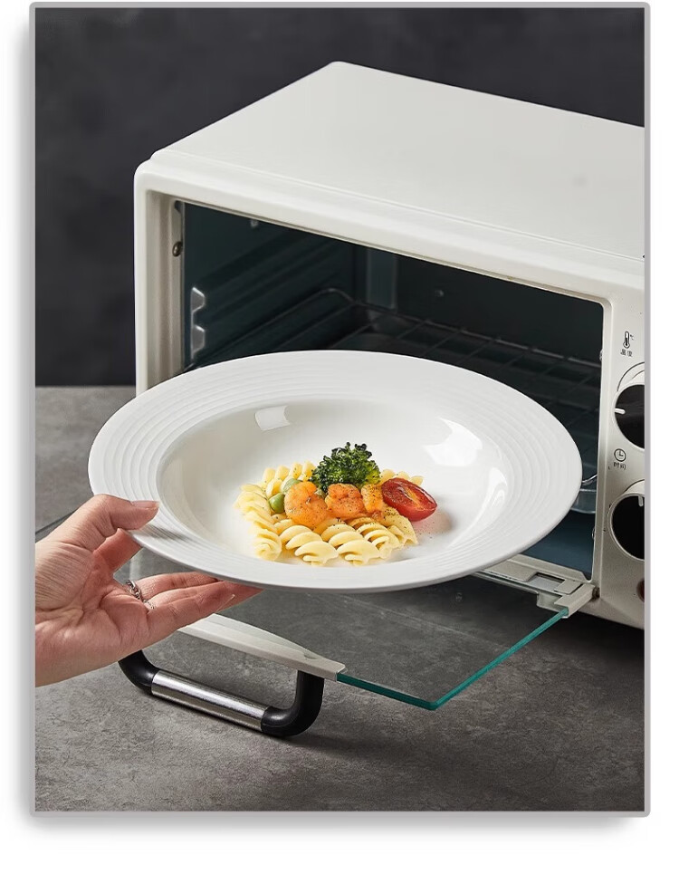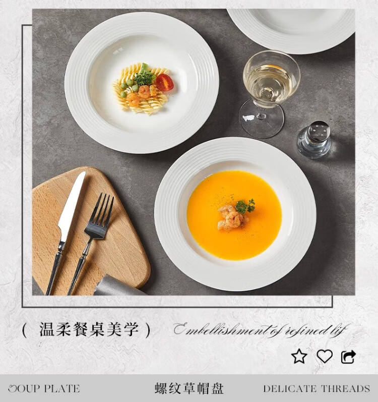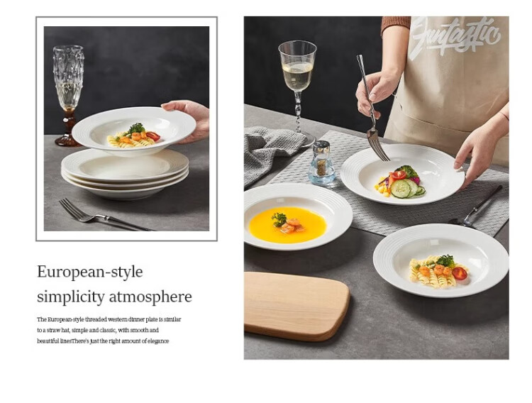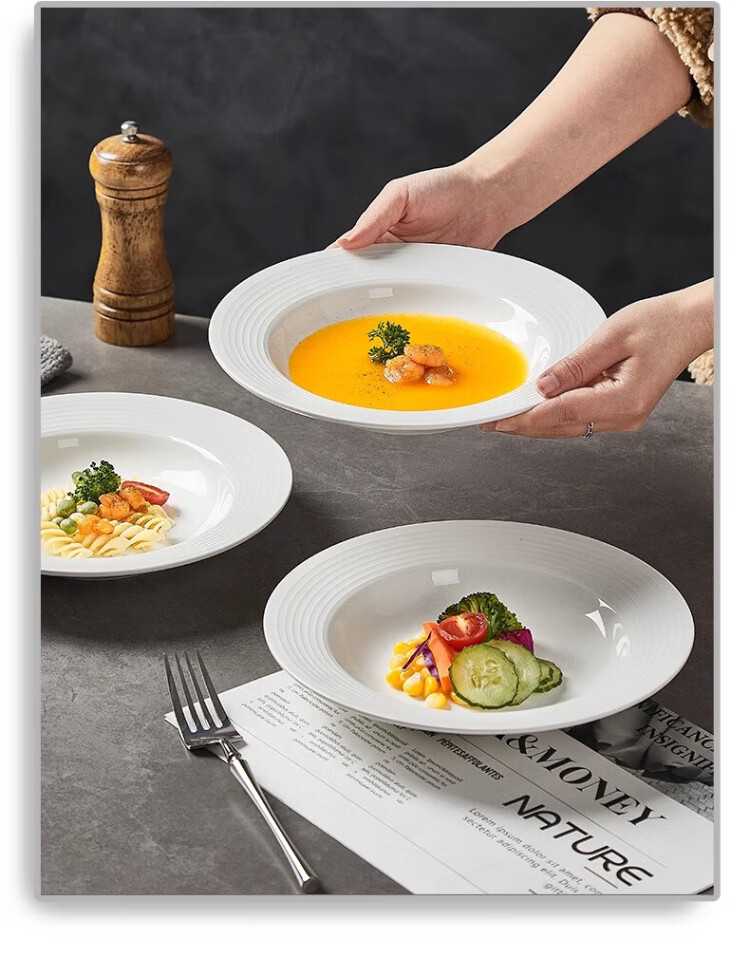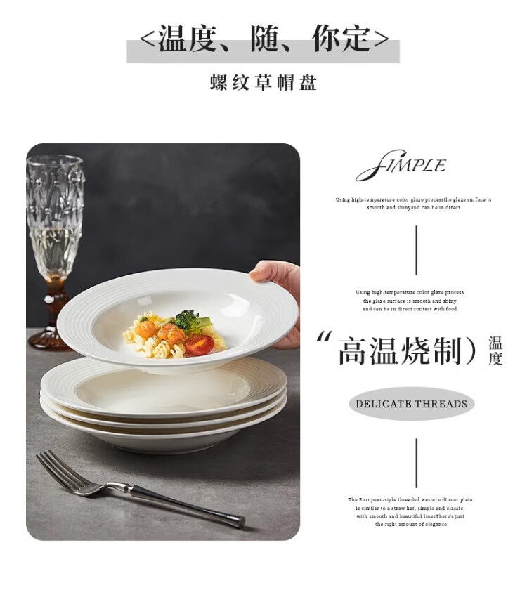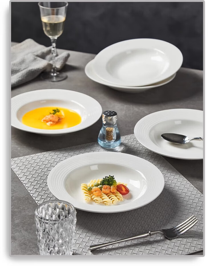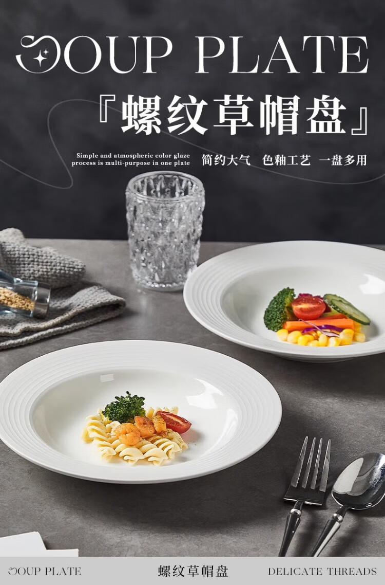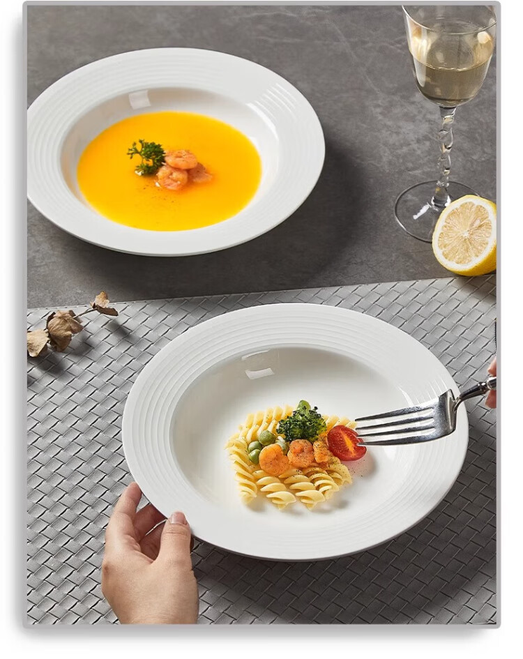 Jiwu Forest Straw Hat Plate Household Salad Plate Threaded Ceramic Soup Plate Western Pasta Plate White 8.5 Inch 4 Pack