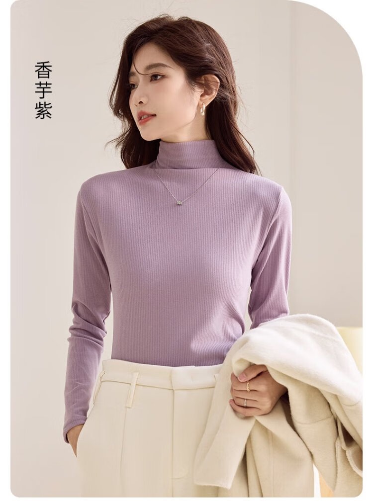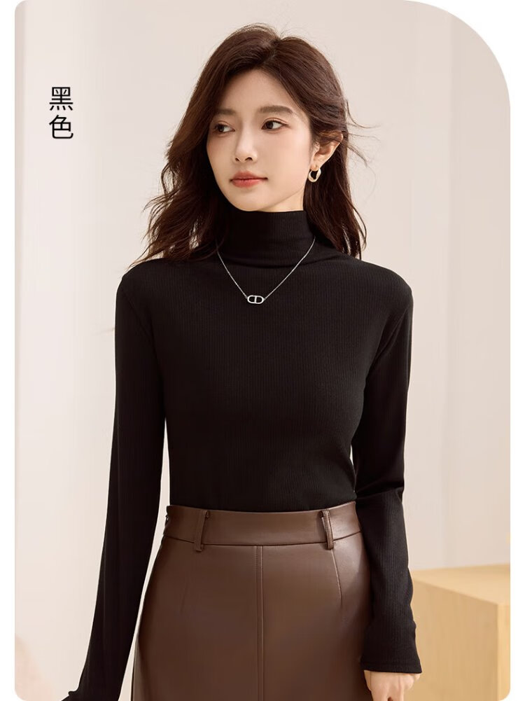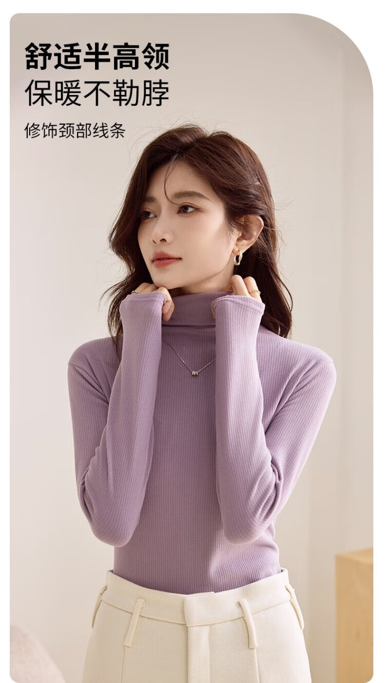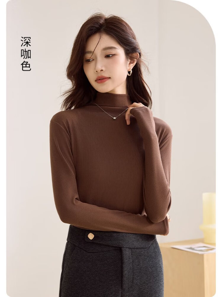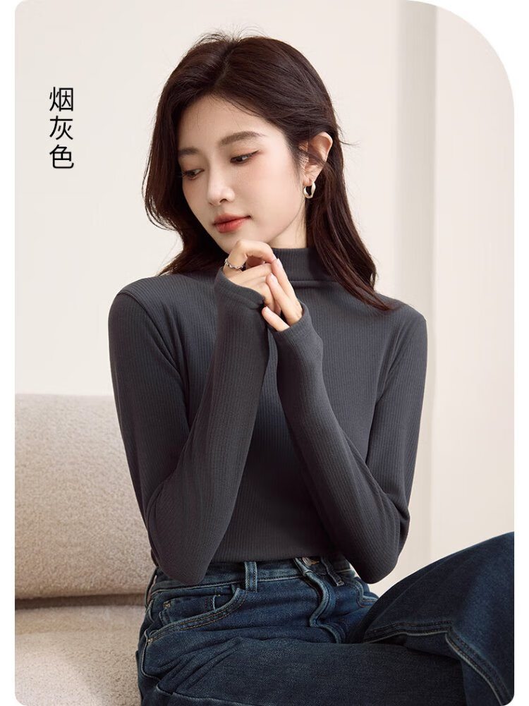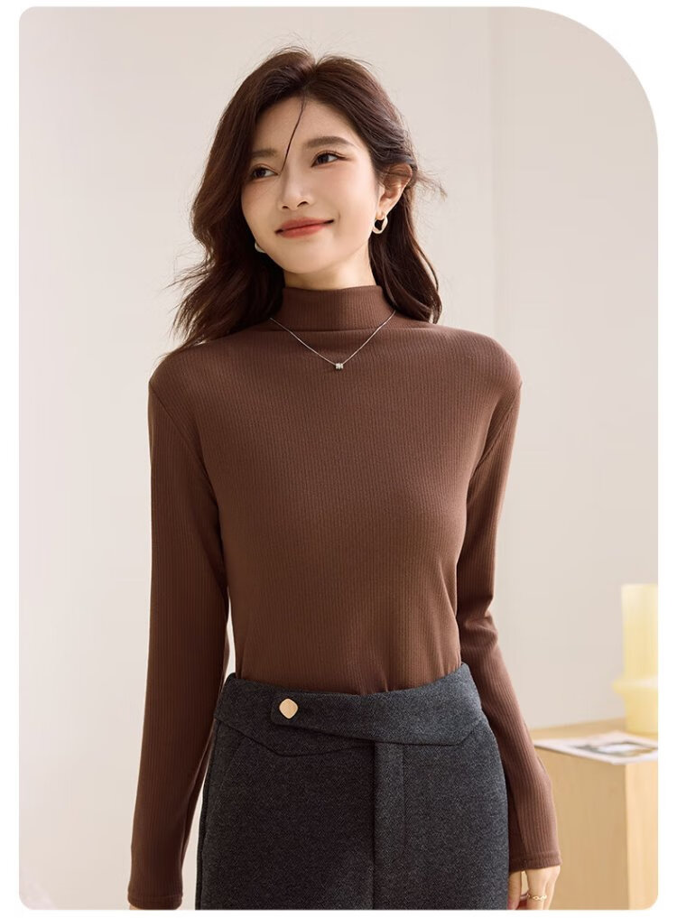 BOPRUIEY thickened brushed bottoming shirt for women, autumn and winter style, half turtleneck, vertical pattern, skin-friendly long-sleeved top