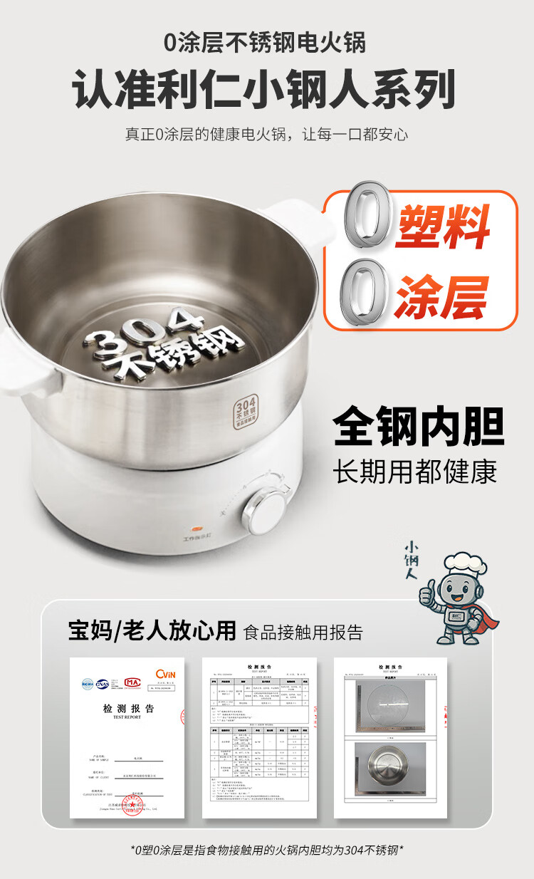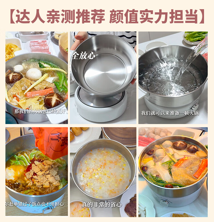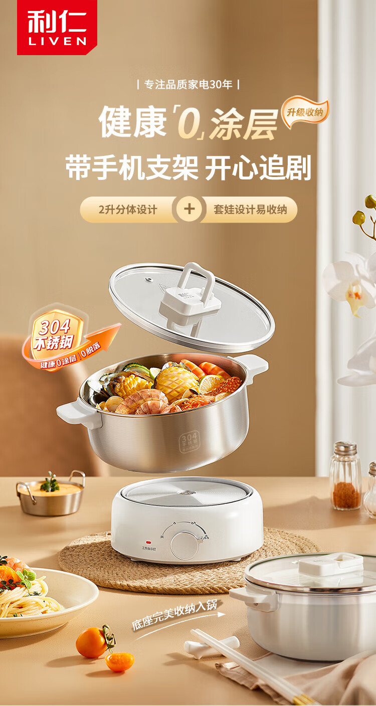 Liven Little Steel Electric Cooking Pot 304 Stainless Steel 0 Coating Split Electric Hot Pot 2L Student Small Pot Small Electric Pot Electric Hot Pot 1-2 Persons Multi-Function Pot DHG-180F Upgraded Model