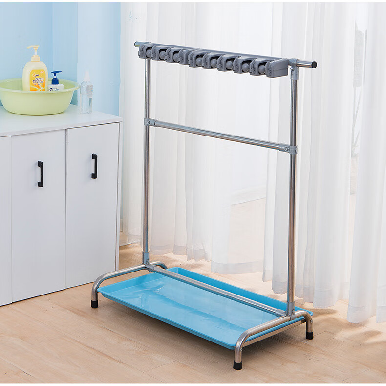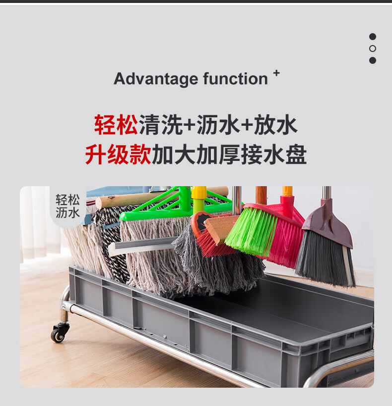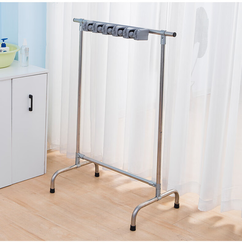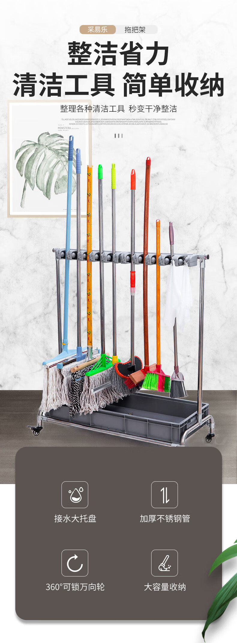 Caiyile stainless steel mop rack mop broom mop hanger floor-standing drain organizer cleaning tool storage rack 5 hangers 6 hooks with stainless steel basin 10189