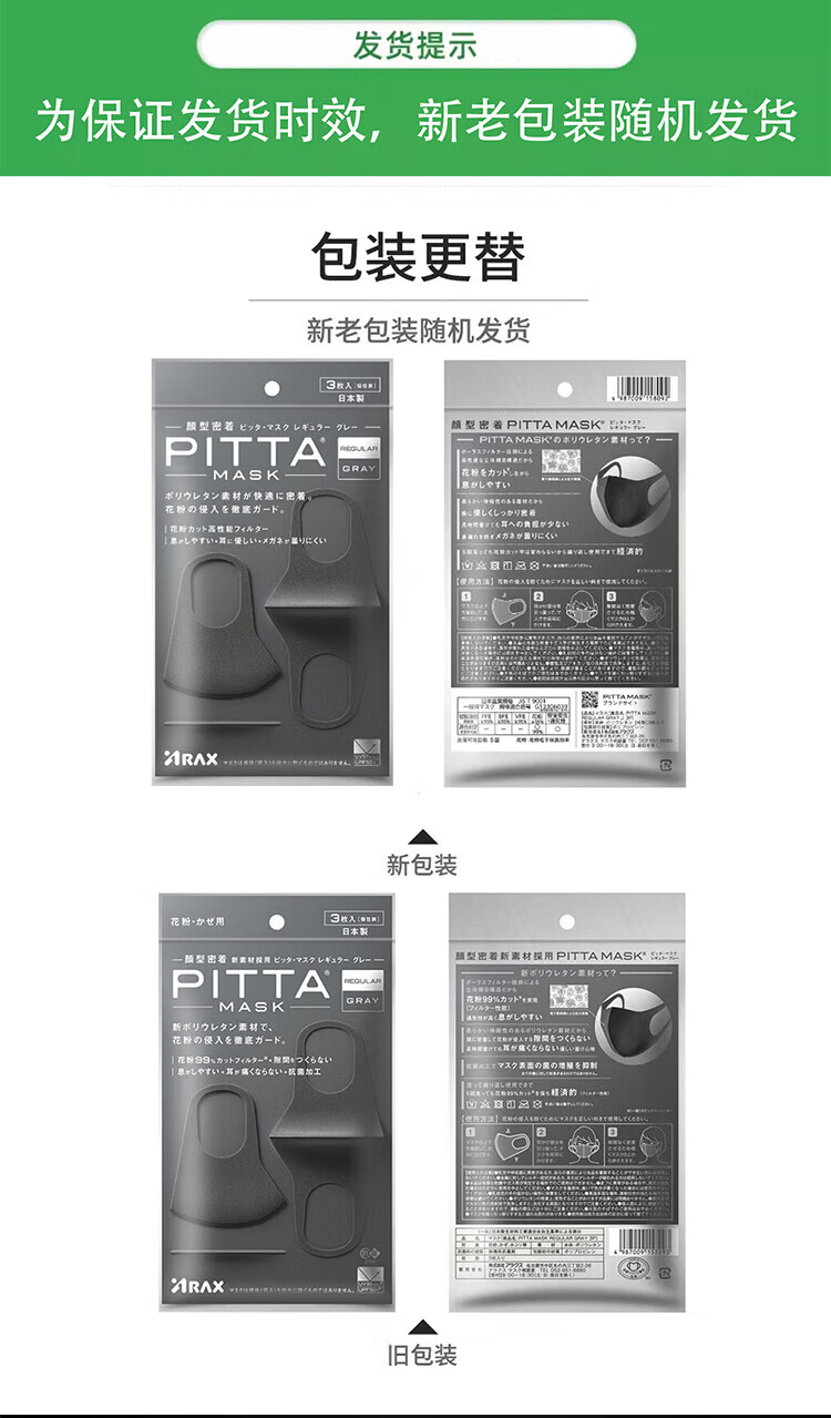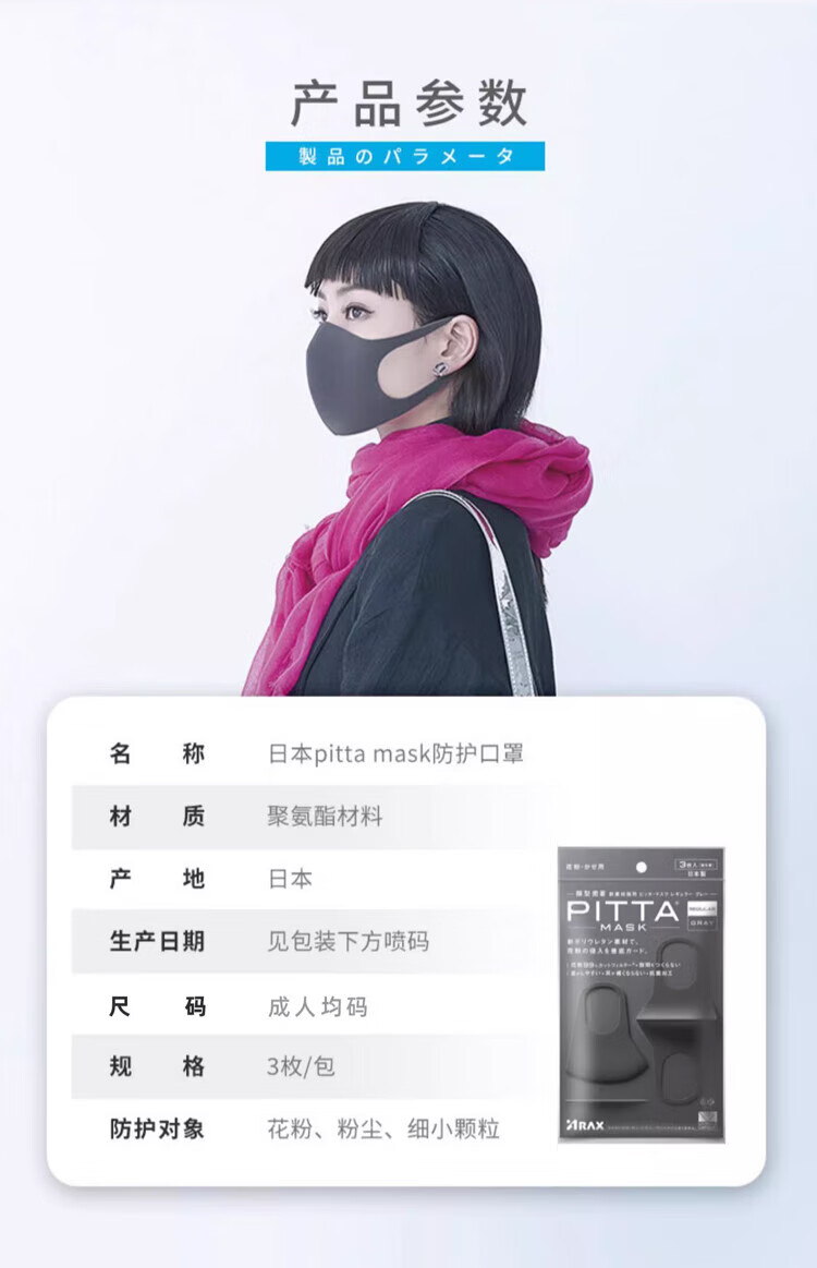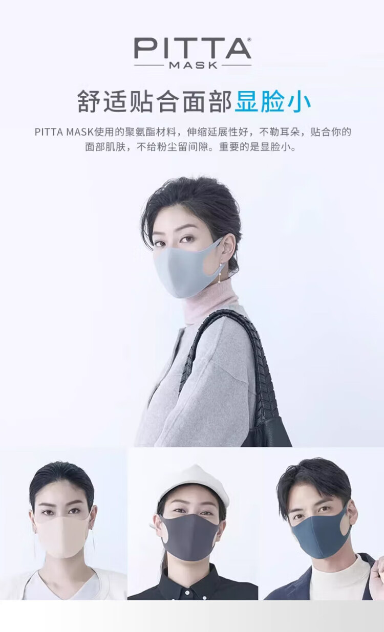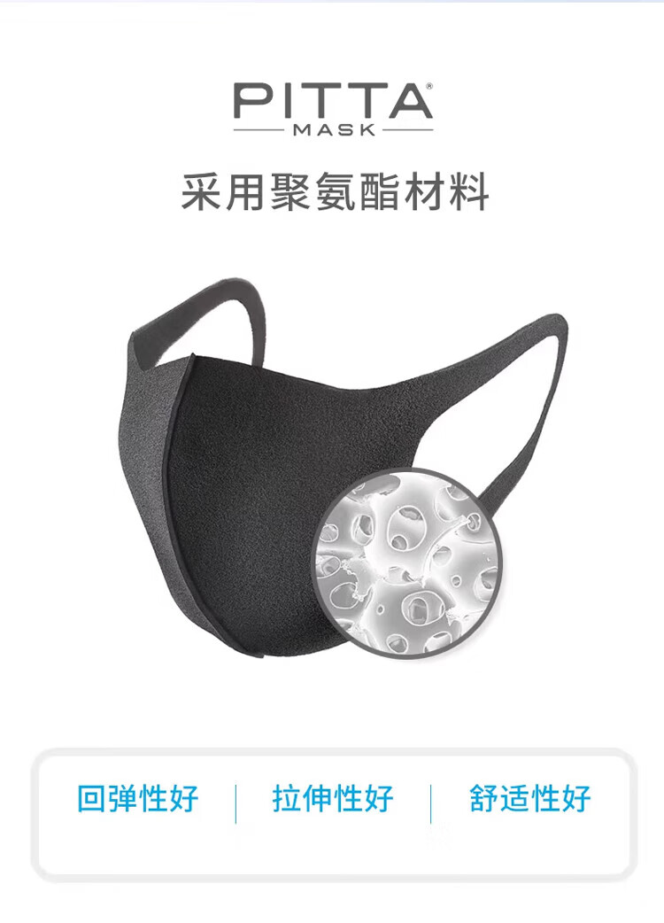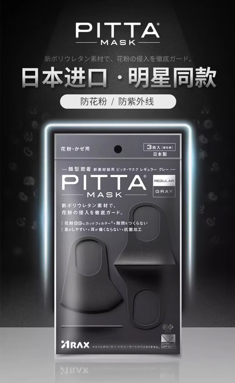 PITTA mask, anti-pollen dust, sun protection and warm mask, adult style celebrity style, black gray, 3 pieces/bag