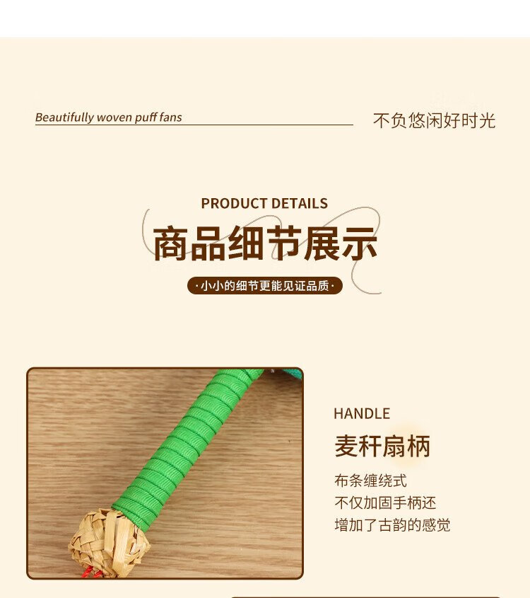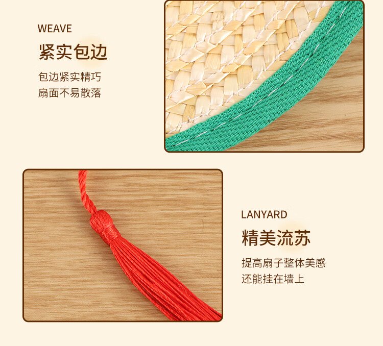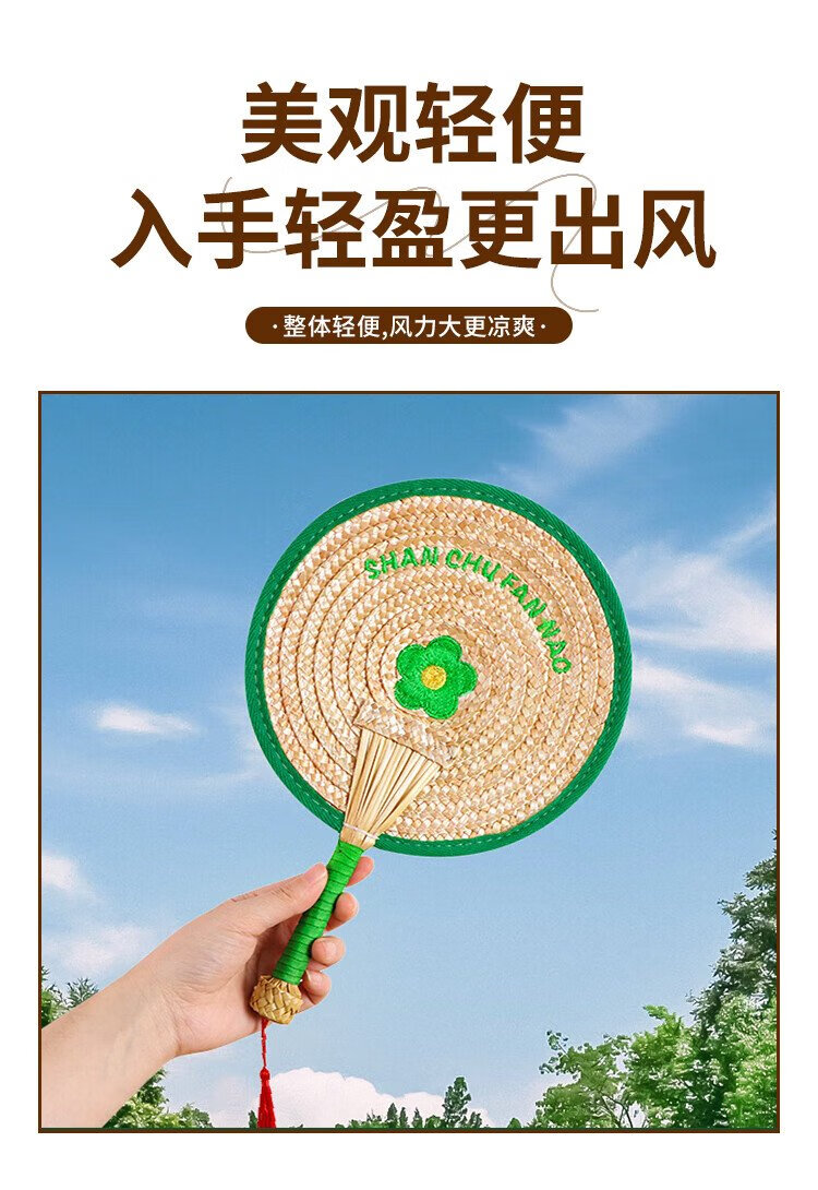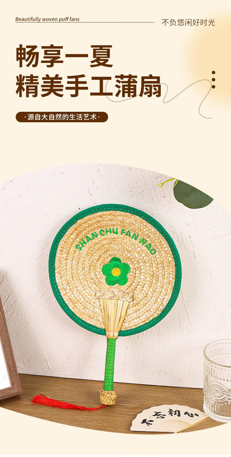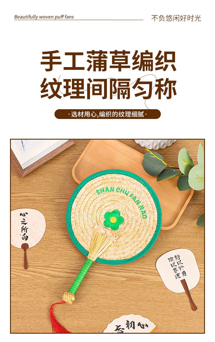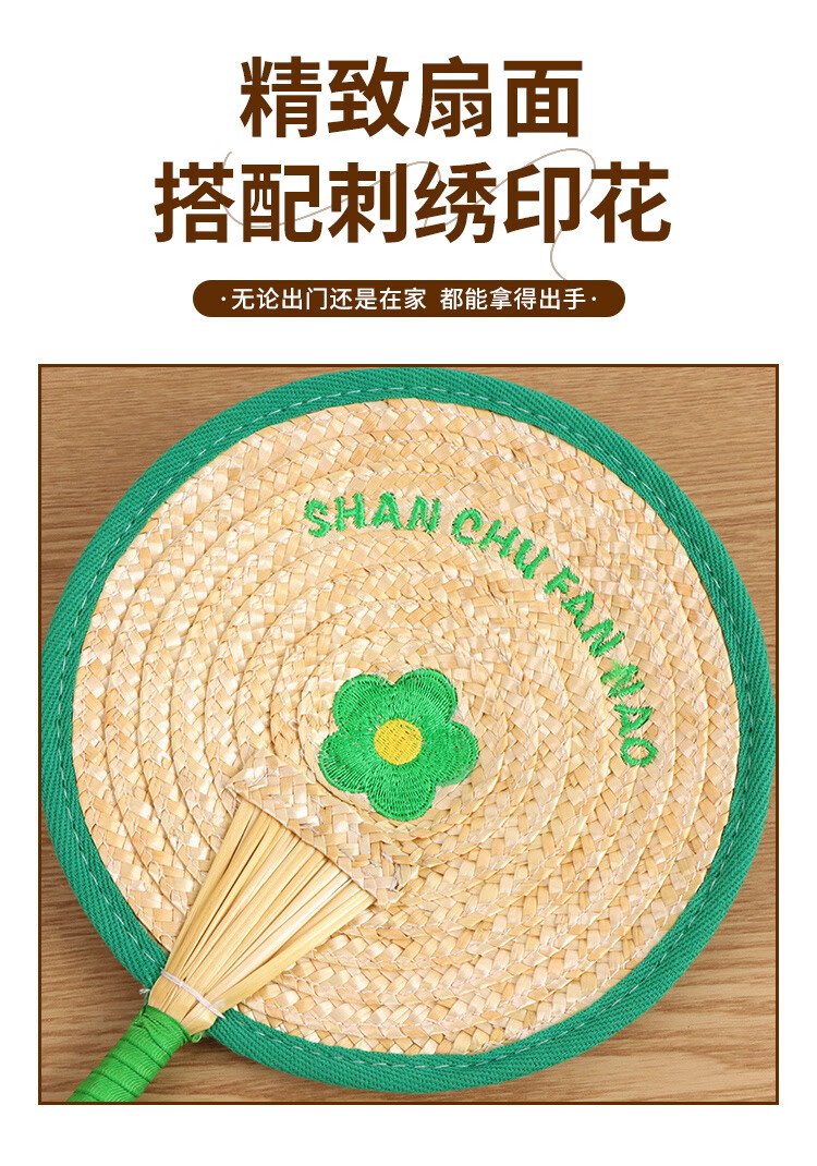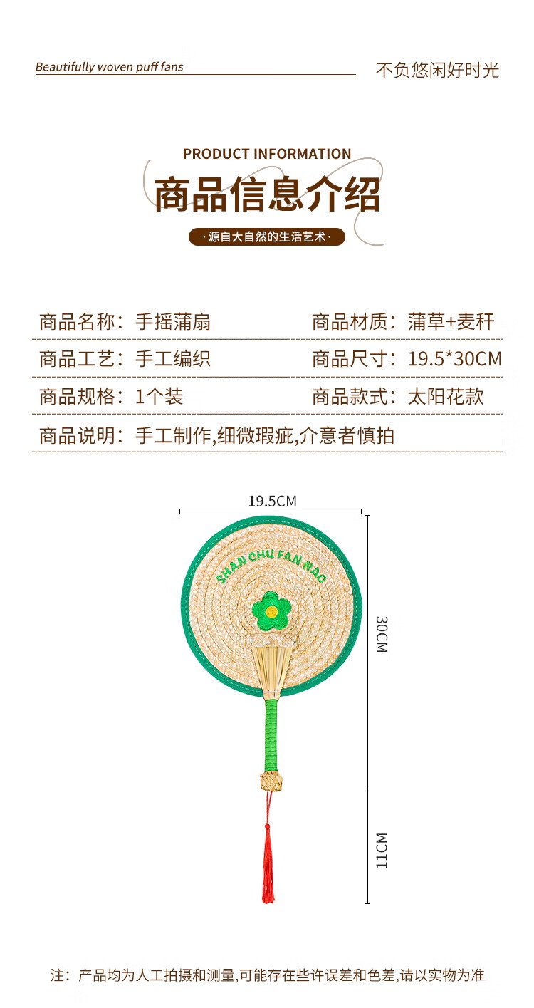 TaTanice hand-made cattail fan, straw woven round fan, embroidered hand-operated lightweight small cattail fan, straw woven sunflower green