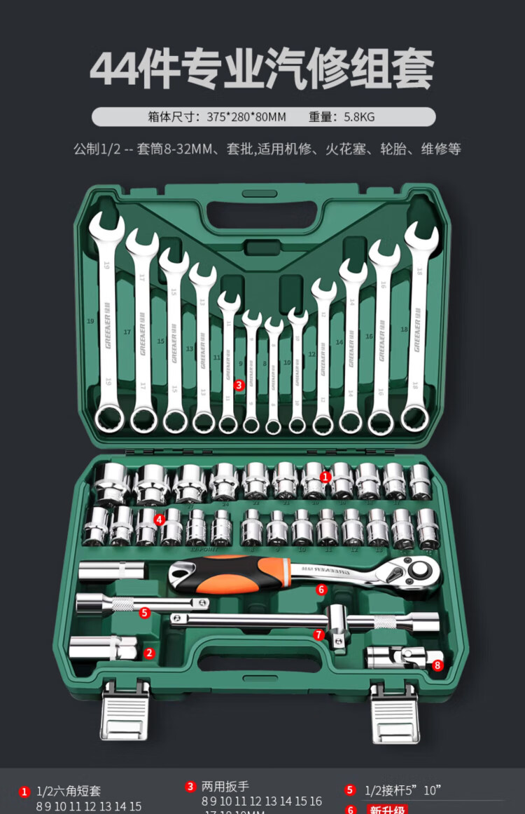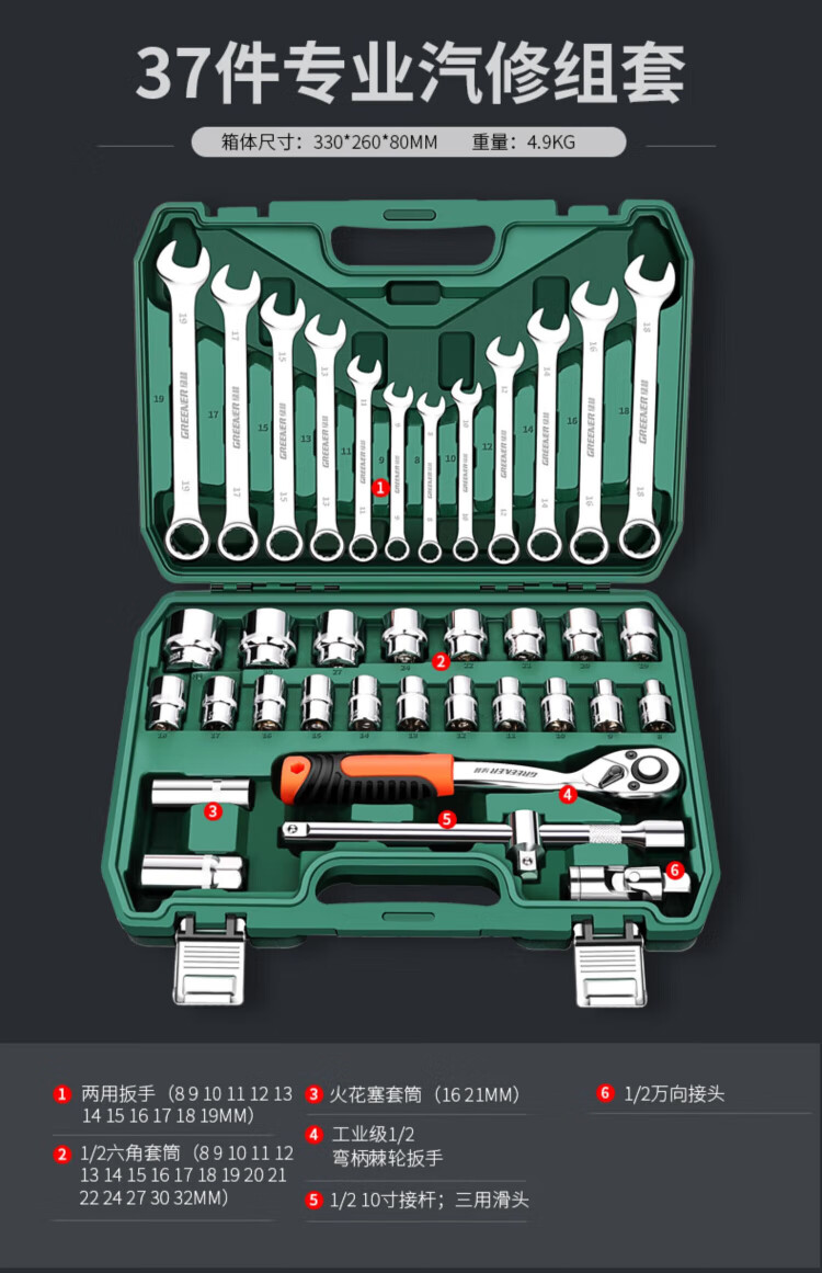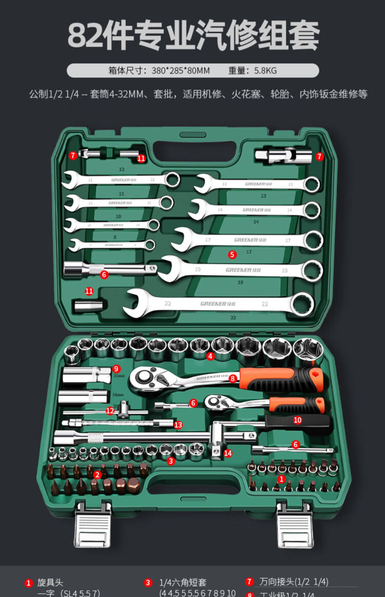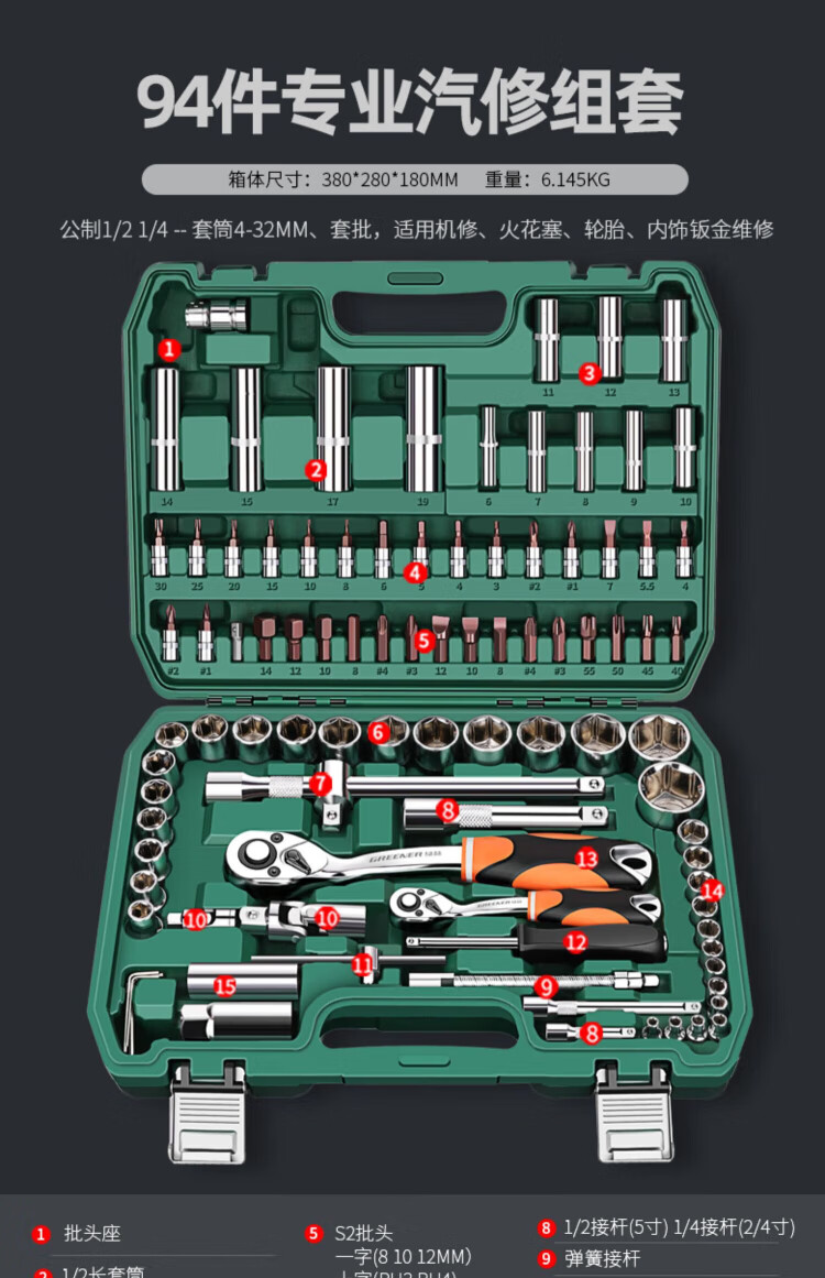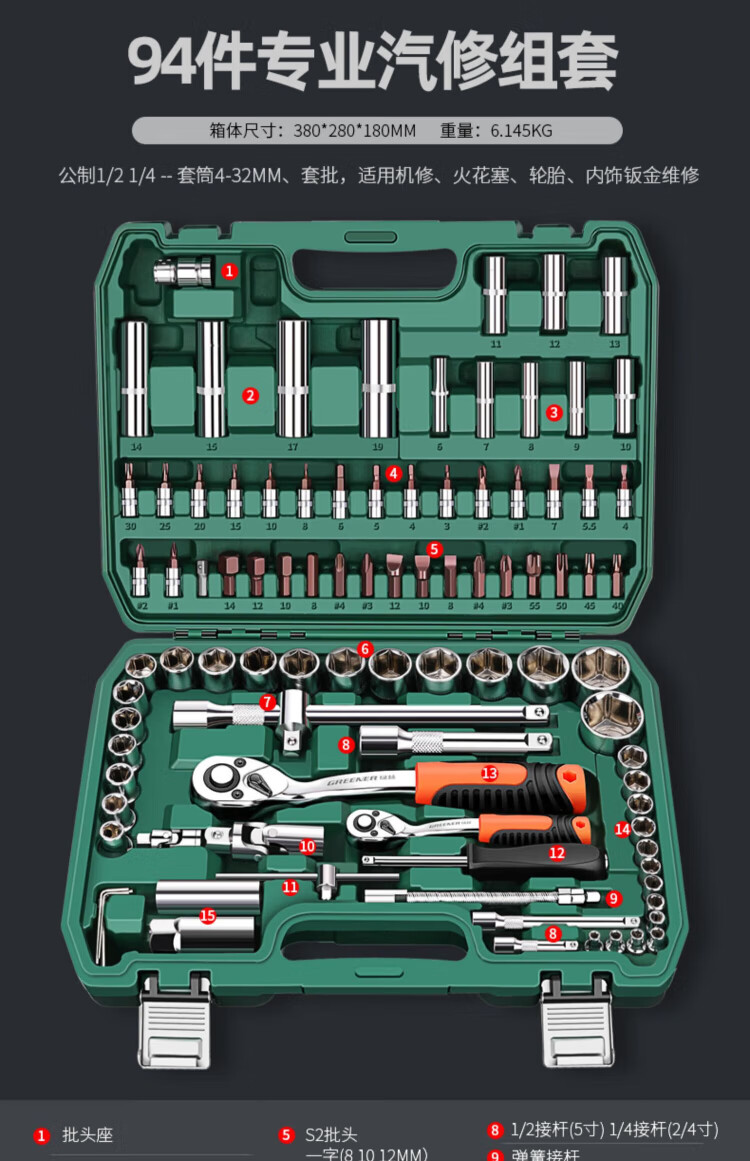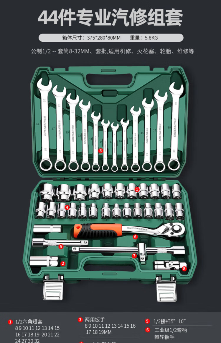Green Forest Professional Auto Repair Tool Set 54-piece Home Auto Repair Tool Box Ratchet Quick Wrench Socket Complete Set