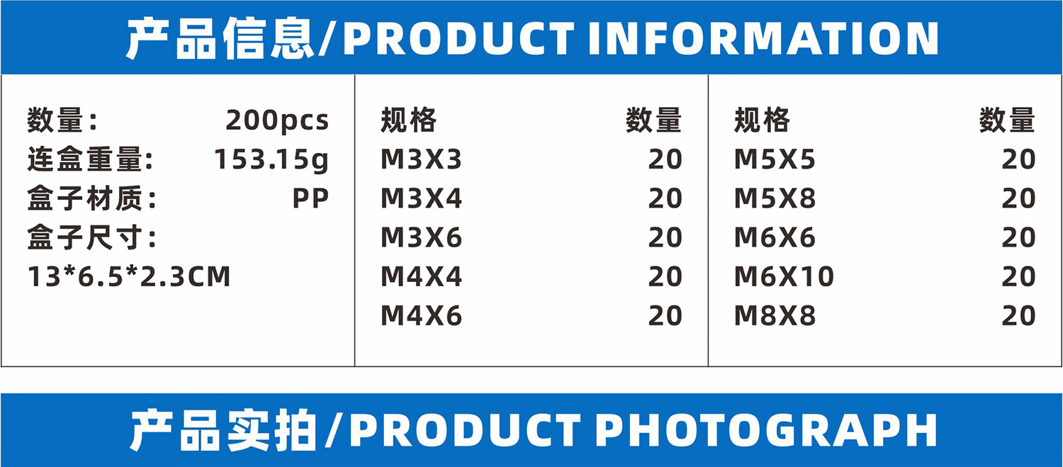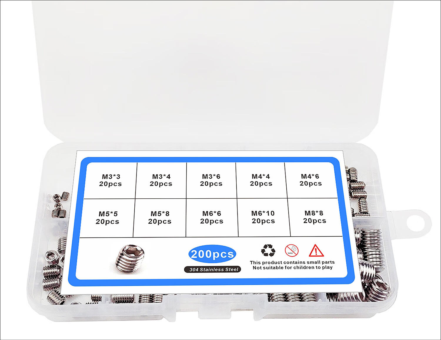 JESTIN Headless hexagonal machine screws, flat end tightening 304 stainless steel screws M3-M8, 304 flat end machine screws, 200-piece box