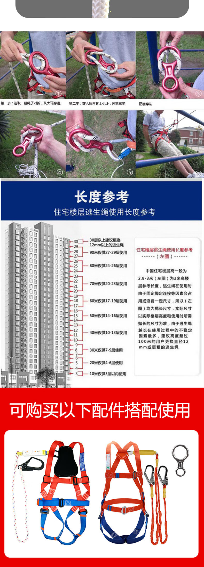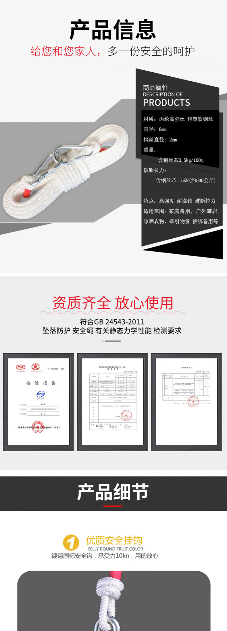 Baige Safety Rope Inner Core Steel Wire Rope High-altitude Operation Safety Speed-Down Mountaineering Rope Emergency Rescue Insurance Rope Jingcang-500KG 8mm/20m CW064031