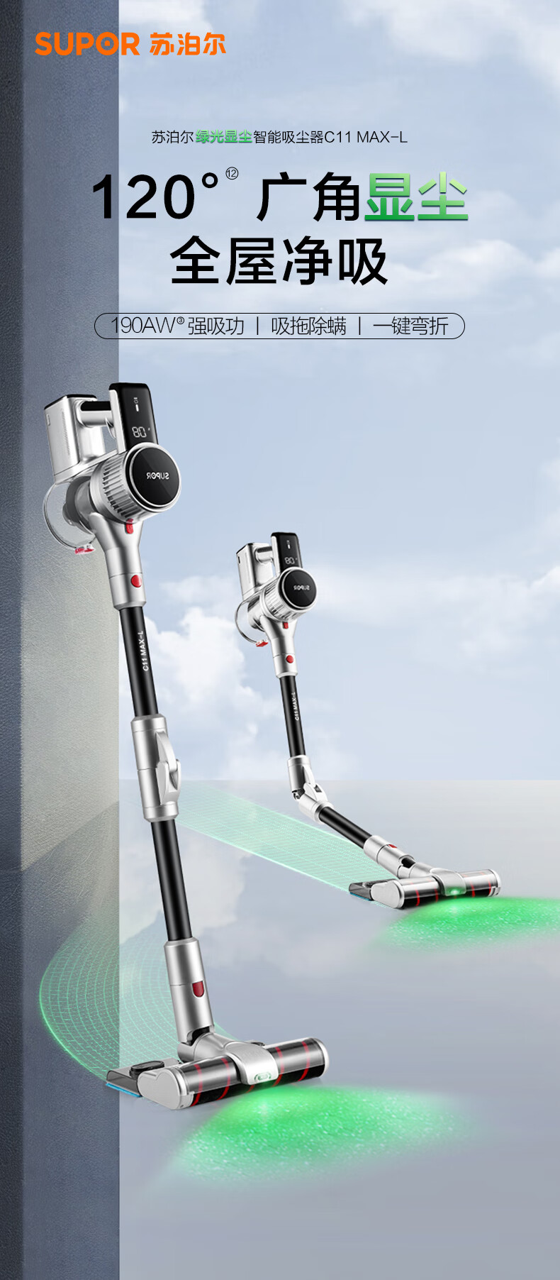 SUPOR vacuum cleaner wireless handheld household suction and mopping all-in-one green light 33KPa large suction dust and mite removal machine National subsidy C11MAX-L