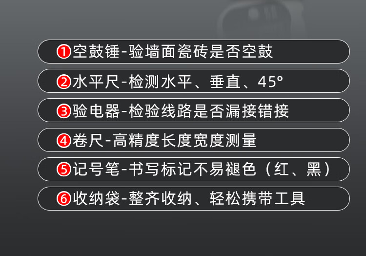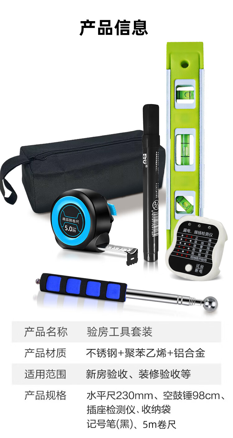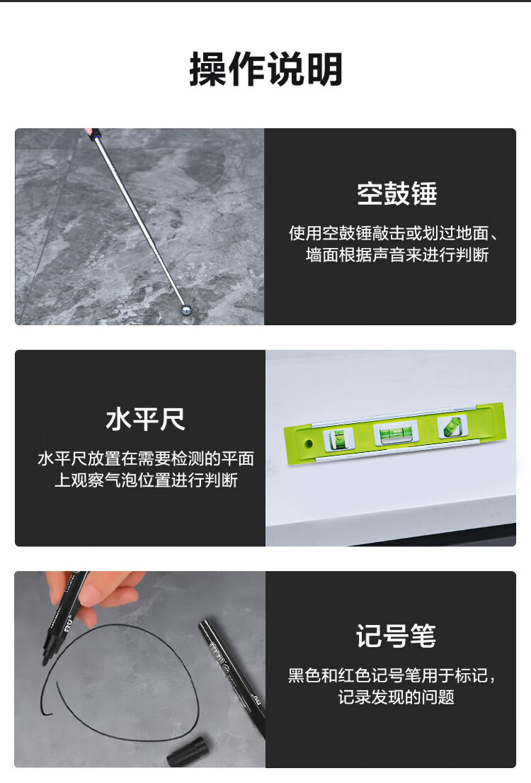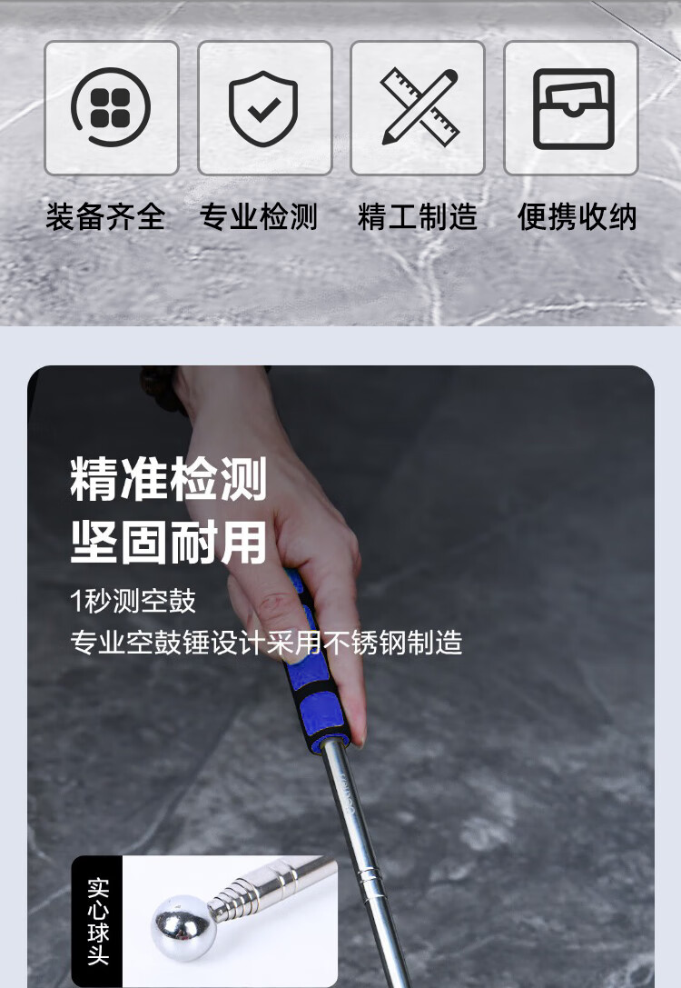 Factory No. 1 6-piece house inspection tool set to detect floor and wall tiles, empty drum hammer, marker, level ruler