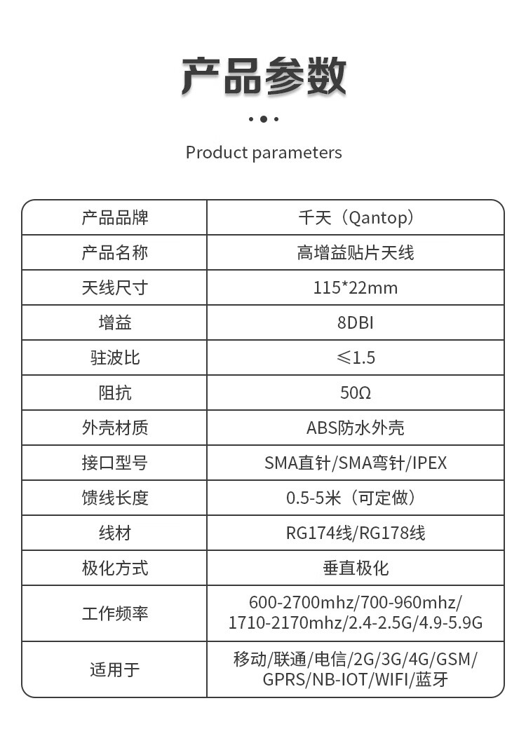 Qantop patch antenna high gain vehicle antenna 5G full network SMA straight head (inner needle) 3m QT-TP145