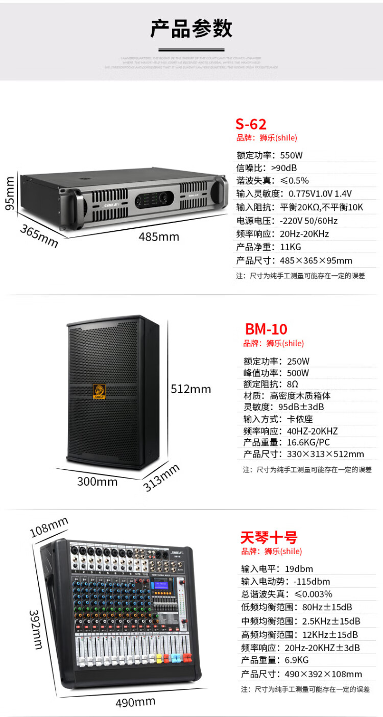 SHILE conference room audio package combination 10-inch stage performance speaker professional event mixer amplifier equipment S62+BM10+Tianqin No. 10