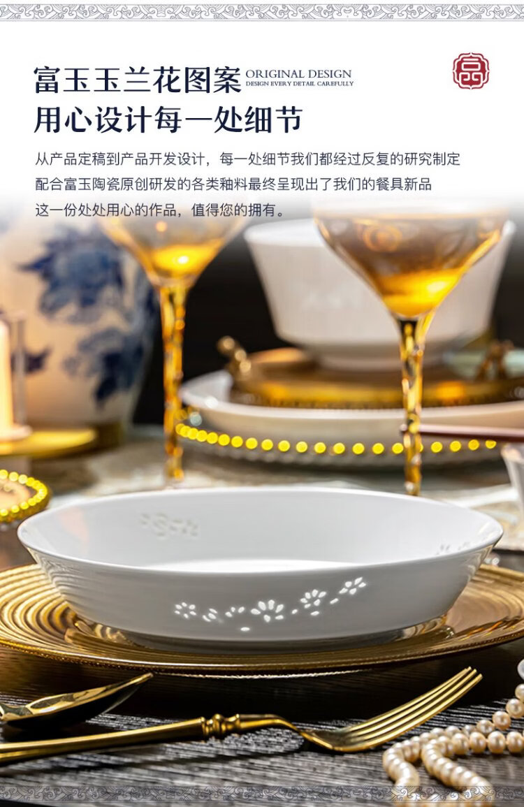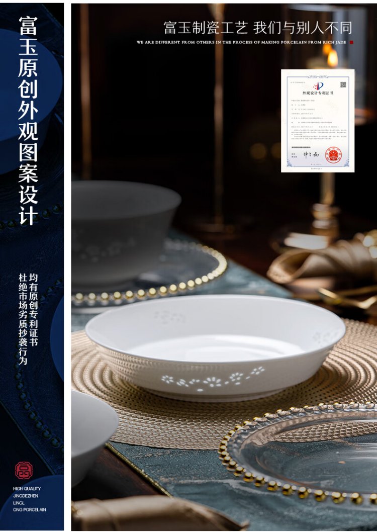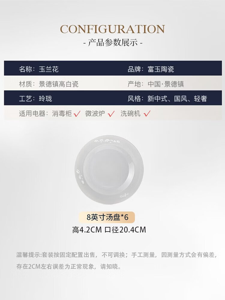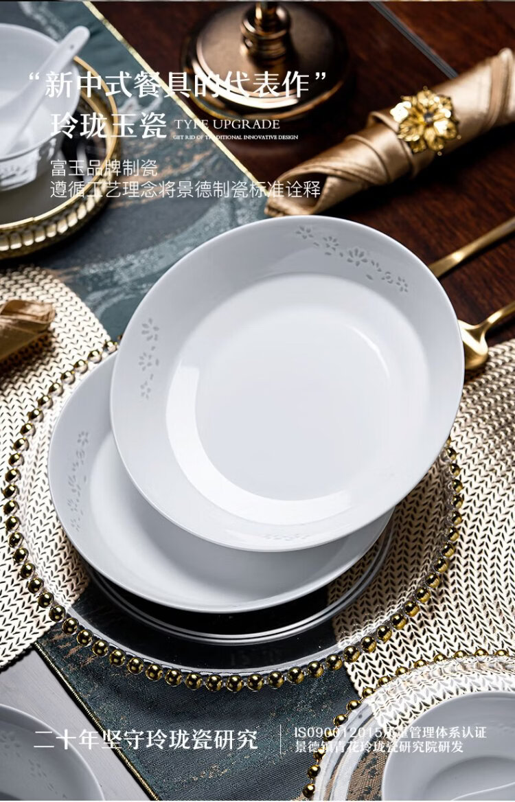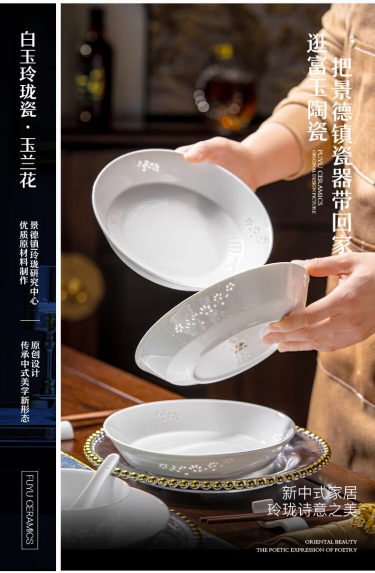 Fuyu ceramics Jingdezhen tableware pure white Chinese exquisite plate home moving gift Magnolia soup plate 6 pieces