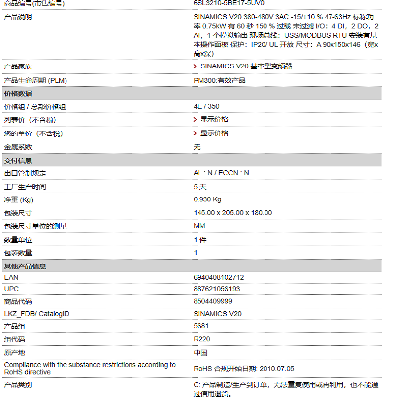 Siemens inverter (SIEMENS) 6SL3210-5BE17-5UV0 v20 0.75kw spot