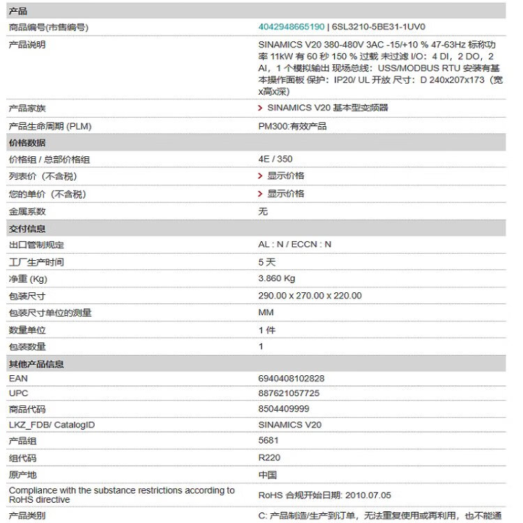 Siemens inverter (SIEMENS) 6SL3210-5BE31-1UV0 v20 11kw spot