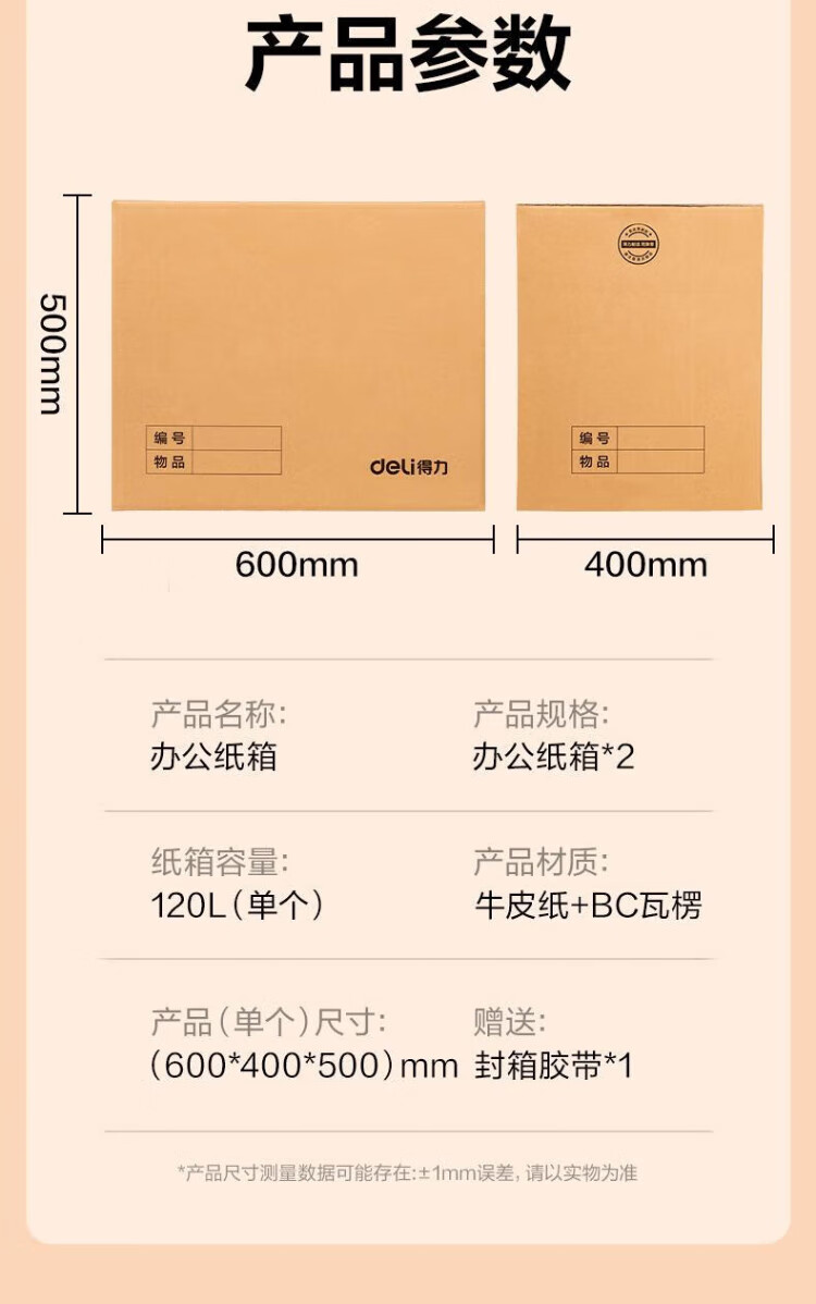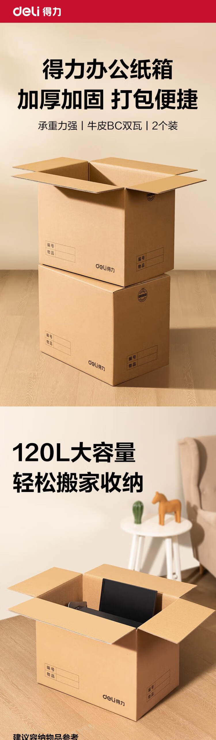 Deli moving carton thickened extra large packing box express packing box storage carton 60*40*50cm no buckle hand 2 pack + sealing tape