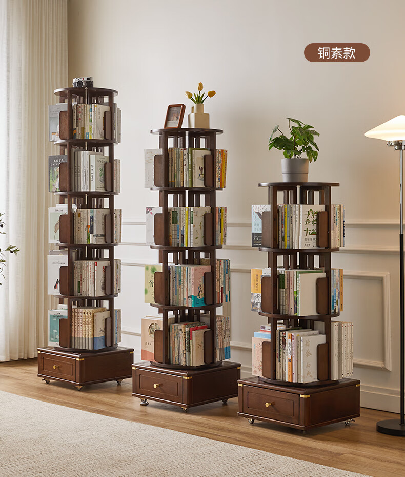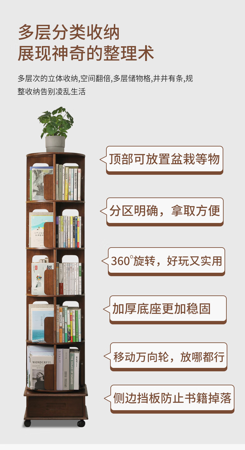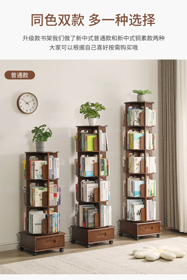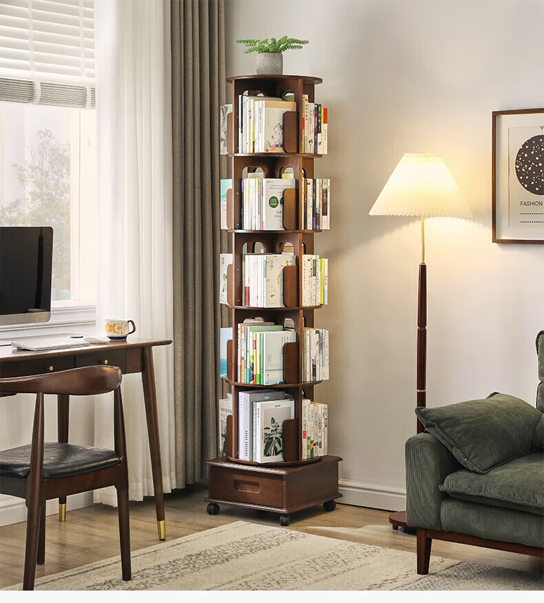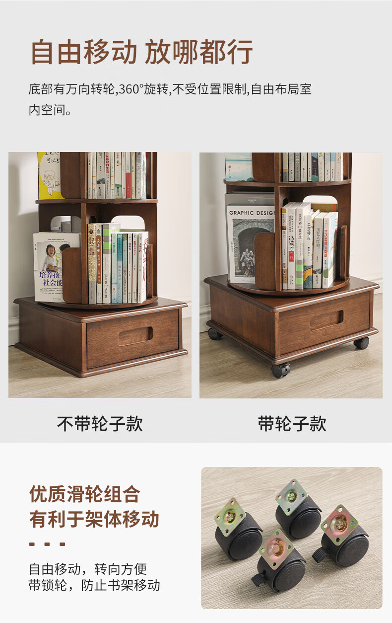 Jiayi rotating bookshelf floor-standing storage rack solid wood bookcase with wheels removable shelf floor-standing drawer storage rack
