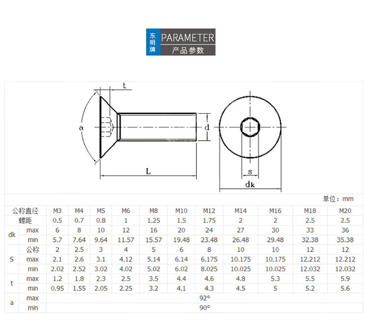 TONG Dongming 304 stainless steel hexagon countersunk head machine screws DIN7991 M3-M6 M3 *10 (100 pieces/bag)