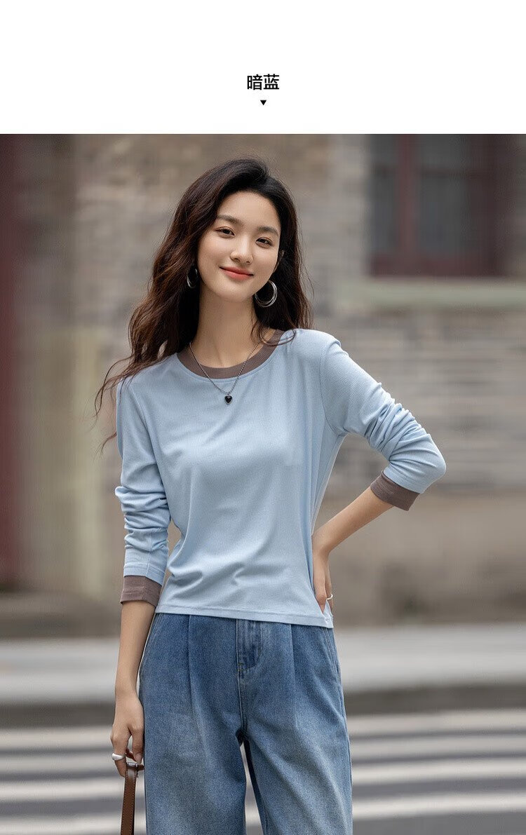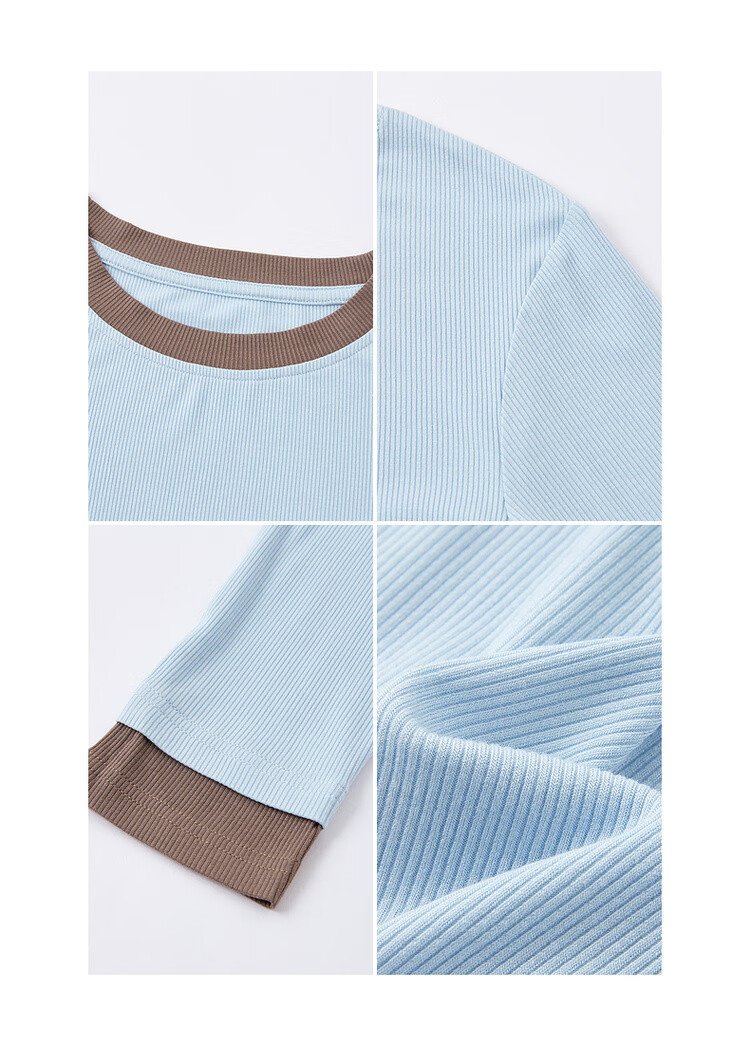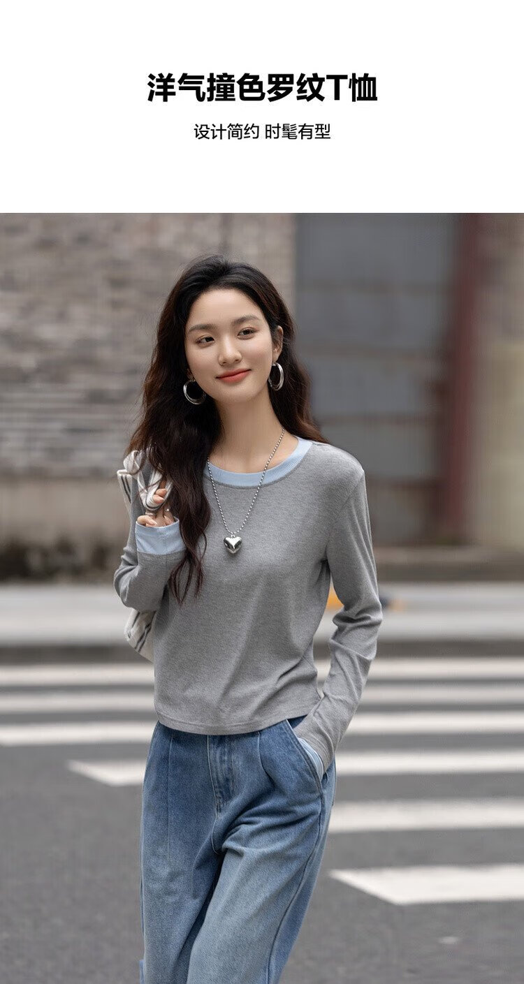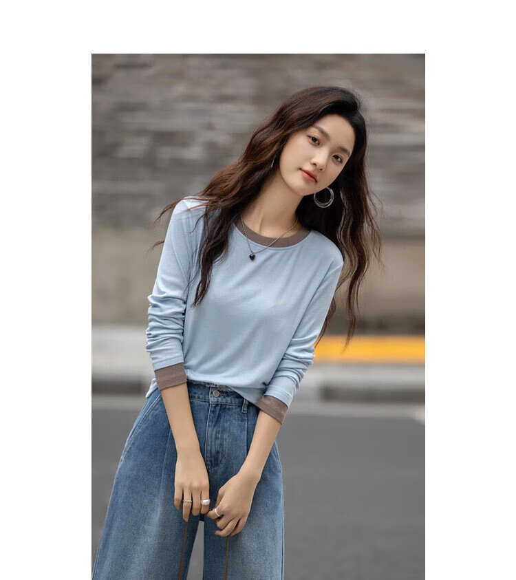 Demana Light French Group Favor Spring Korean Style Round Neck Contrast Color Ribbed Long Sleeve T-Shirt Women's Comfortable Hidden Meat Women's T-Shirt