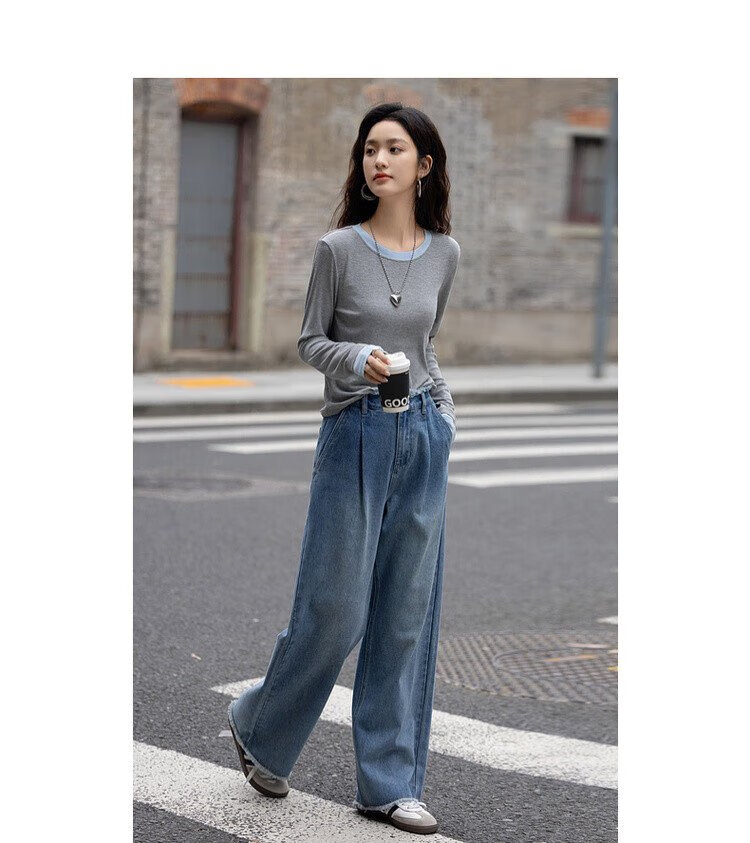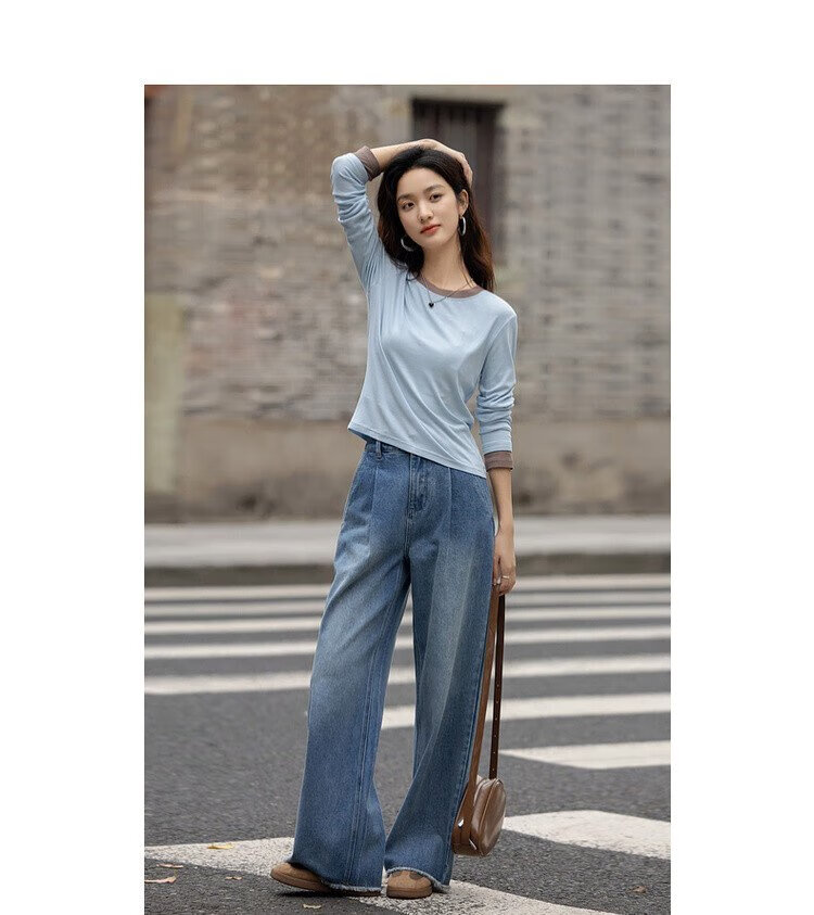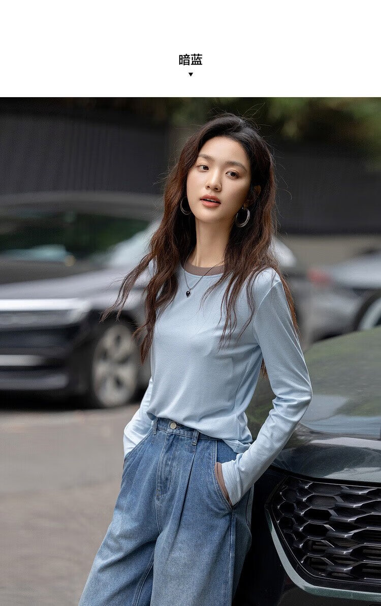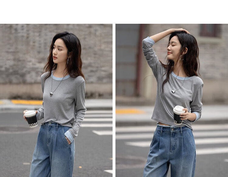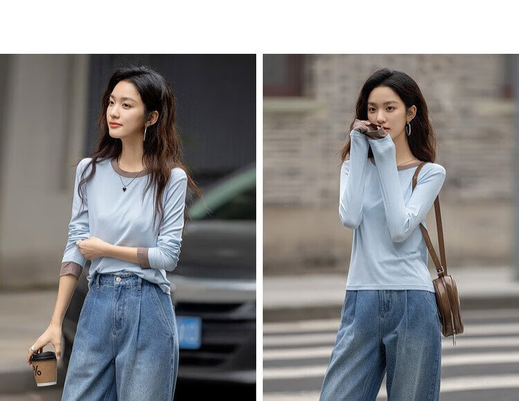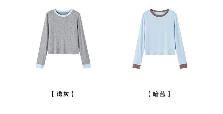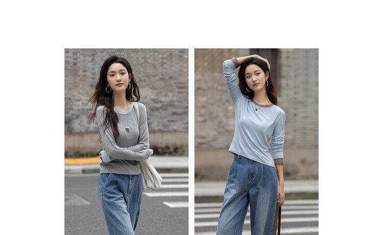Demana Light French Group Favor Spring Korean Style Round Neck Contrast Color Ribbed Long Sleeve T-Shirt Women's Comfortable Hidden Meat Women's T-Shirt