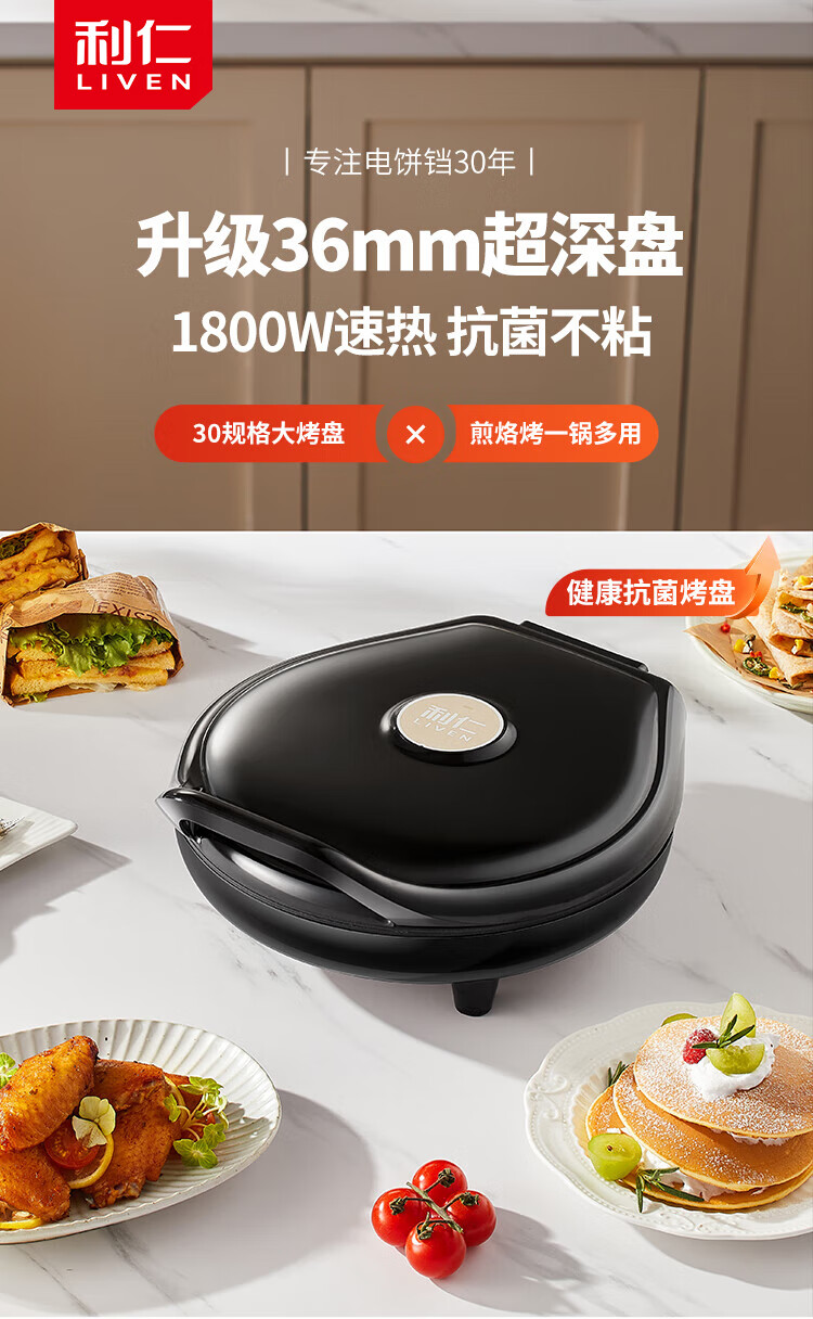 Liven electric baking pan for household use 36mm deepened 1800W high power double-sided heating antibacterial electric pancake pan pancake pan pancake pan barbecue pan sandwich breakfast machine LR-J3076