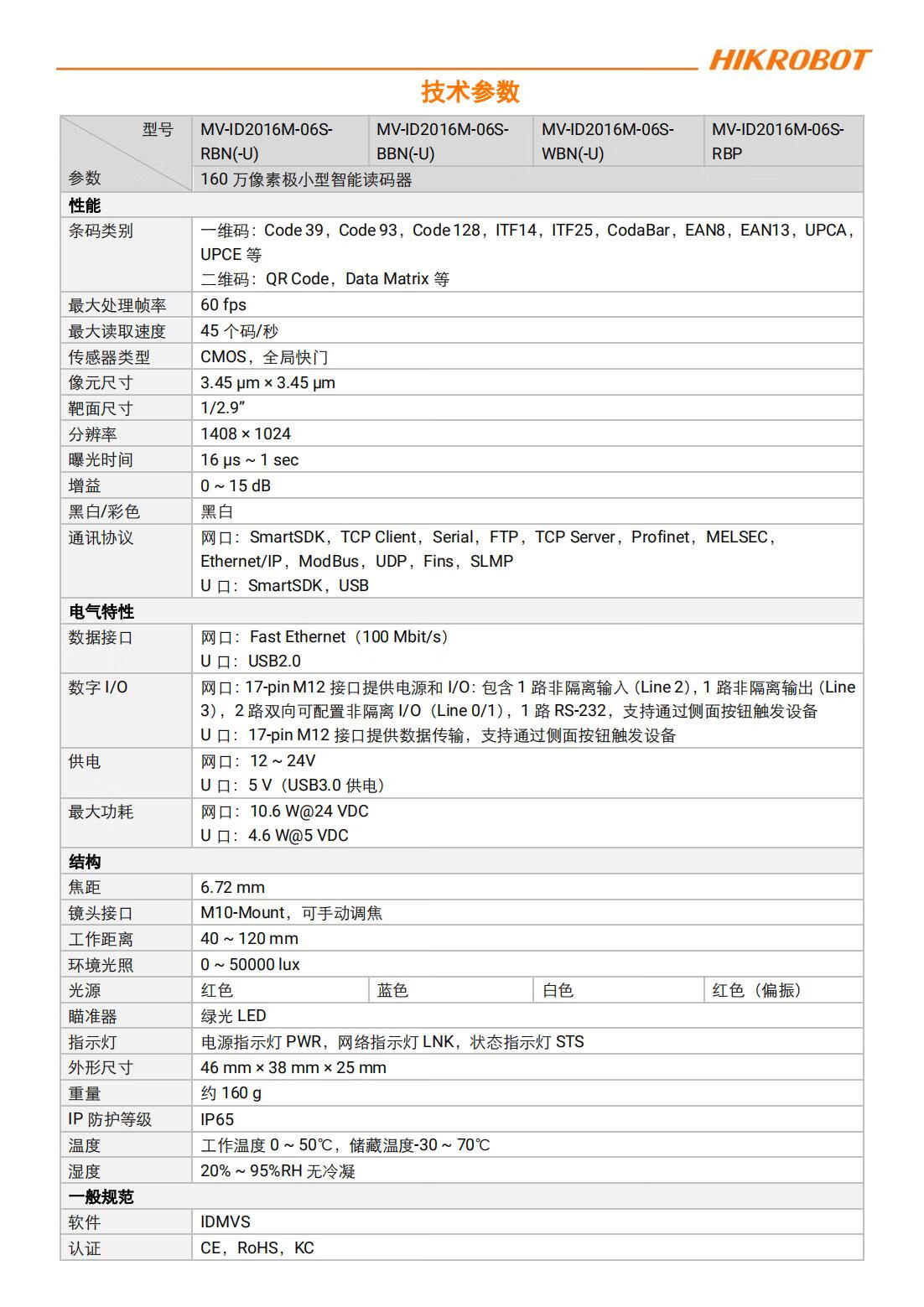 Hikvision Robot Extremely Small Intelligent Code Reader 1.6 Megapixel White Light Global Shutter M10-Mount Black and White MV-ID2016M-06S-WBN