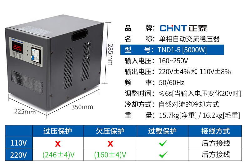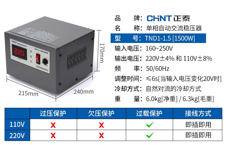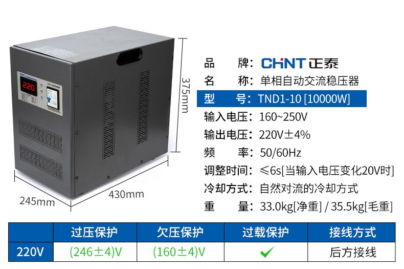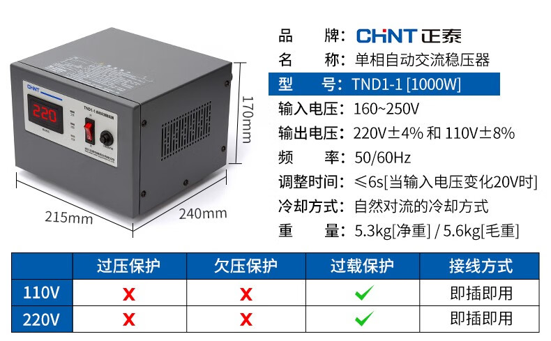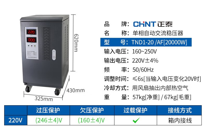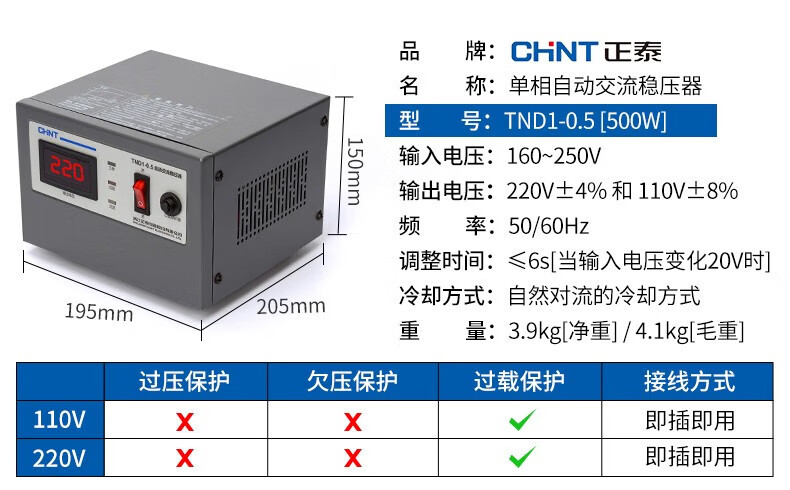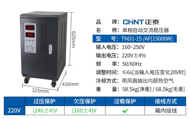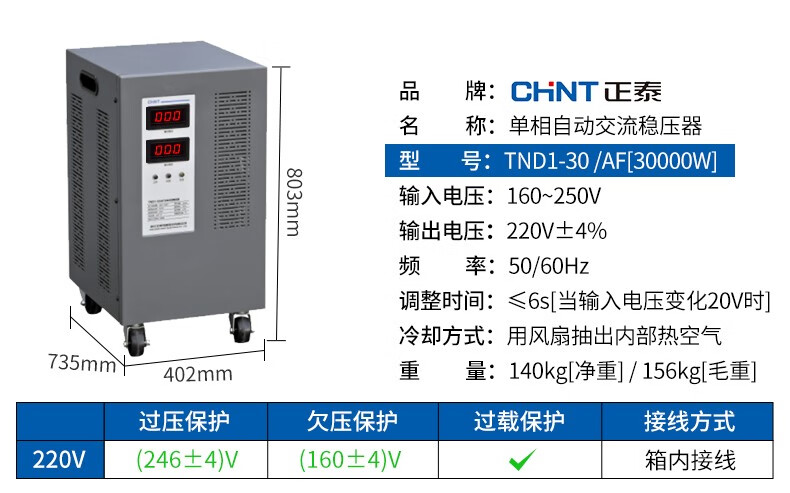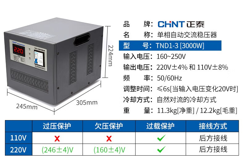 Chint (CHNT) voltage stabilizer 220V AC single-phase automatic AC voltage stabilizer air conditioner computer refrigerator household appliances voltage stabilizer industrial high power TND1-3KW 3000W