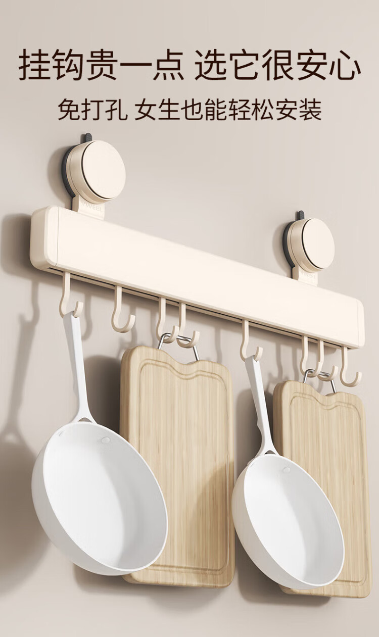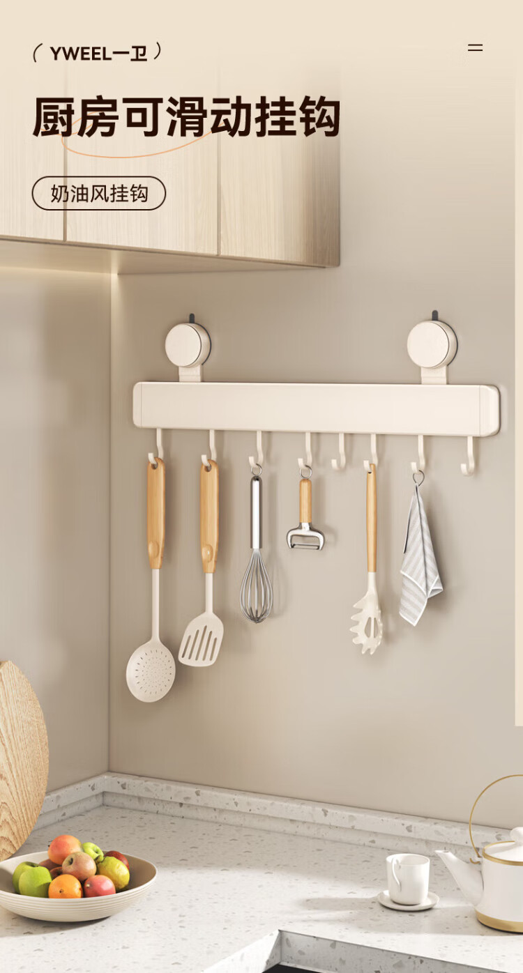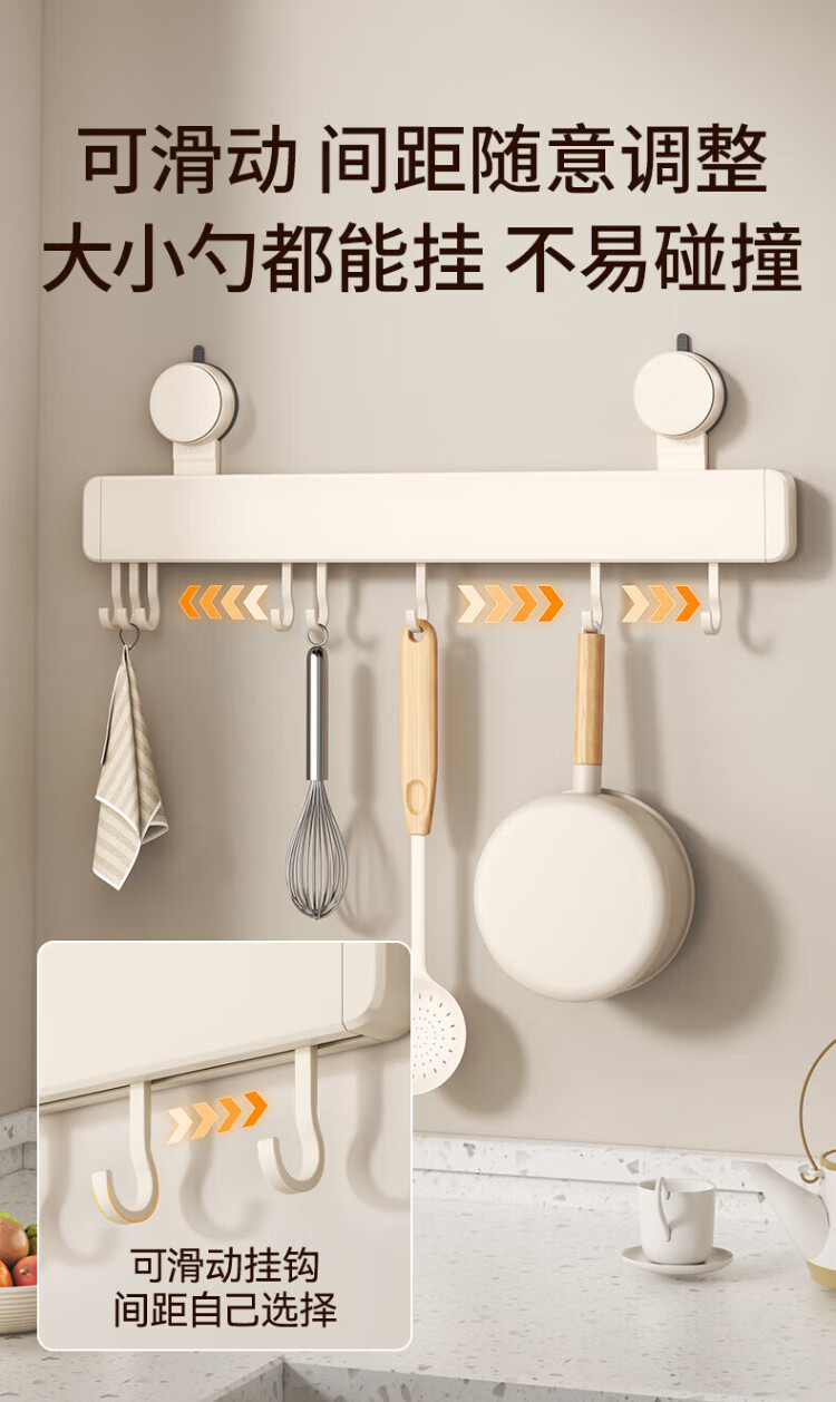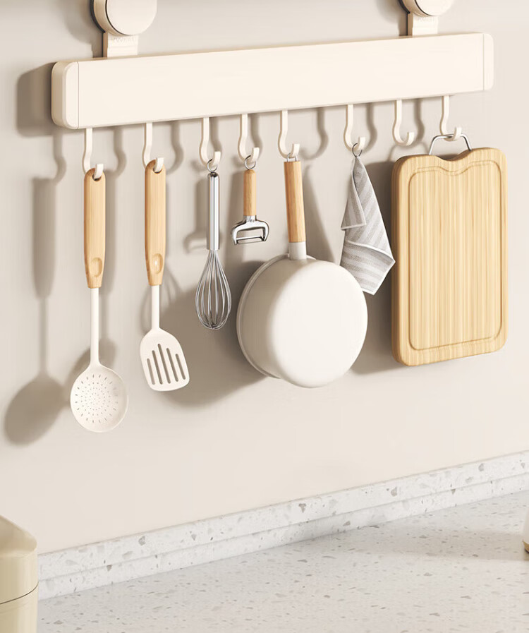 Yweel Milk White Suction Cup Kitchen Hook Rack Hanging Rod Wall-mounted Kitchen Utensil Rack Spoon Shovel Rack Multi-Function