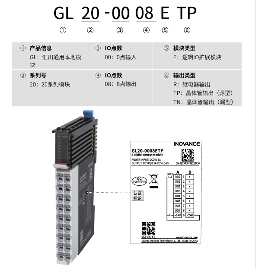Inovance GL20 series GL20-0008ETP 8-channel digital transistor PNP output module