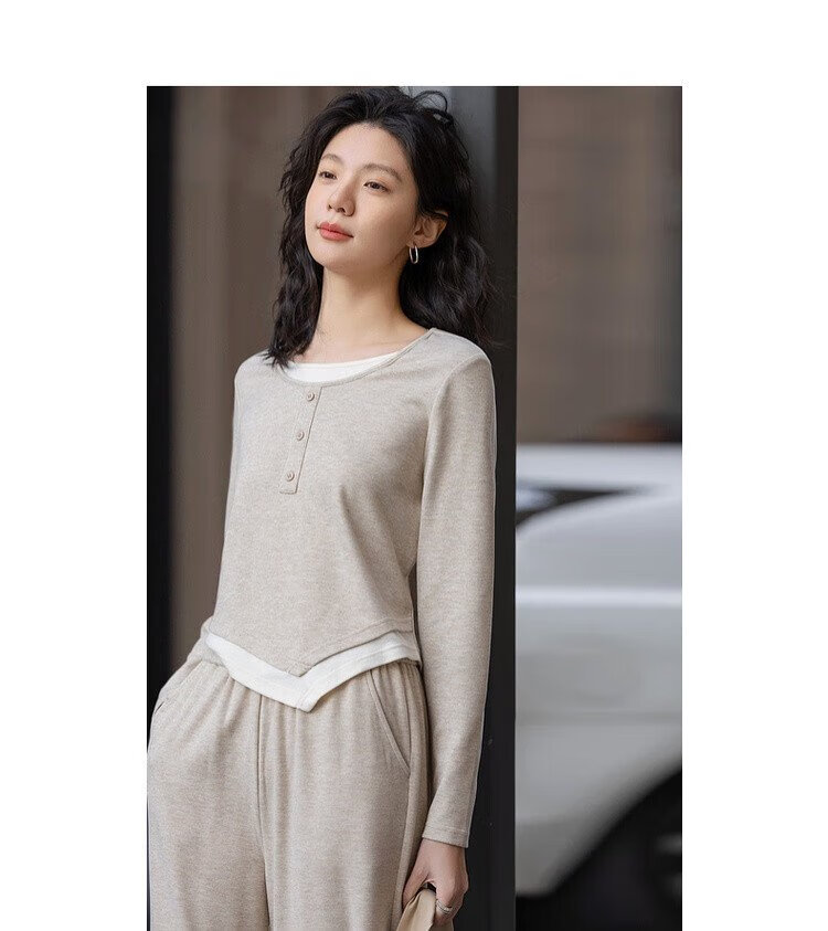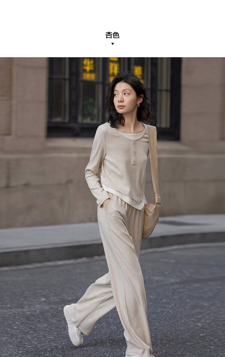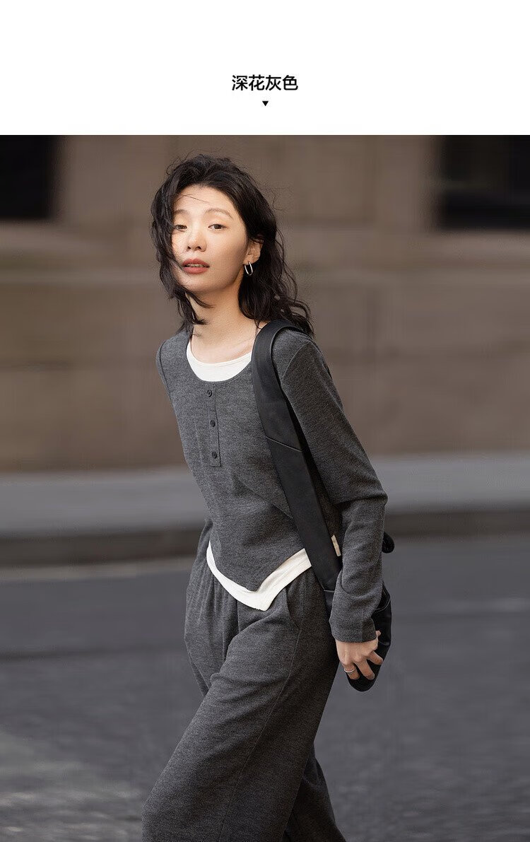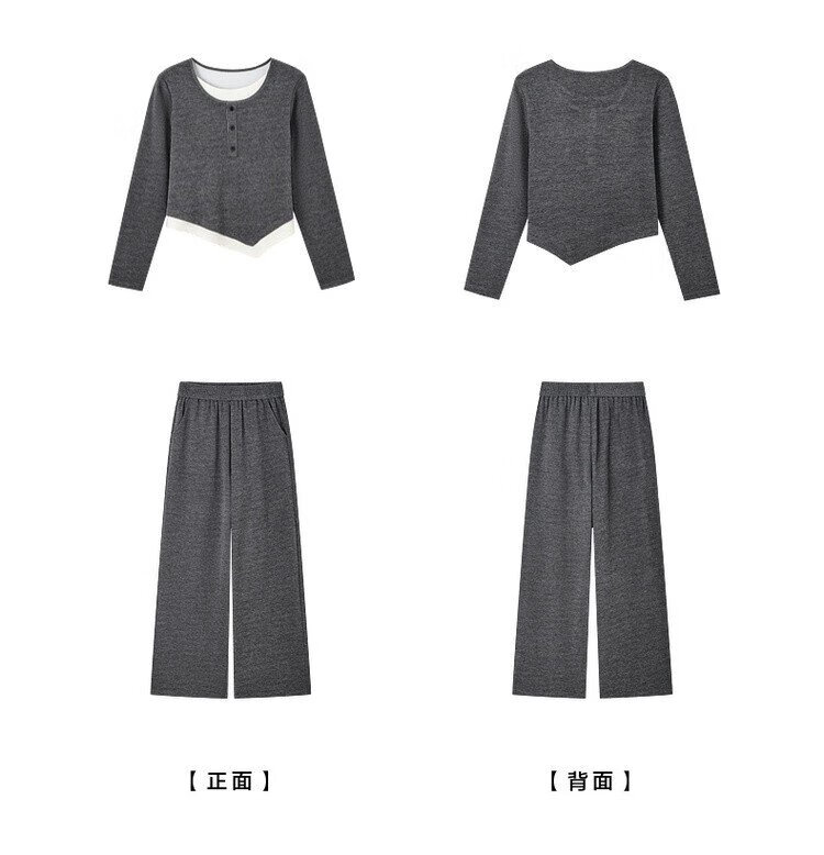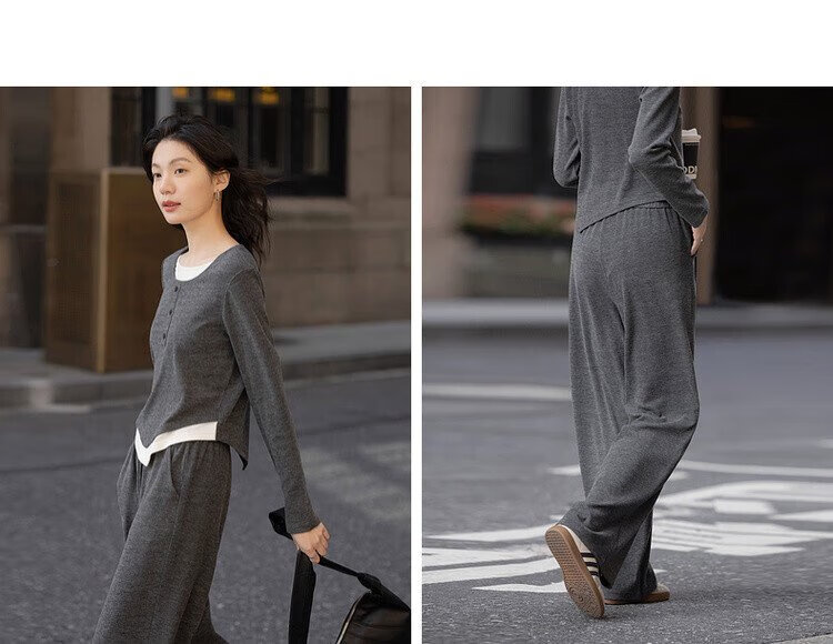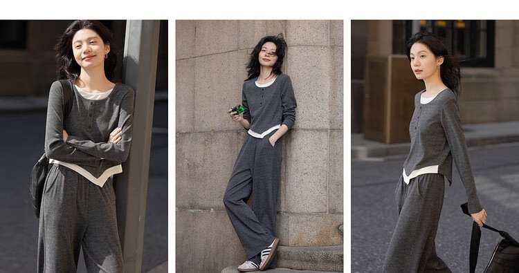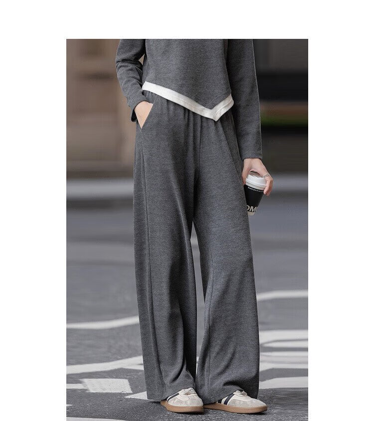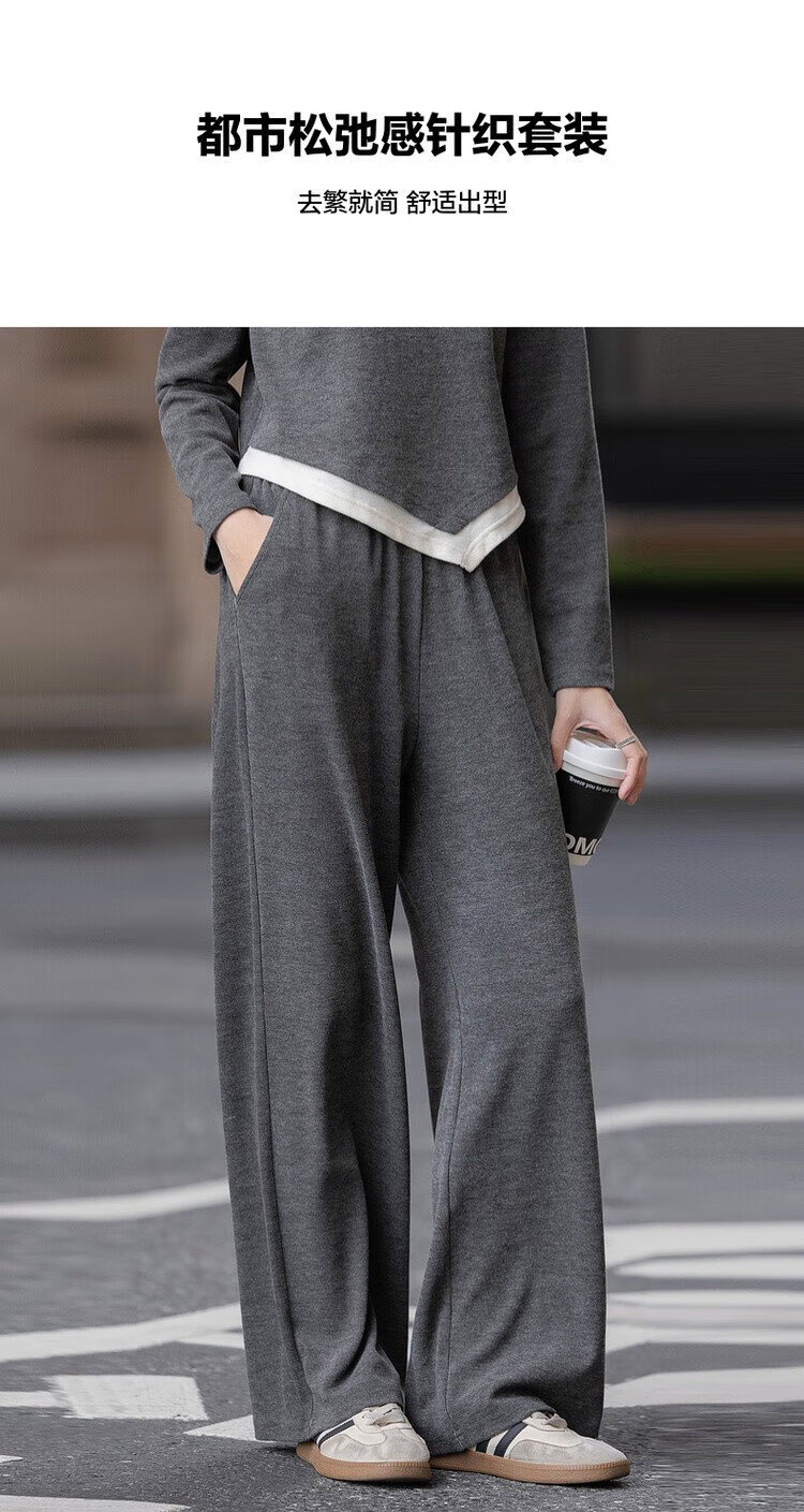 Demana Gray Suit Spring Lazy Long Sleeve Top Elastic Waist Straight Pants Covering Women's Knitted Two-piece Set