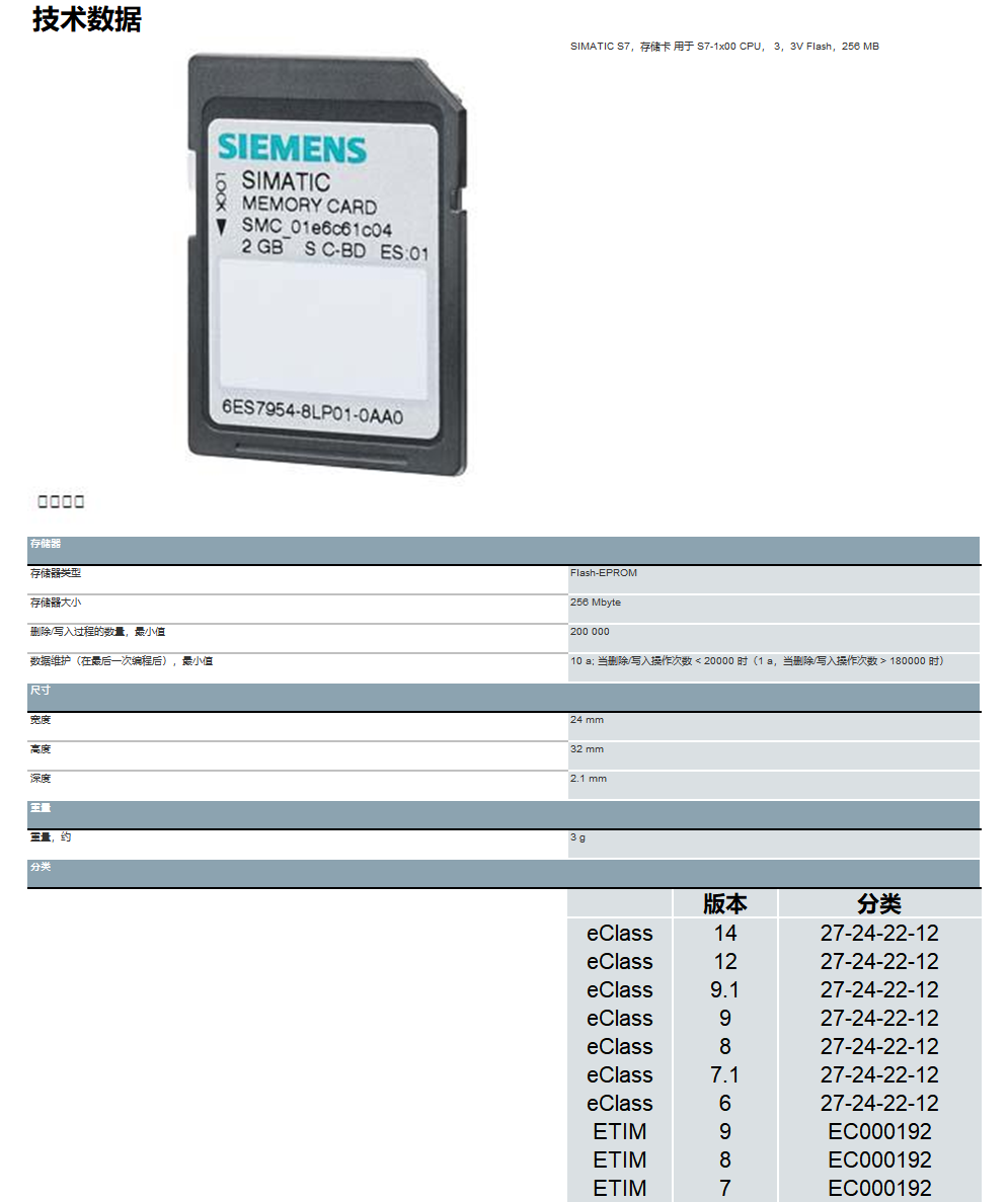 Siemens 6ES7954-8LL04-0AA0 SIMATIC S7, memory card for S7-1x00 CPU, 3,3V Flash, 256 MB