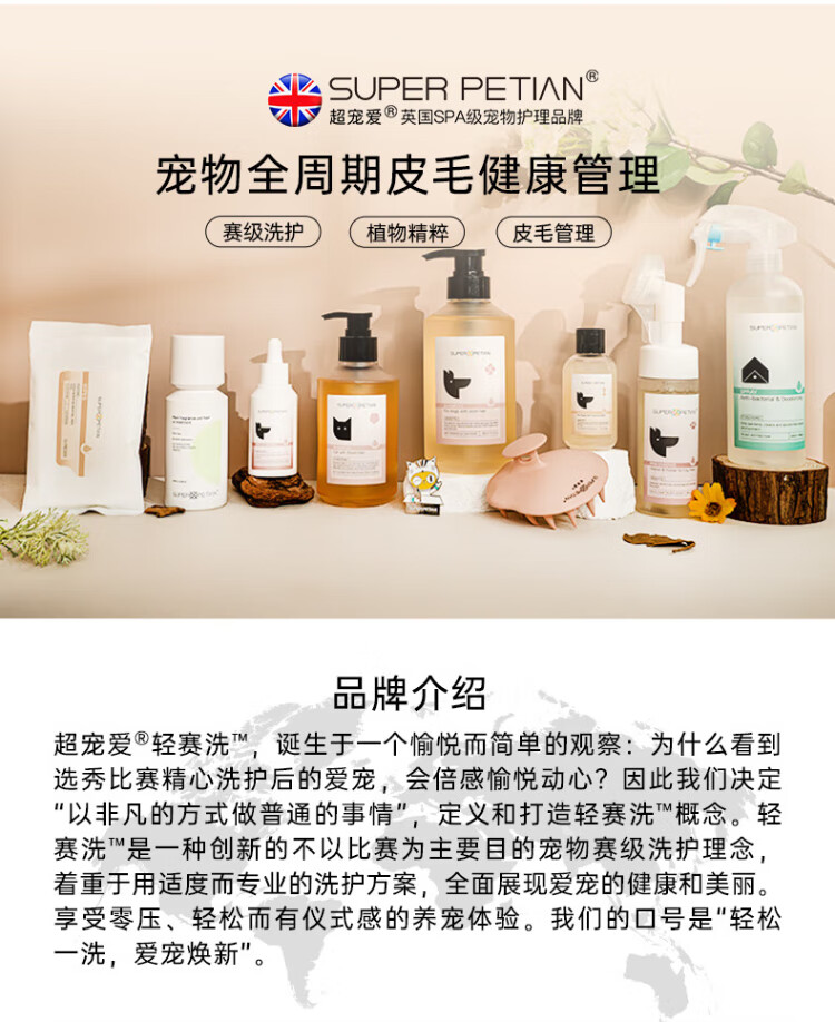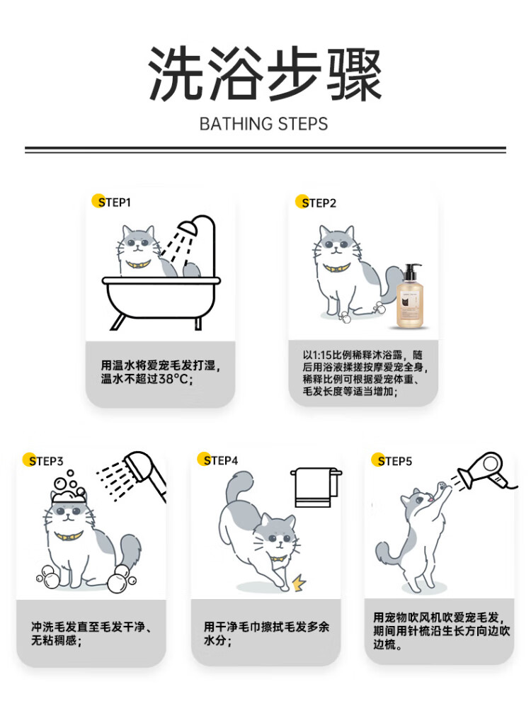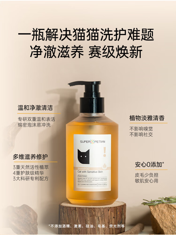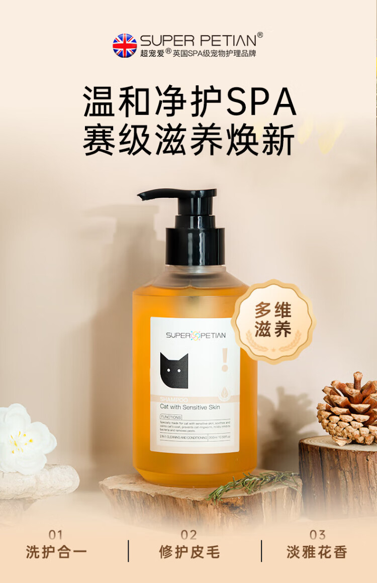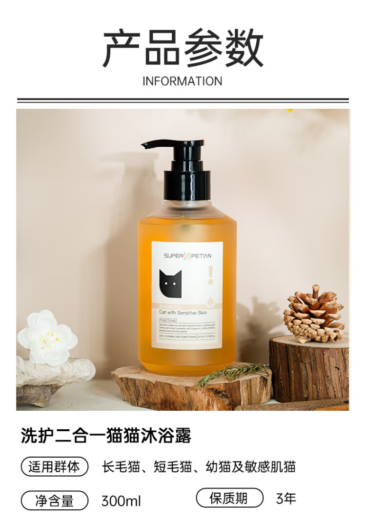 Super pampering cat shower gel, suitable for both young and old cats and dogs. Special for long-haired cats. Two-in-one shampoo and conditioner.