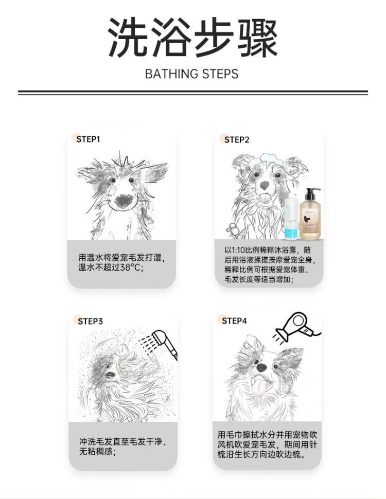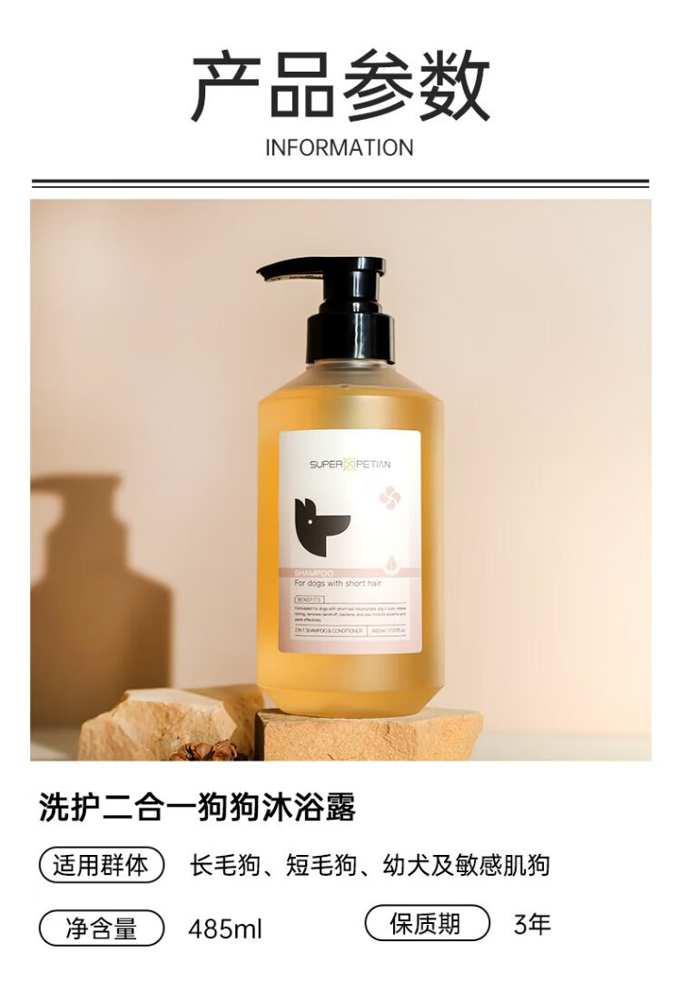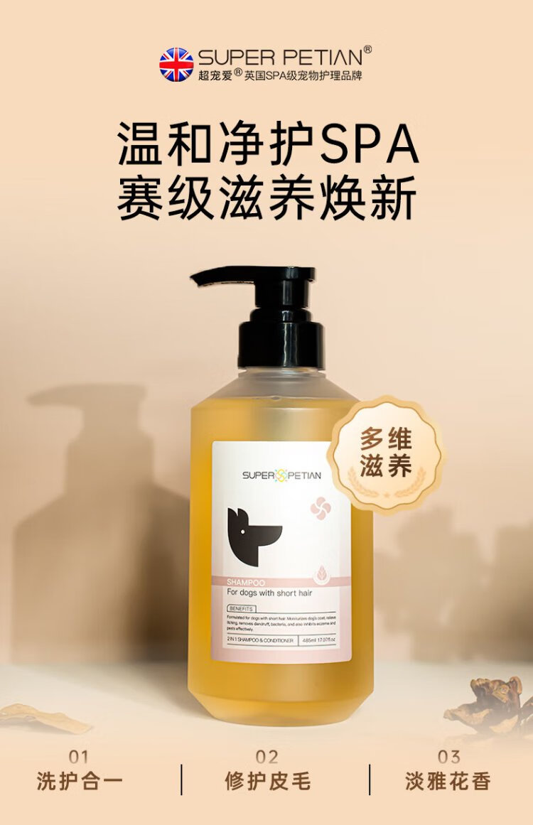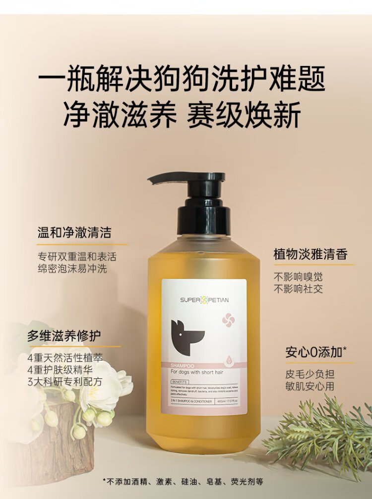 Super pampering dog shower gel. Pet-specific shower gel. Universal for adults and puppies. Special for short-haired dogs.