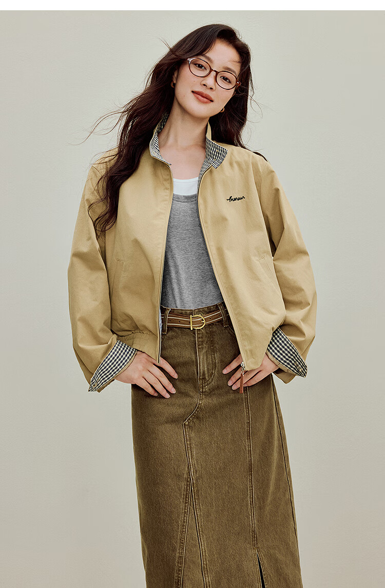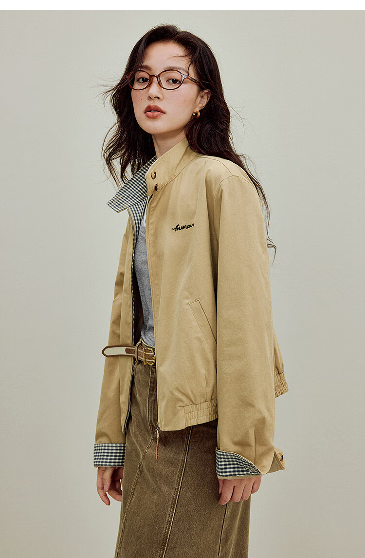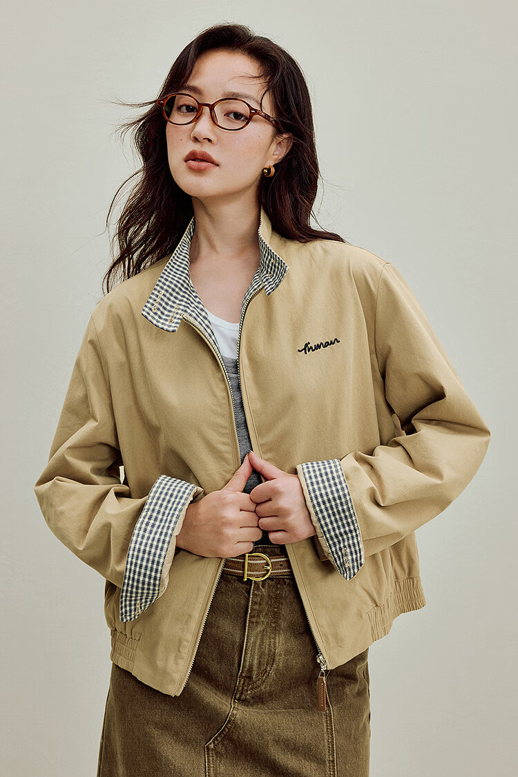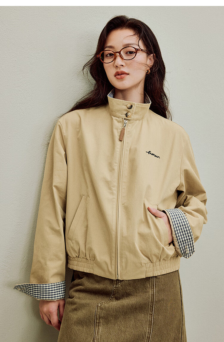 Inman Contrast Color Plaid Stand Collar Pure Cotton Embroidered Jacket 2025 Autumn Women's New Jacket Top Khaki M