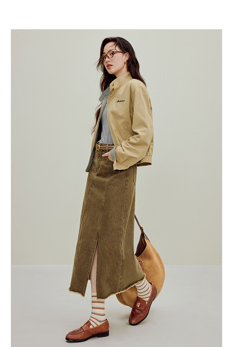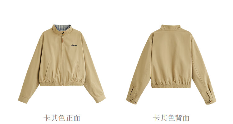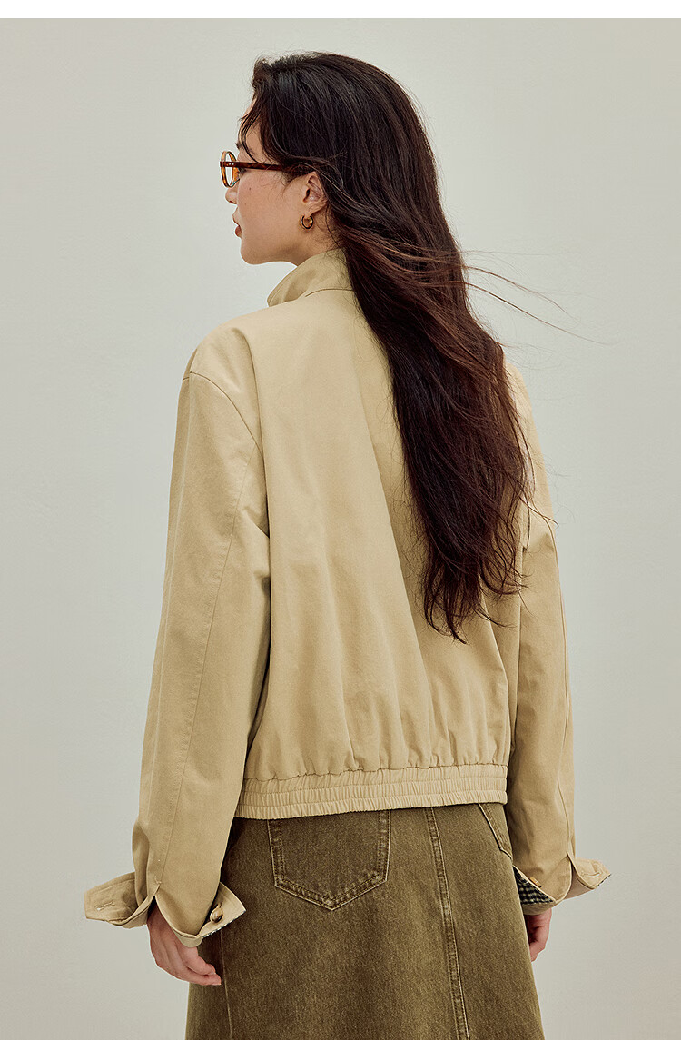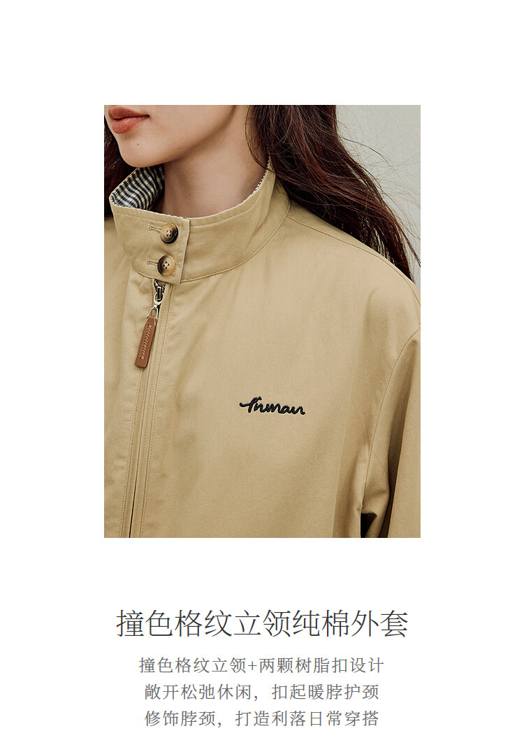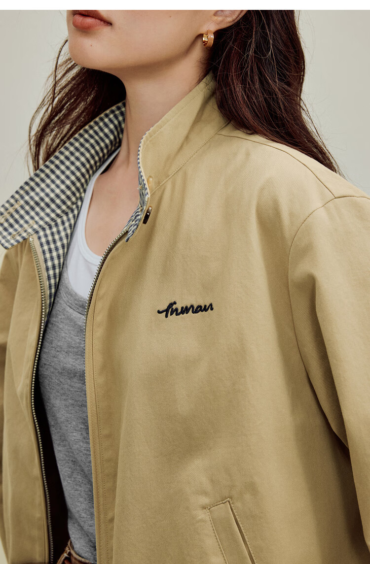 Inman Contrast Color Plaid Stand Collar Pure Cotton Embroidered Jacket 2025 Autumn Women's New Jacket Top Khaki M