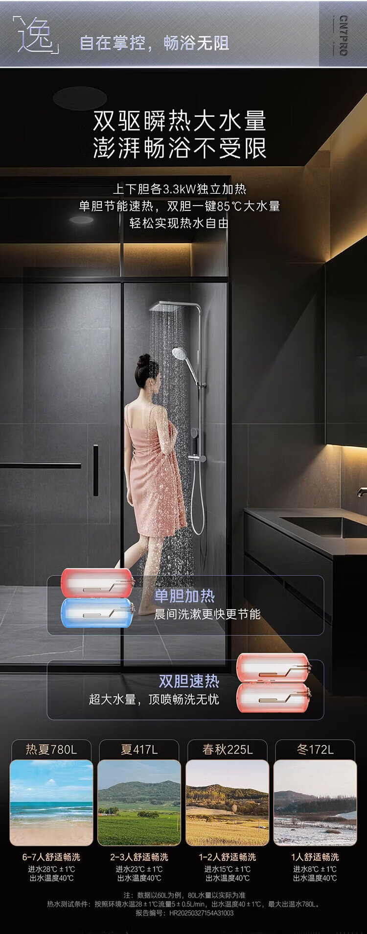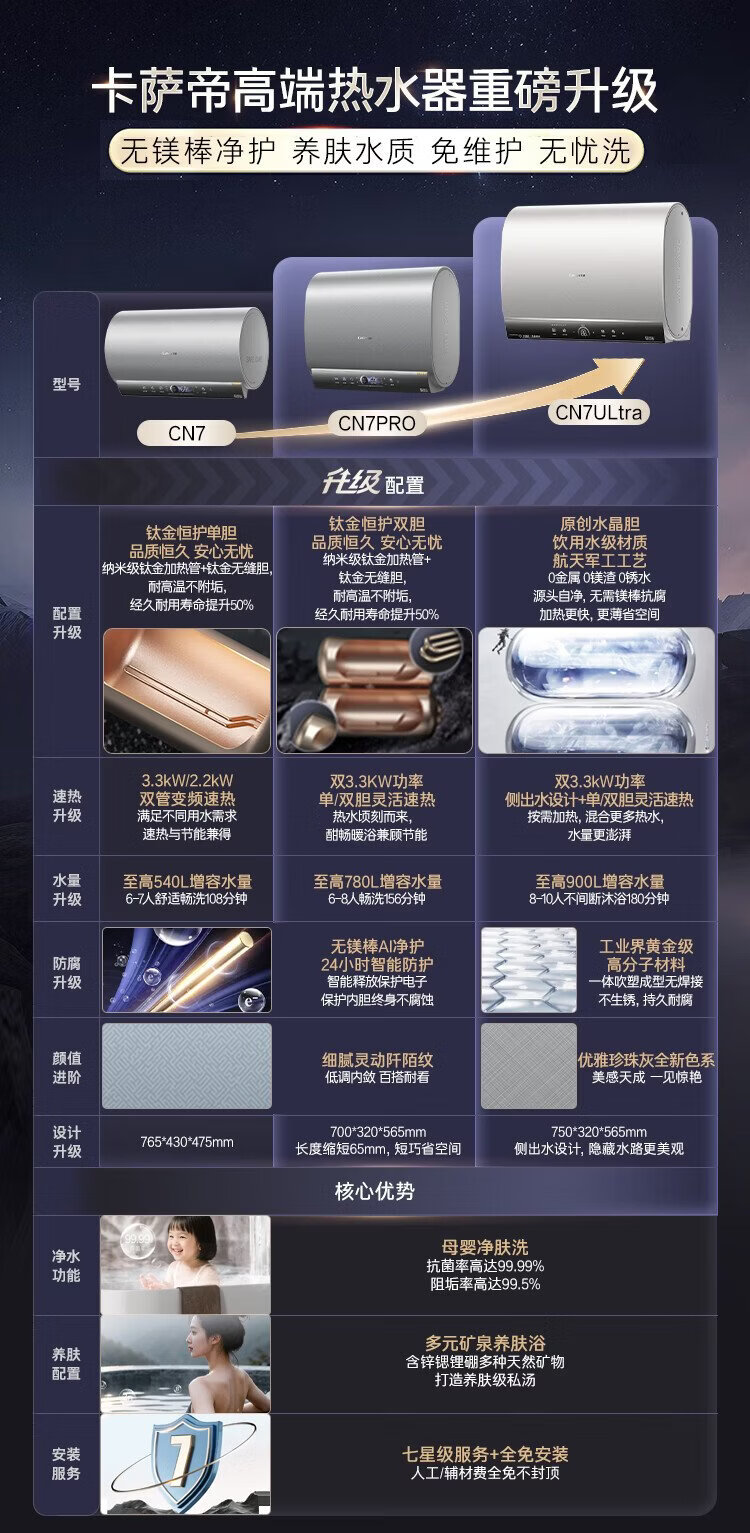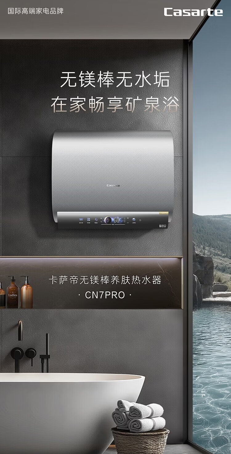 Casarte (Casarte) national subsidy 15% magnesium rod-free CN7PRO 60-liter double-gallon flat barrel electric water heater ultra-thin 3.3kw fast heating first-class energy efficiency fast heating Jingdong self-operated door-to-door installation