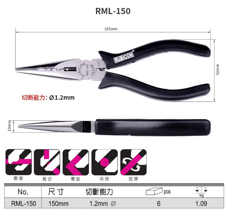 Robin Hood (RUBICON) RML-150 needle nose pliers multi-purpose long nose pliers multi-purpose needle nose pliers Japanese style 6 inches 150mm